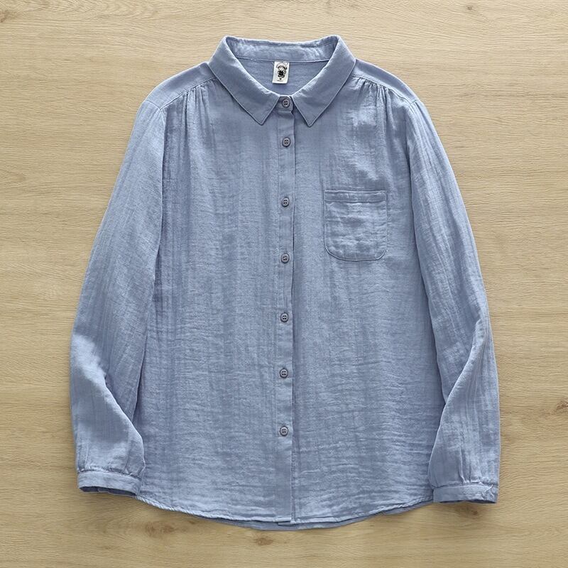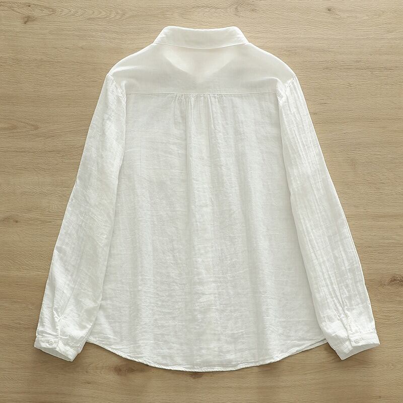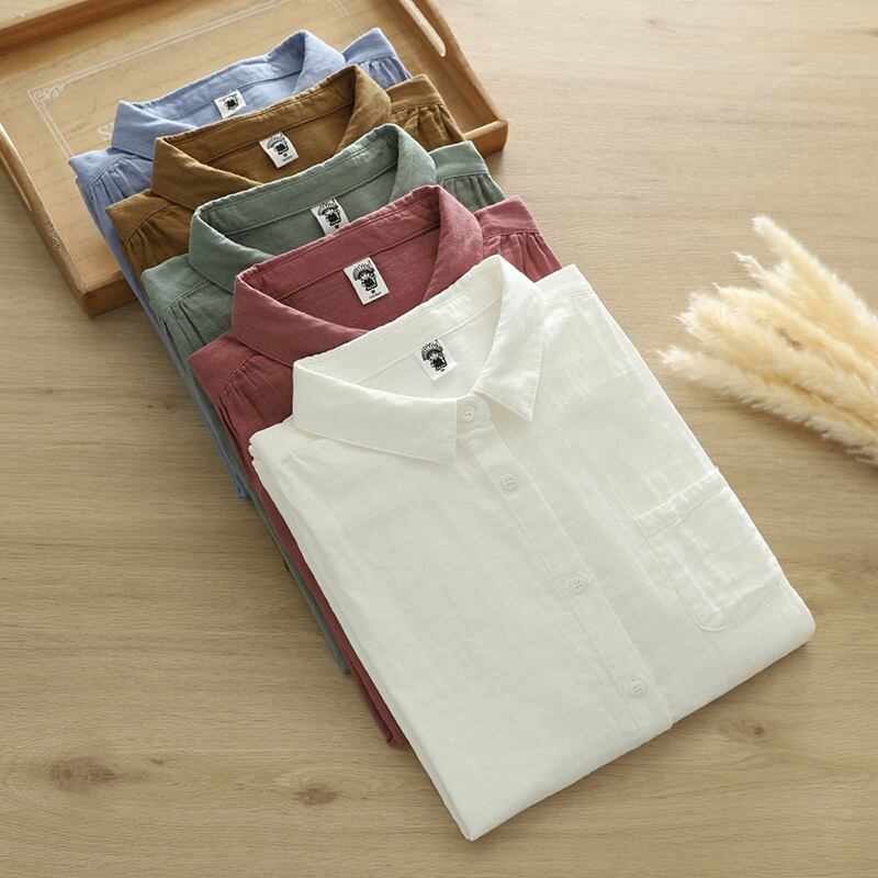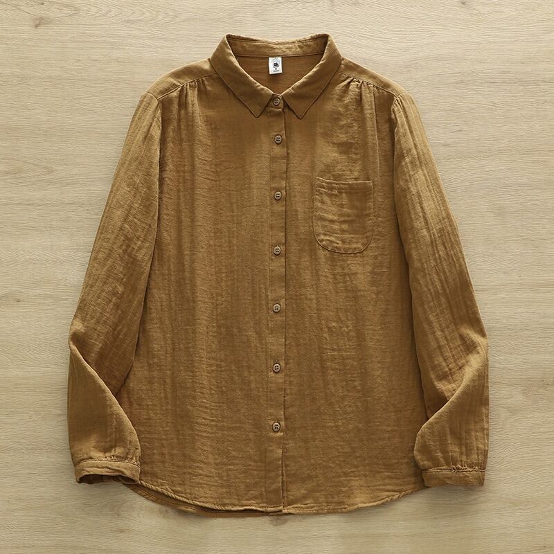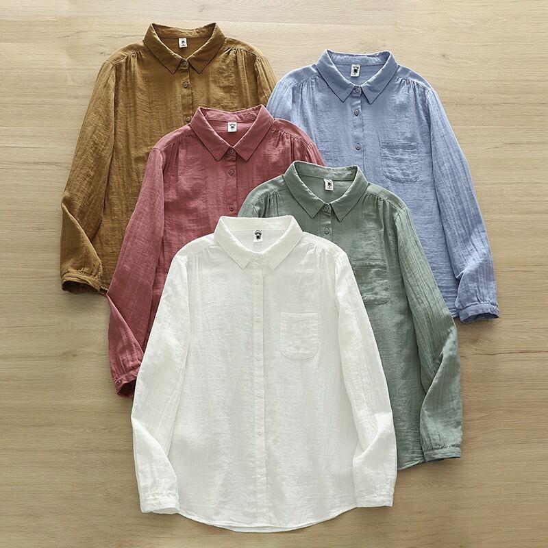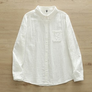 襟付きで長袖のストレートシルエットが特徴的なこのシャツブラウスです。