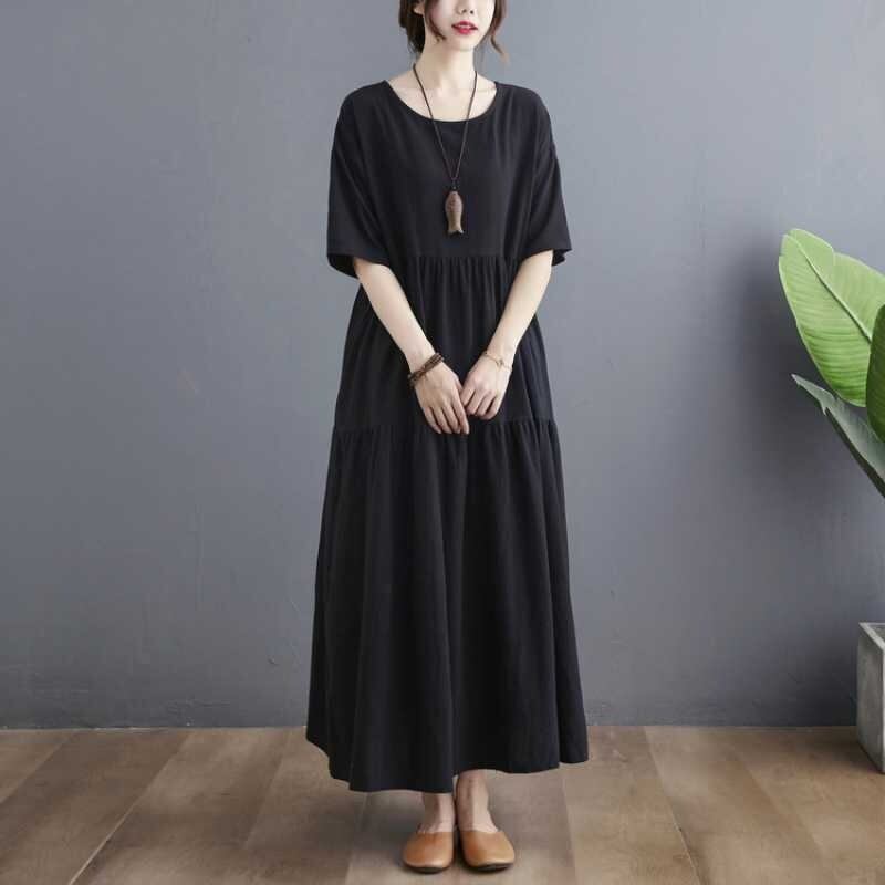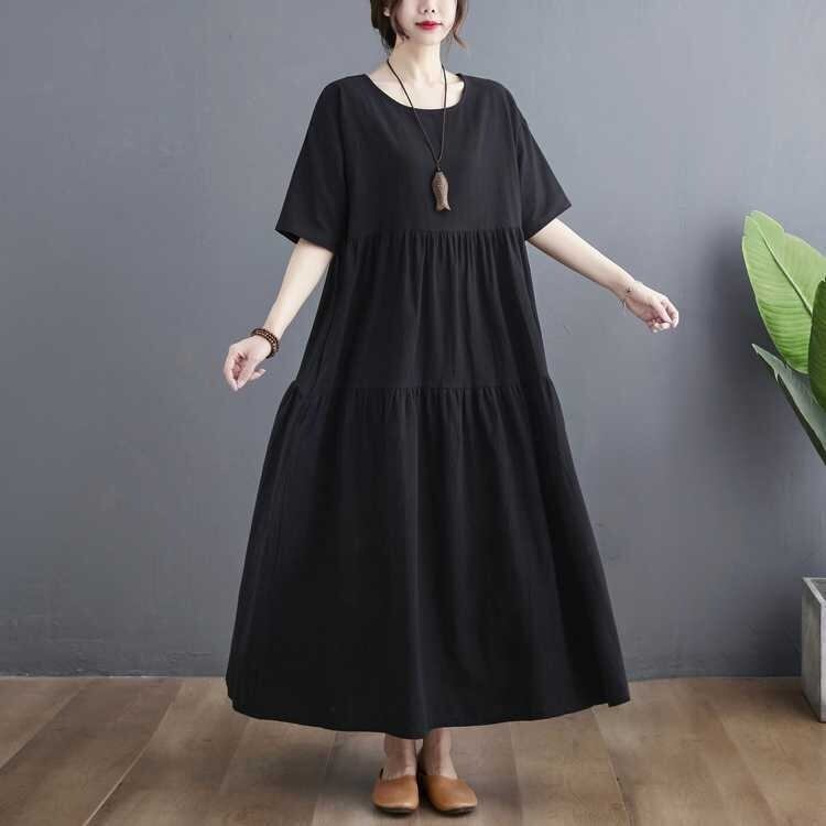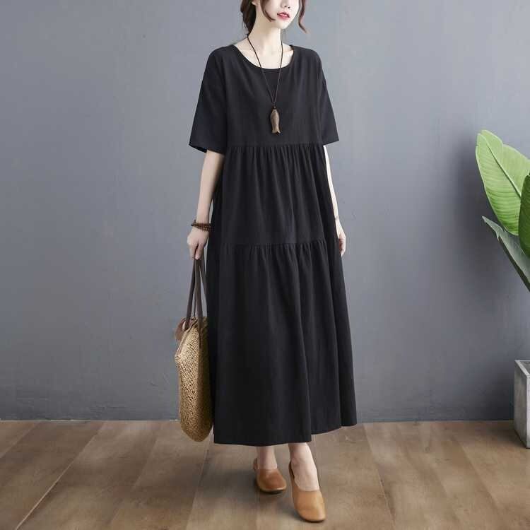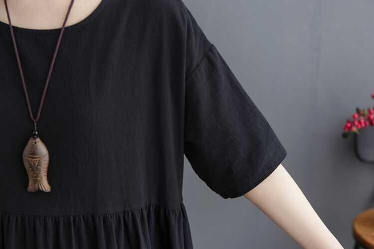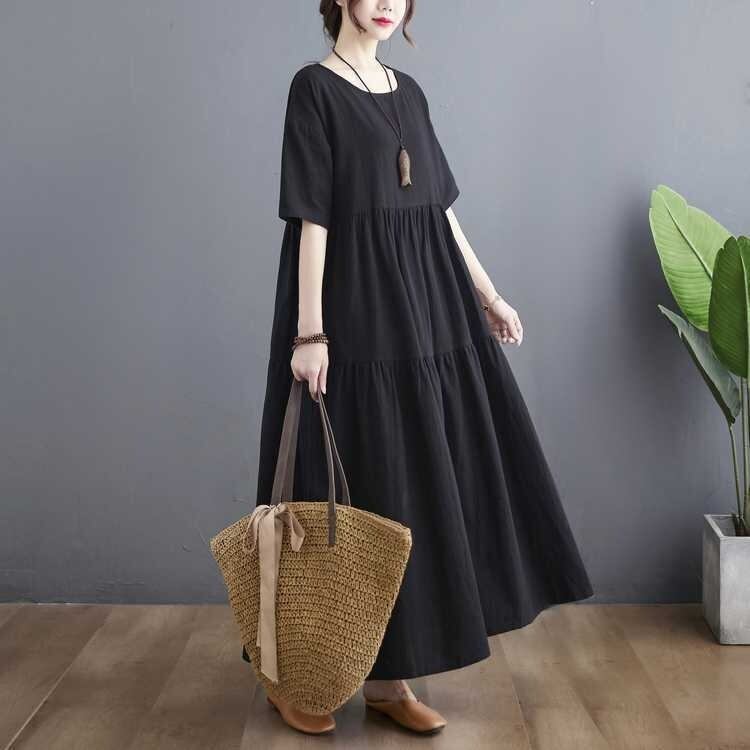 フレアデザインとロング丈、5分袖のクルーネックがふんわりとしたシルエットを優雅に演出します。