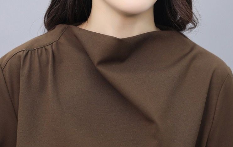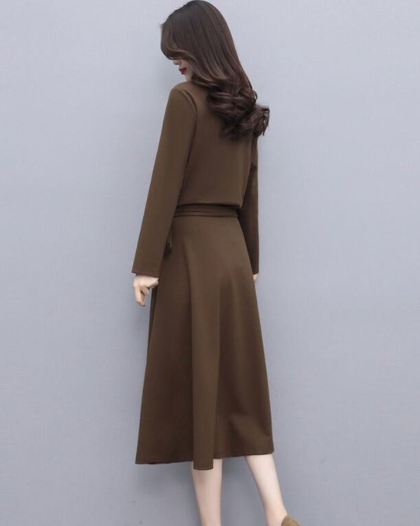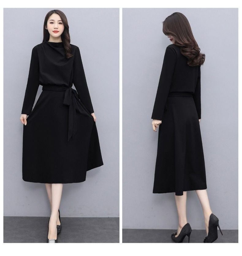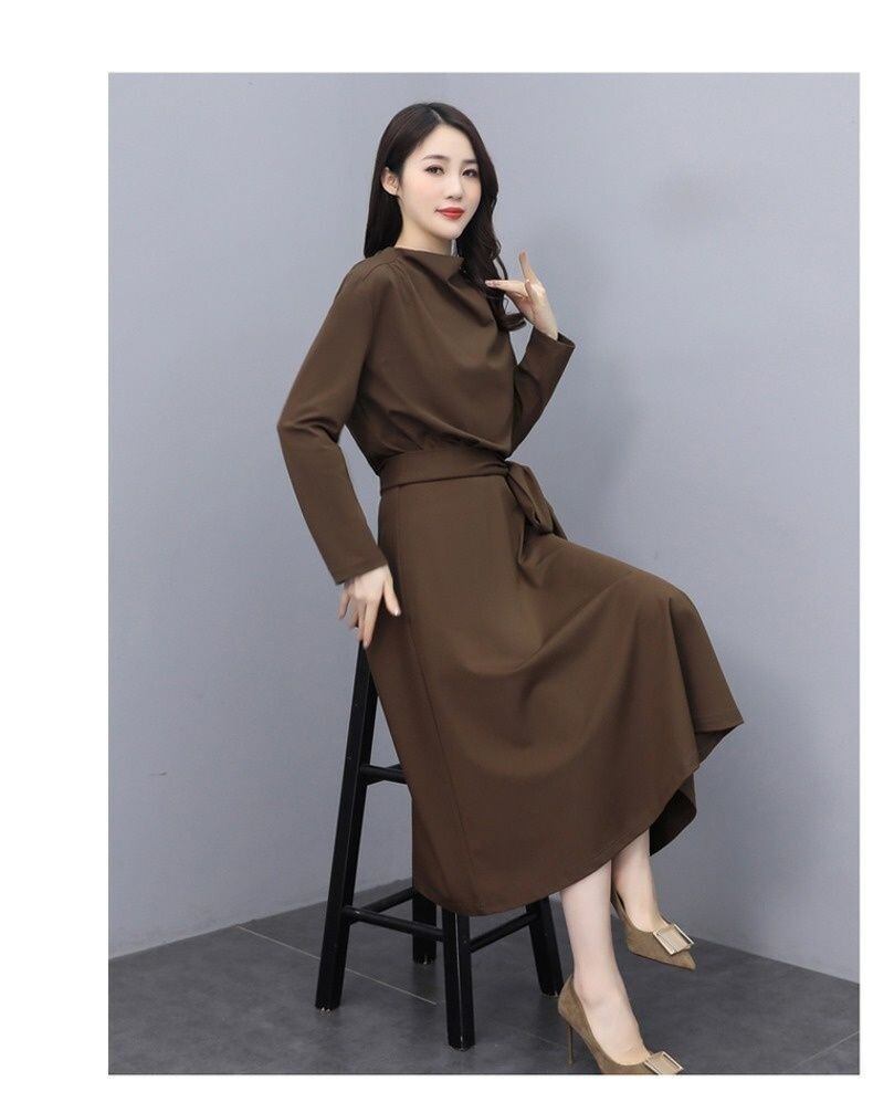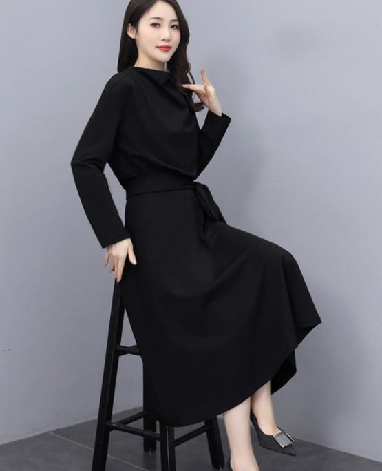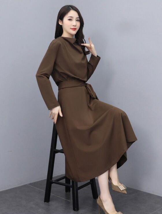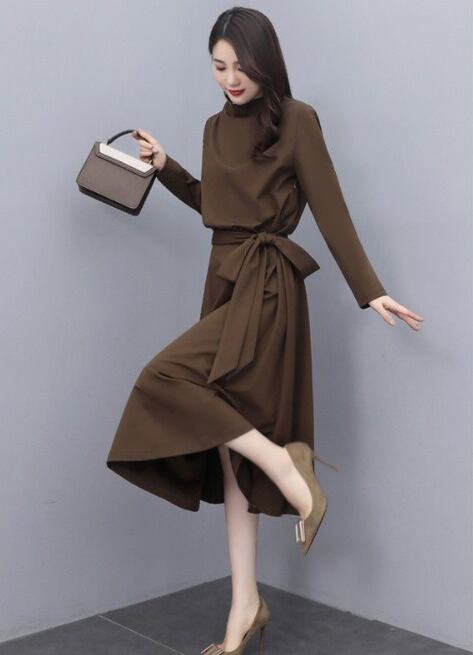 フレアシルエットとハイネックの組み合わせが美しく上品なスタイルを演出します。