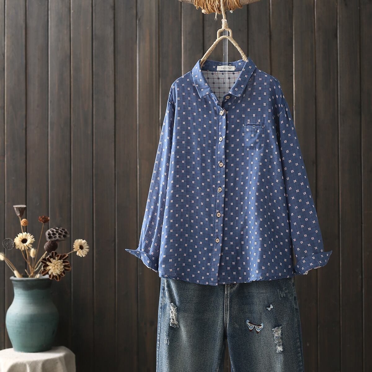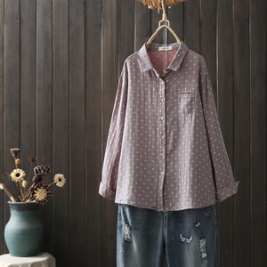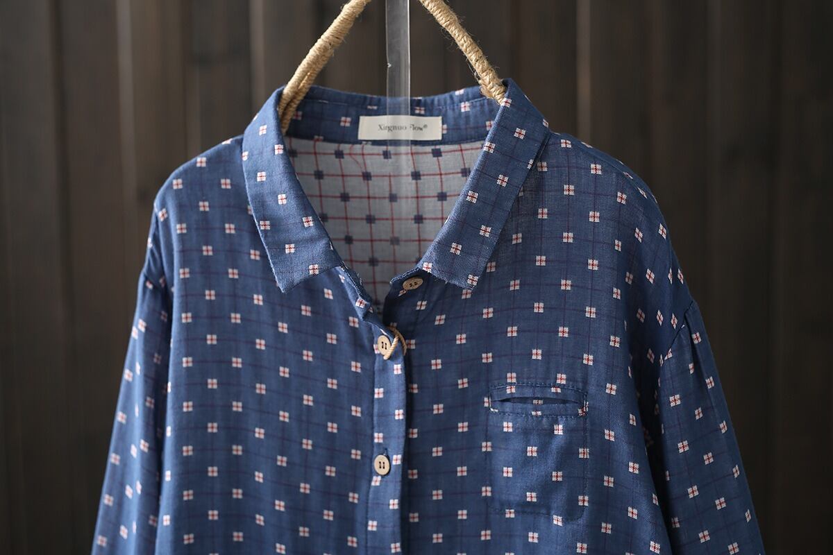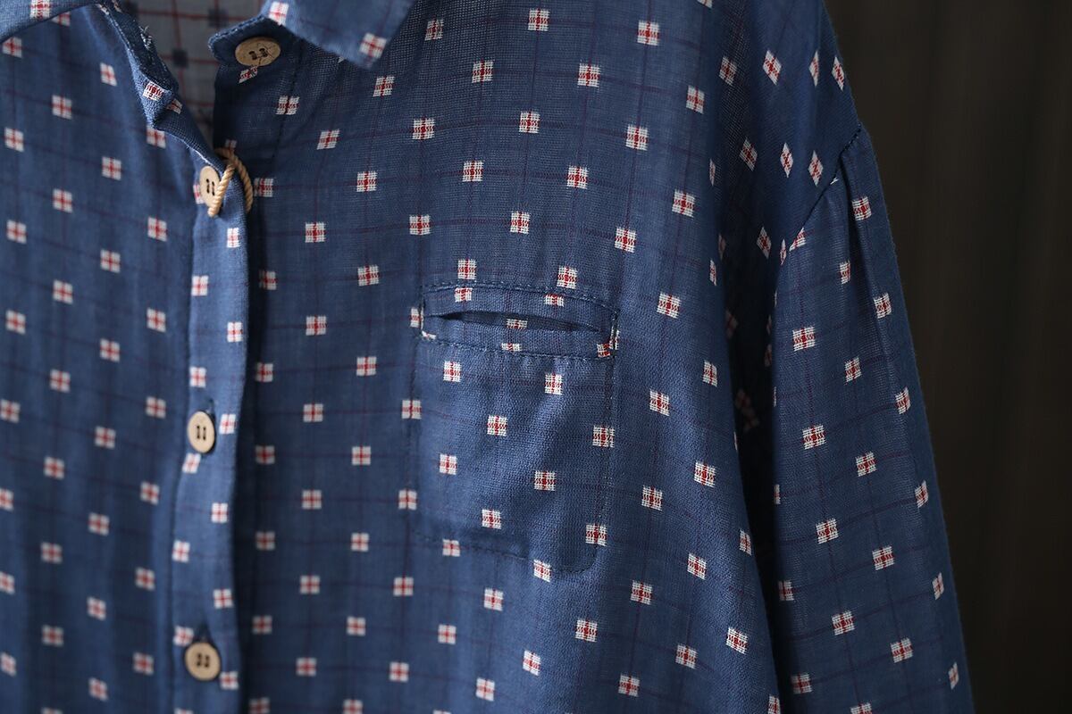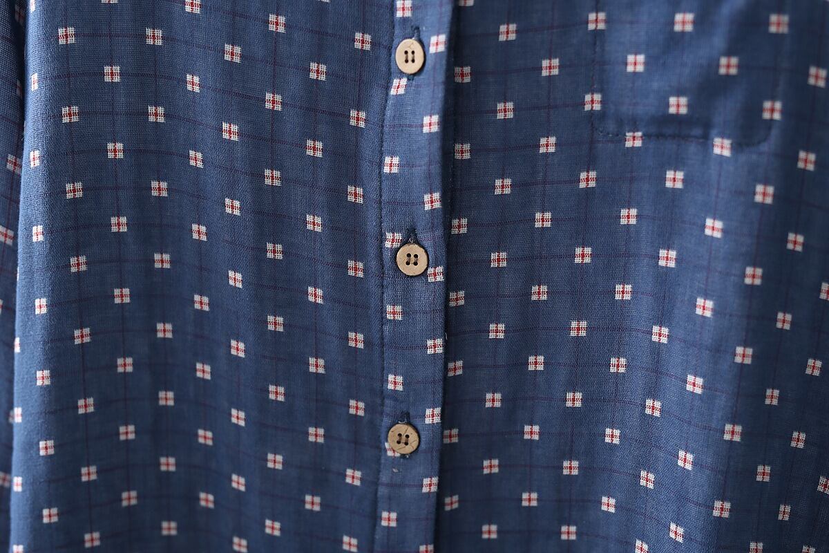 前開き・長袖・襟付きデザインで、シンプルなのにおしゃれな雰囲気を演出します。