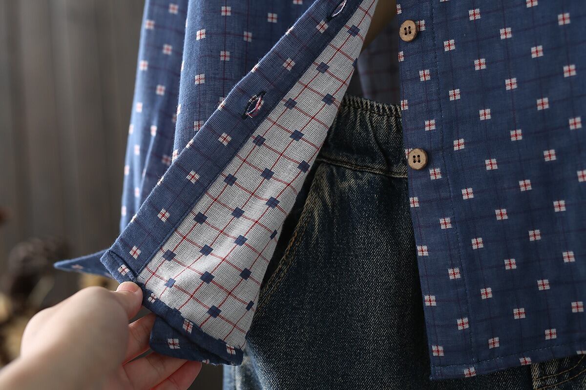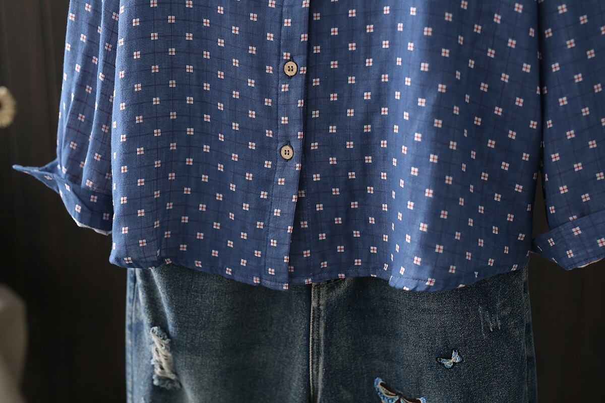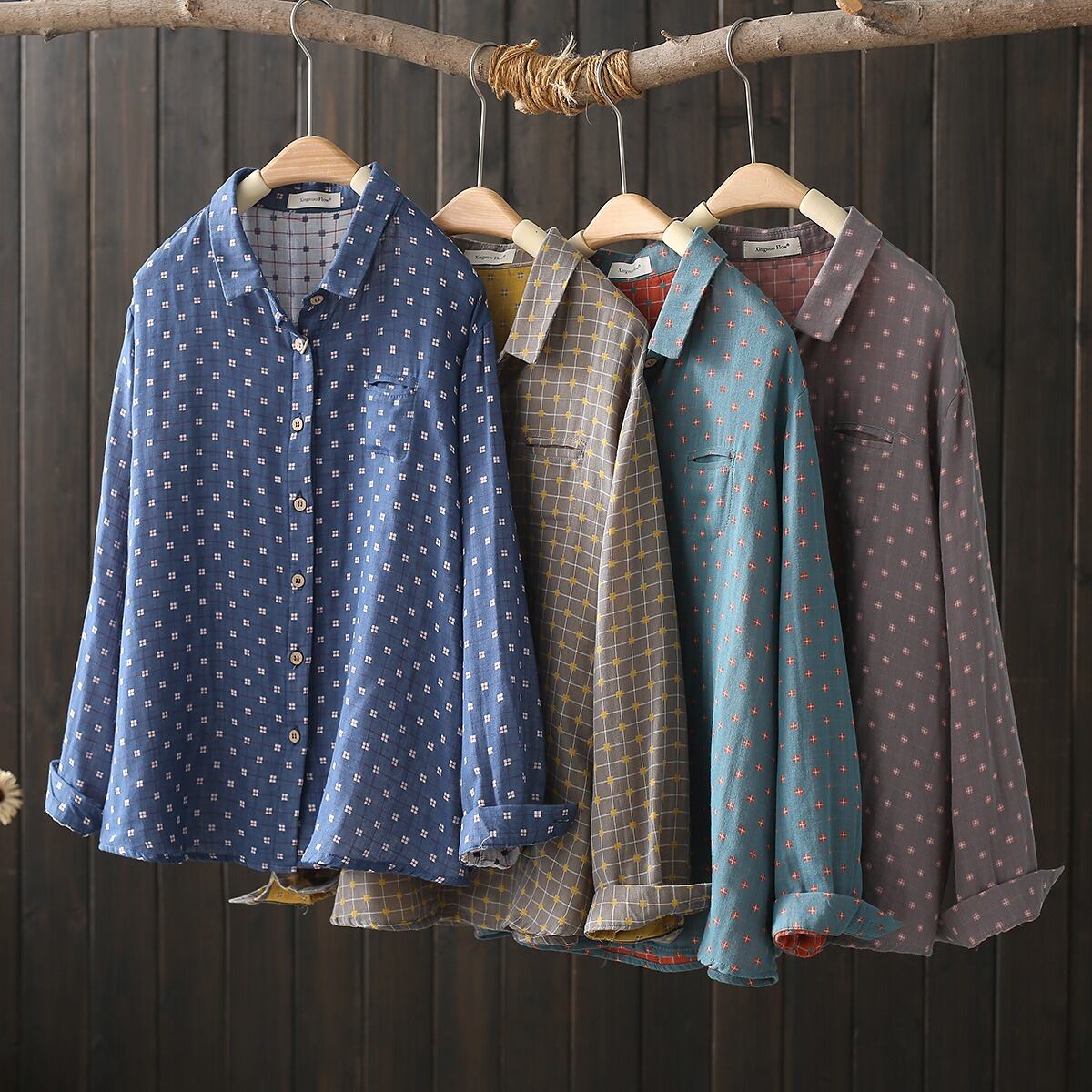 前開き・長袖・襟付きデザインで、シンプルなのにおしゃれな雰囲気を演出します。