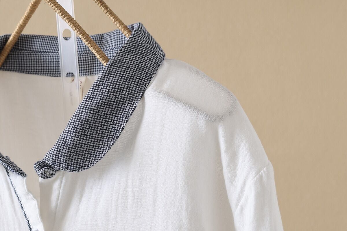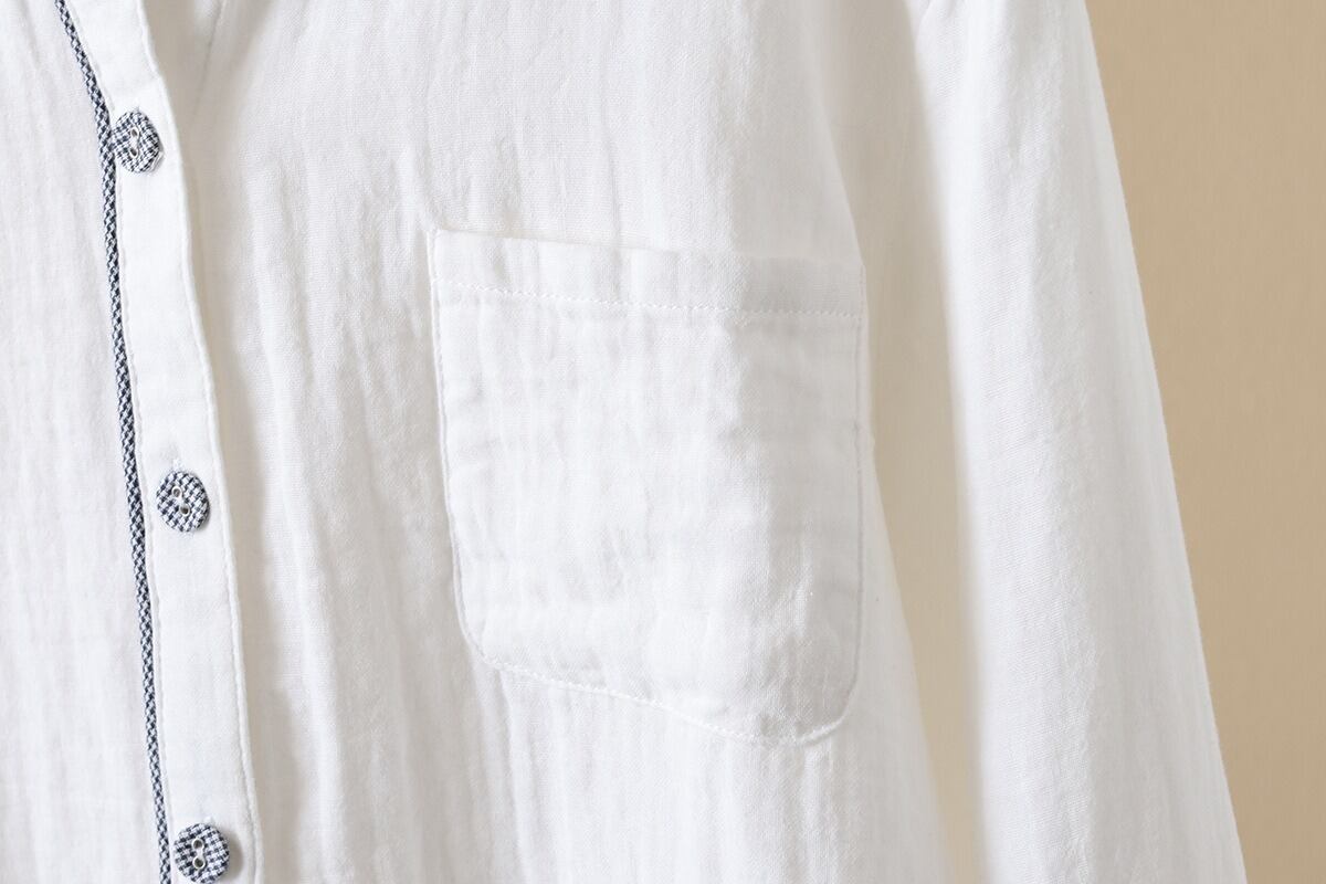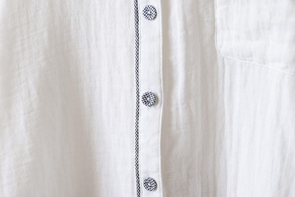 前開きと襟付きデザインが、上品でありながらもカジュアルな印象を与えます。