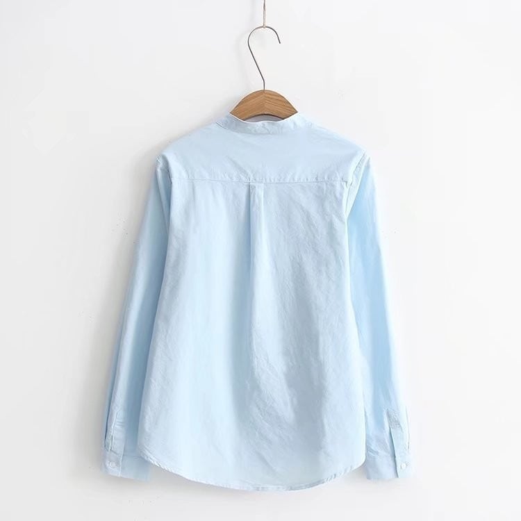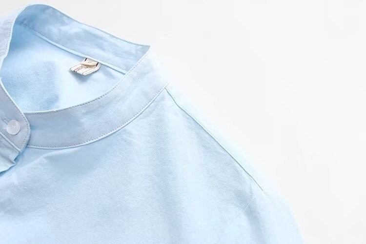 前開きデザインと襟なしのスタイルが大人可愛い印象を与えつつ、カジュアルにも合わせやすい一枚です。
