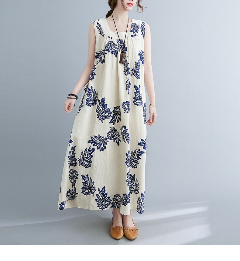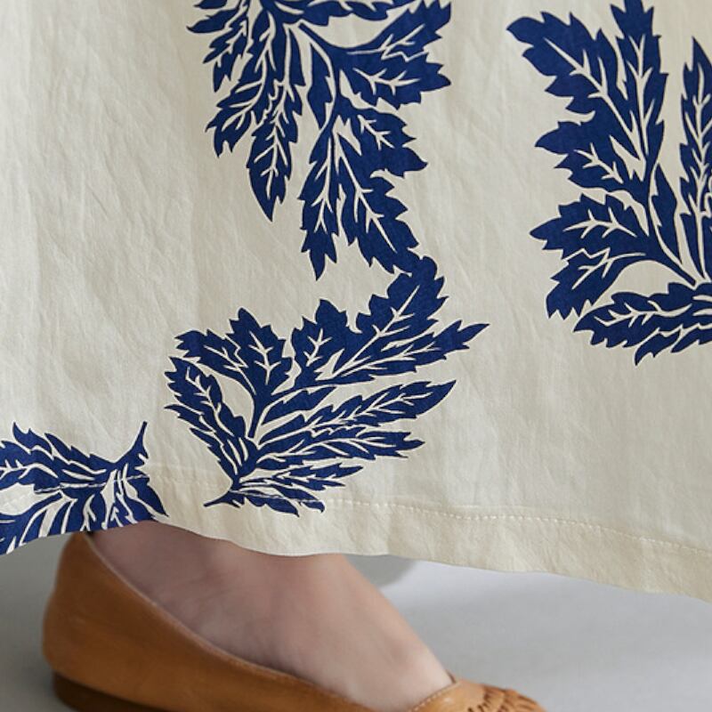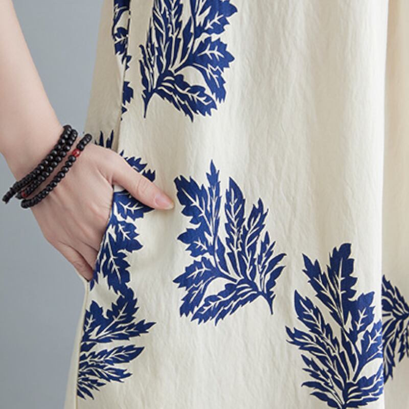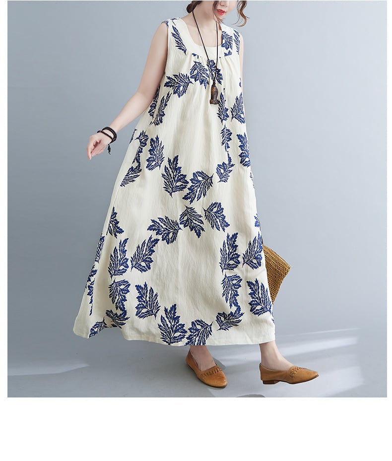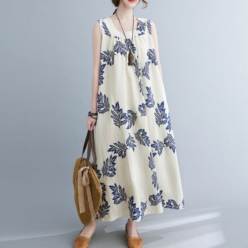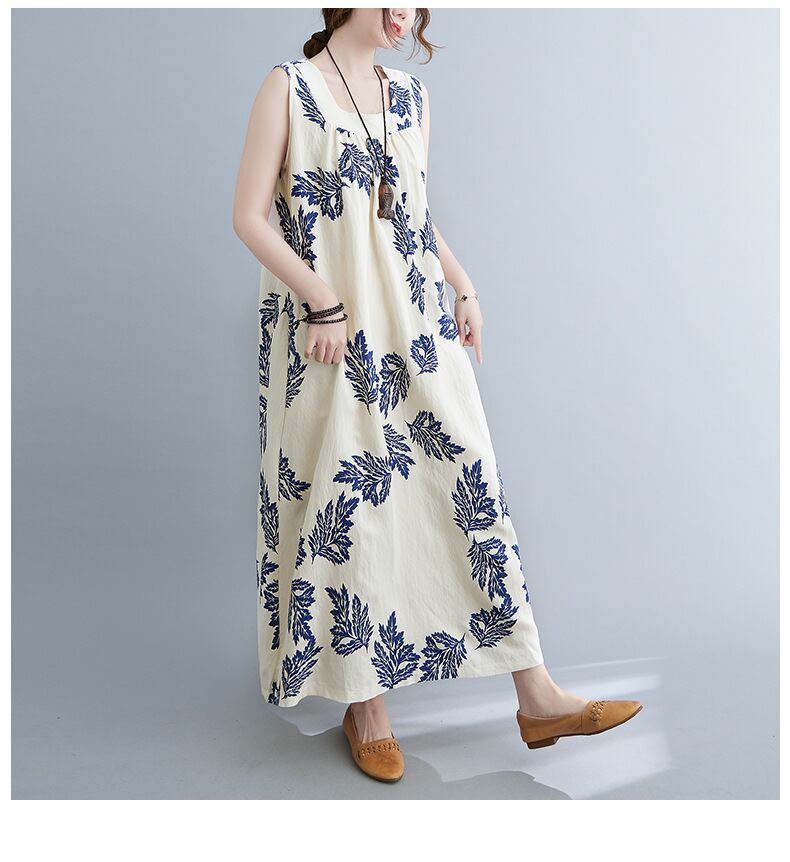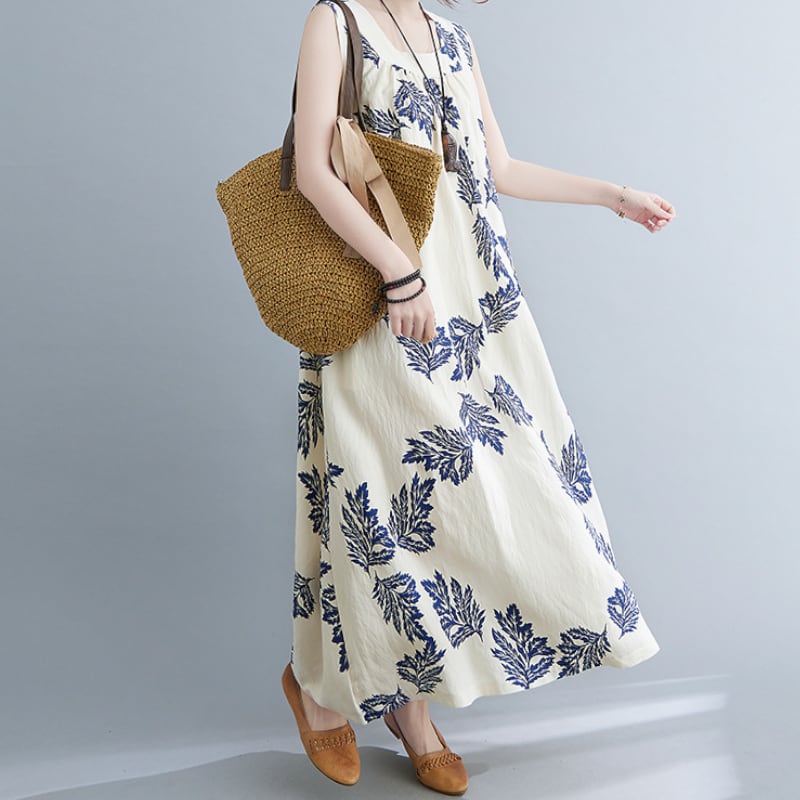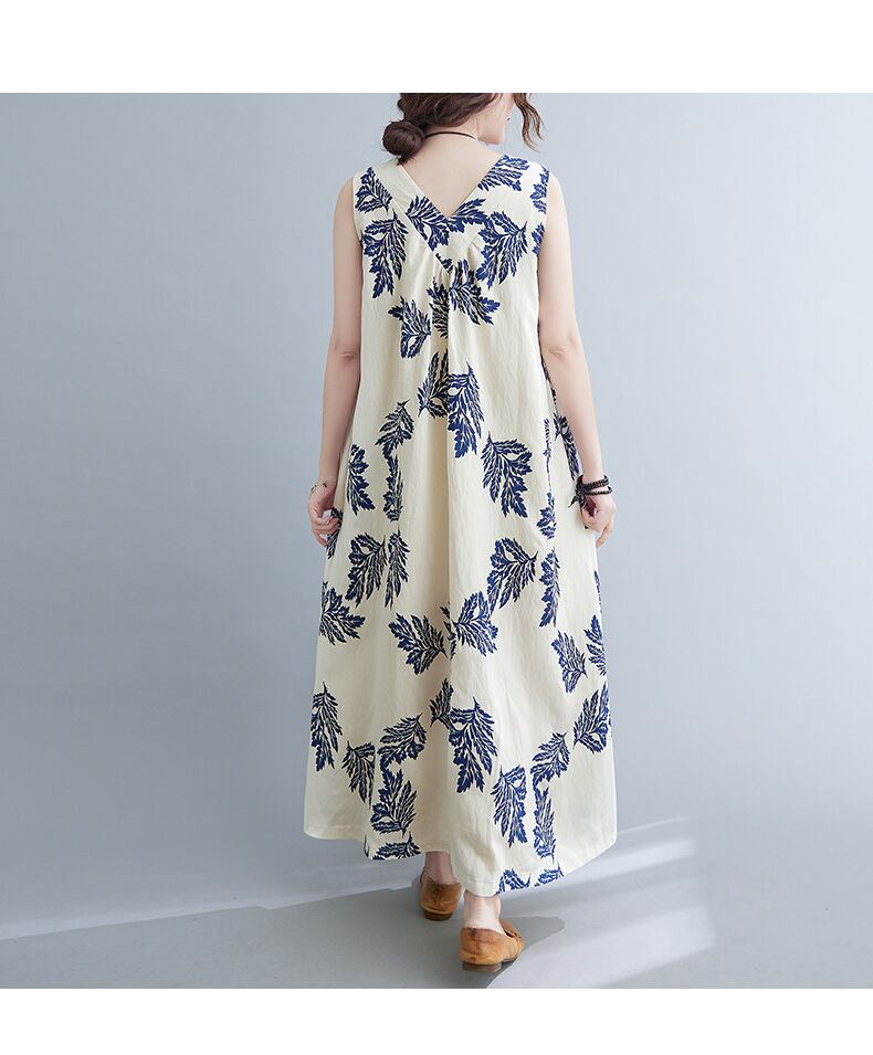 エレガントなボタニカルデザインが特徴のワンピースです。ノースリーブのVネックが、女性らしさを引き立てます。ゆったりとしたAラインシルエットは、体型カバー効果があり快適な着心地を実現。大人可愛い上品な印象を与え、主役級の存在感を放ちます。