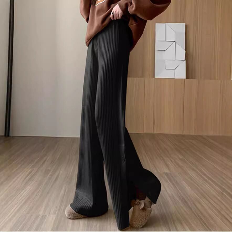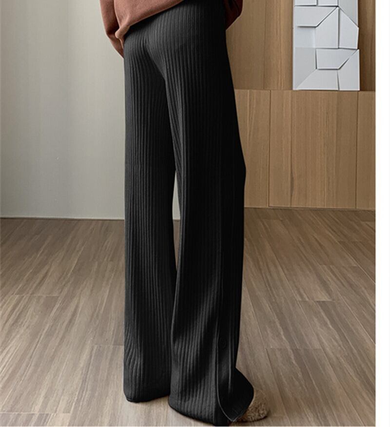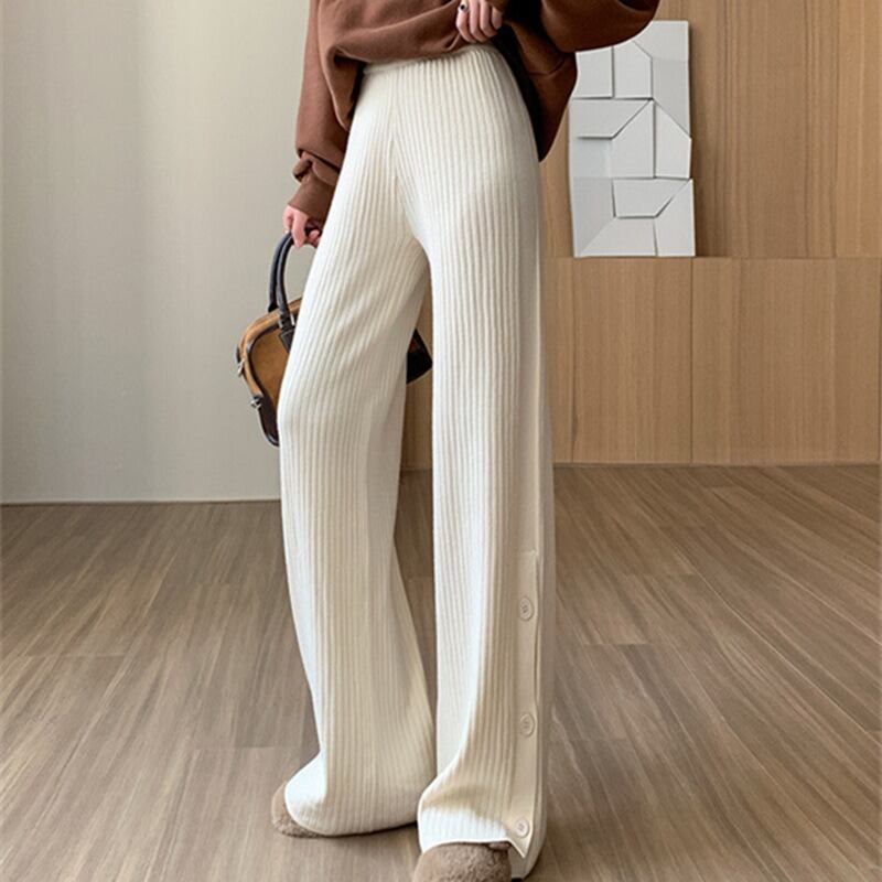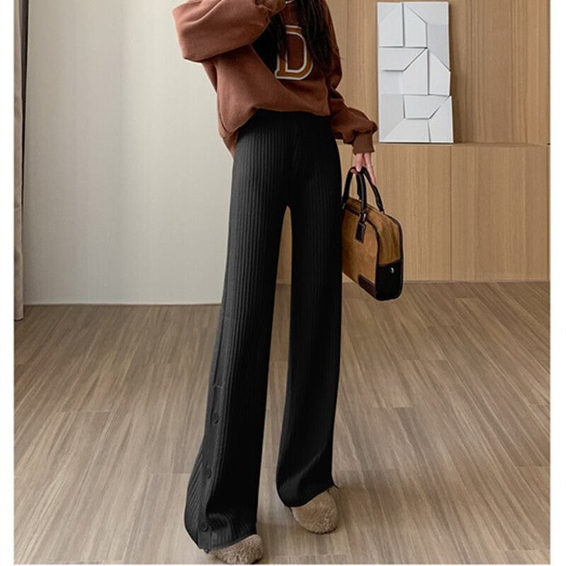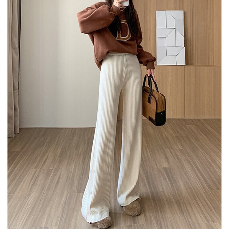 ハイウエストとウエストゴム仕様で、楽ちんな着心地を実現。リブ素材が体型を優しくカバーし、シンプルで上品な印象を与えます。
