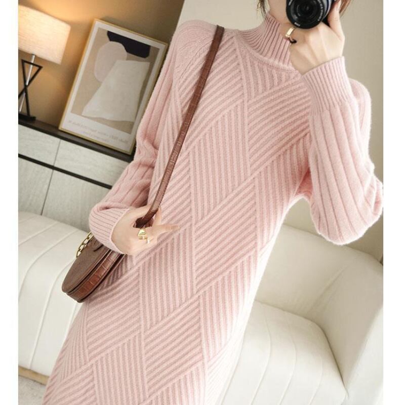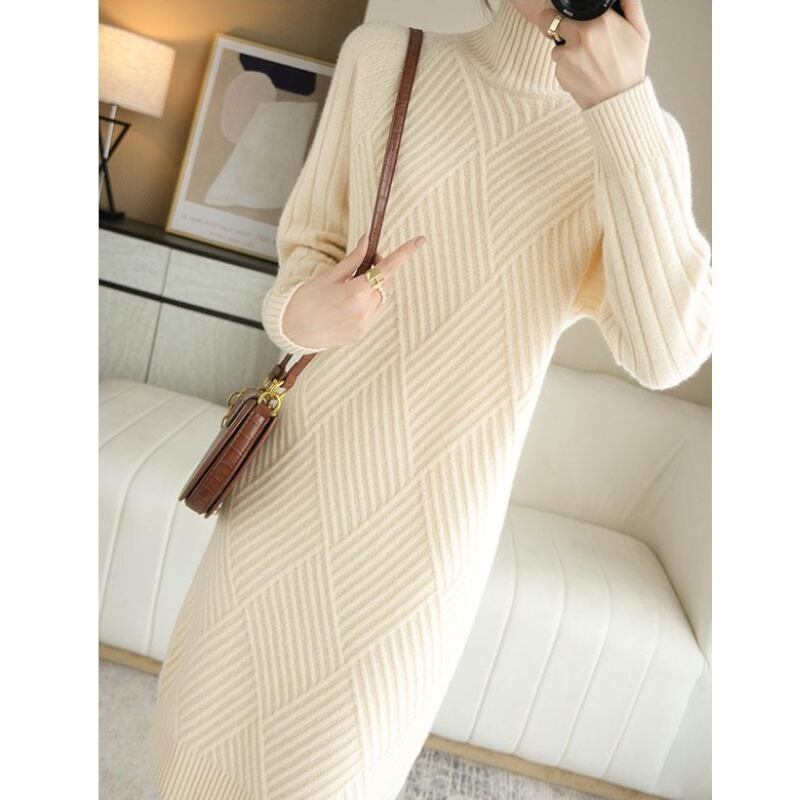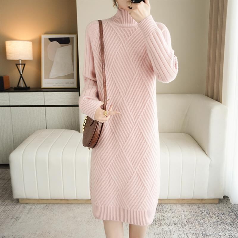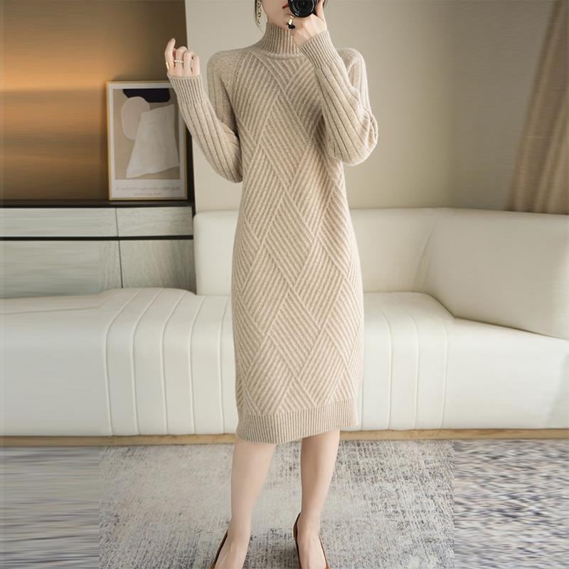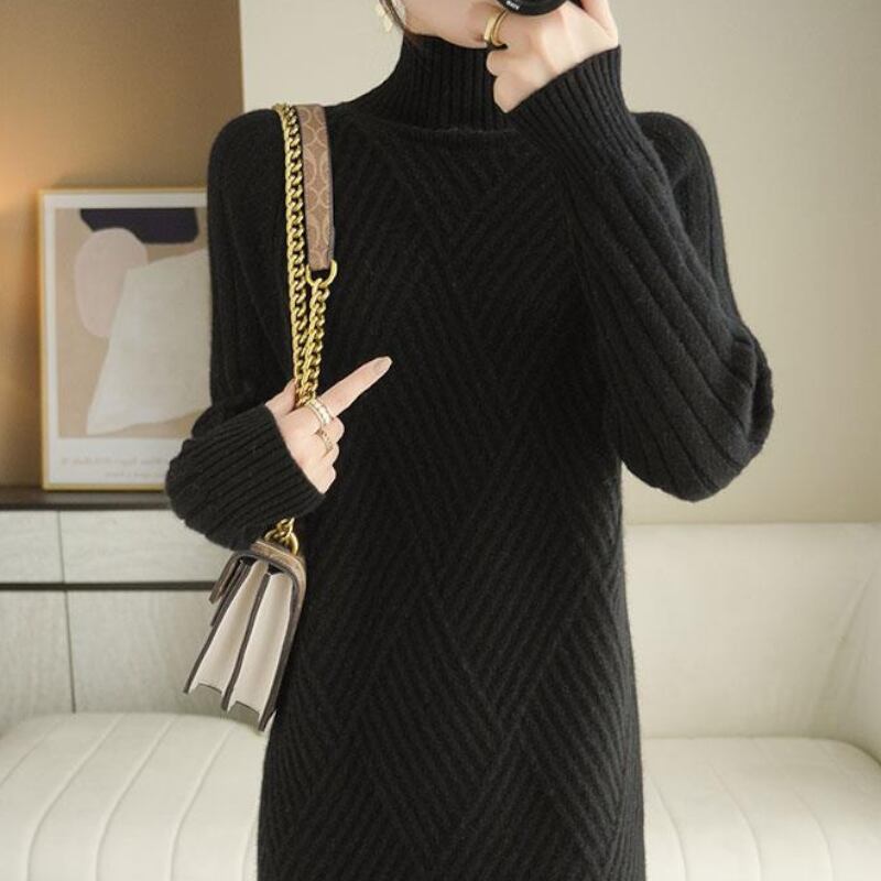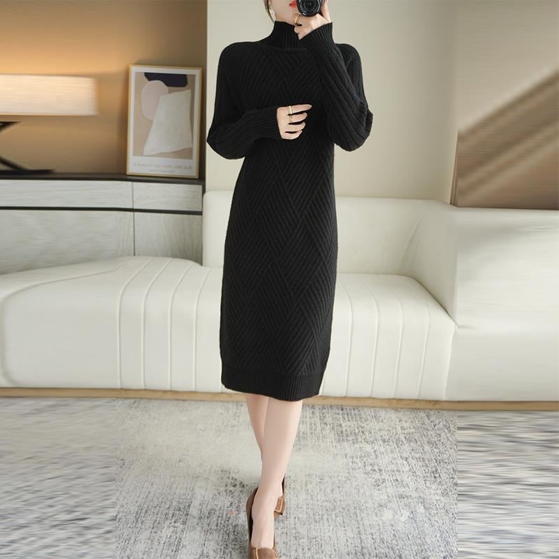 フェミニンでありながらもシンプルでおしゃれなデザインが魅力的なワンピース。膝下の長さとハイネックのタートルネックが上品さを引き立て、体のラインを美しく見せます。休日やカフェタイムなどでもおしゃれに着こなせるアイテムです。