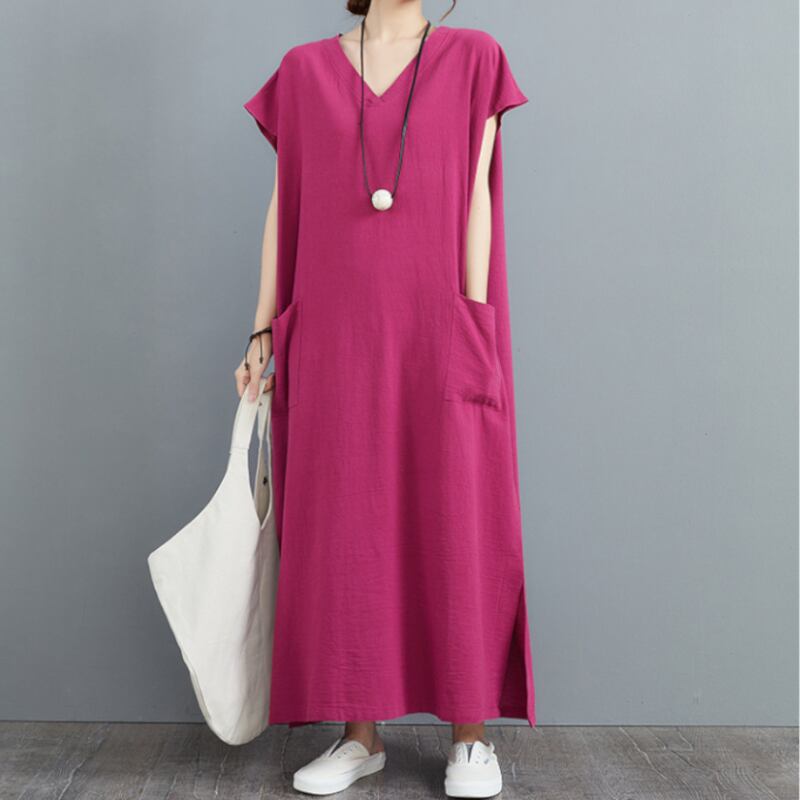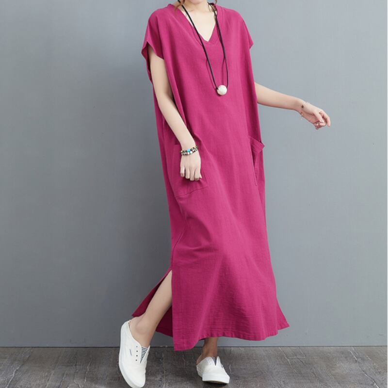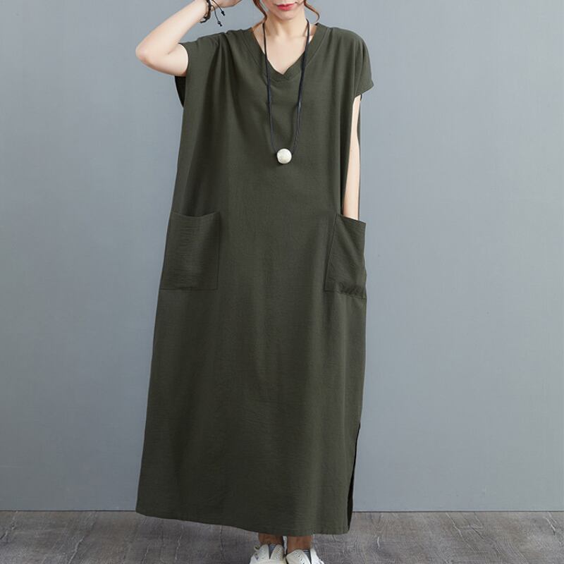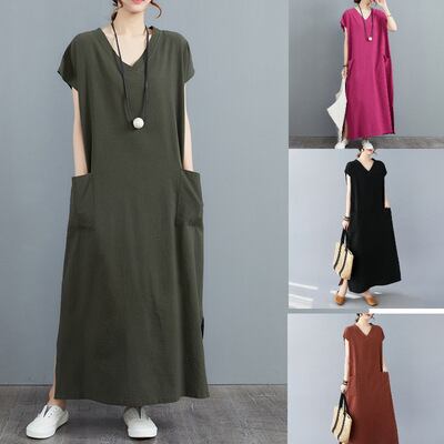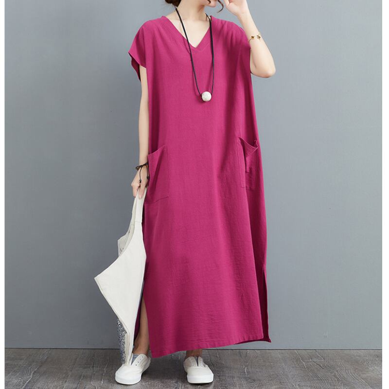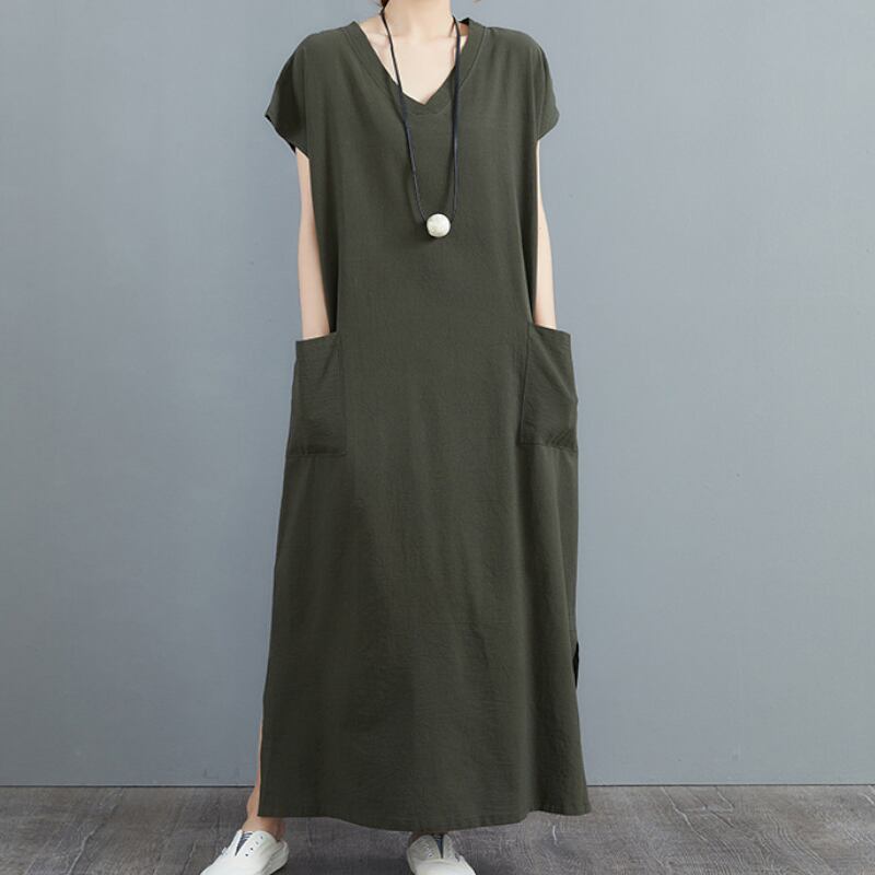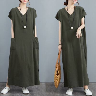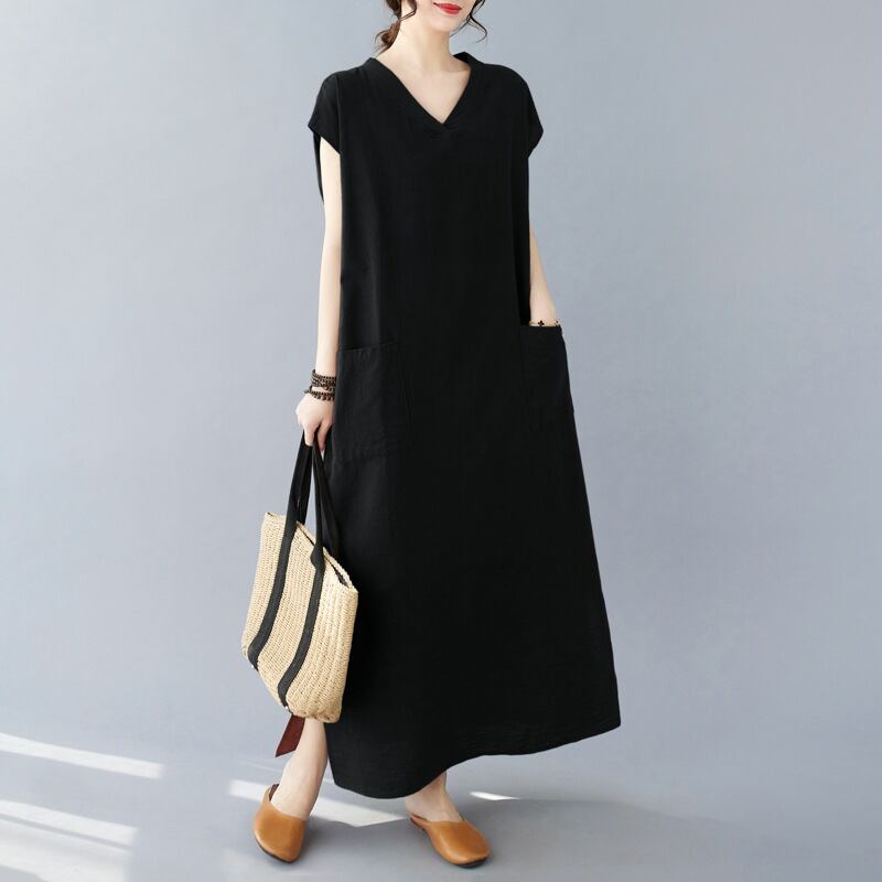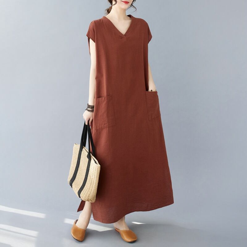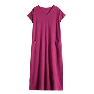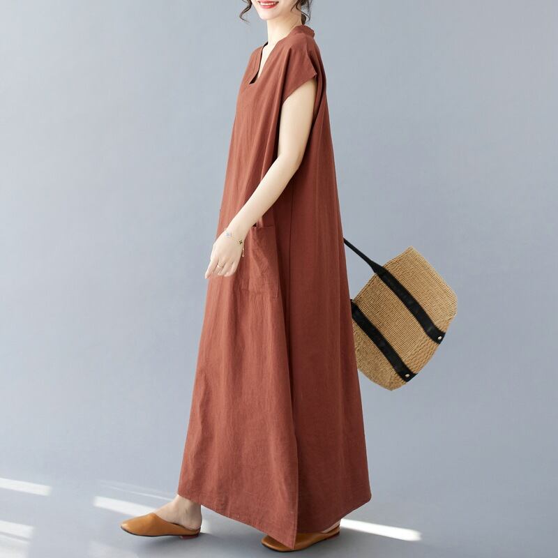 おしゃれで快適なレディースロングワンピースのご提案です。異国情緒あふれるデザインが特徴のこのワンピースは、Vネックで首回りをスッキリと見せてくれます。大人女性の魅力を引き立てます。普段使いからリゾートや旅行シーンまで幅広くご利用いただけます。