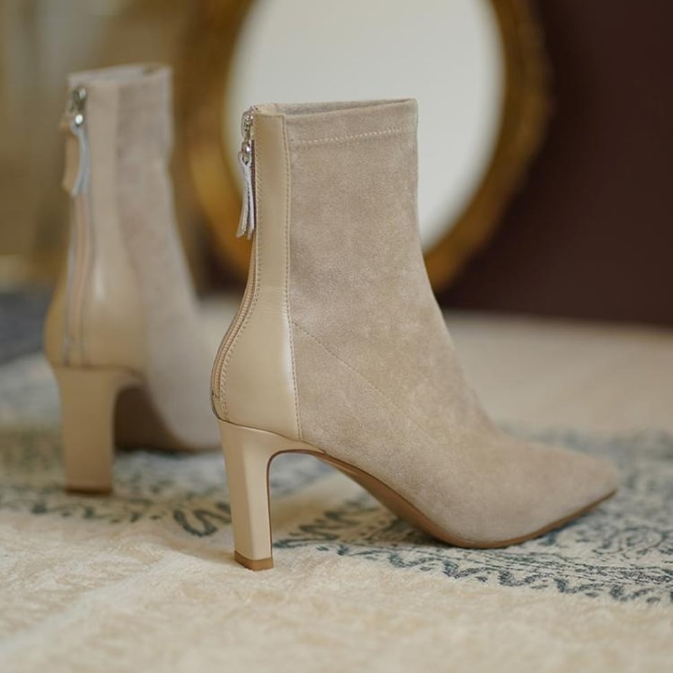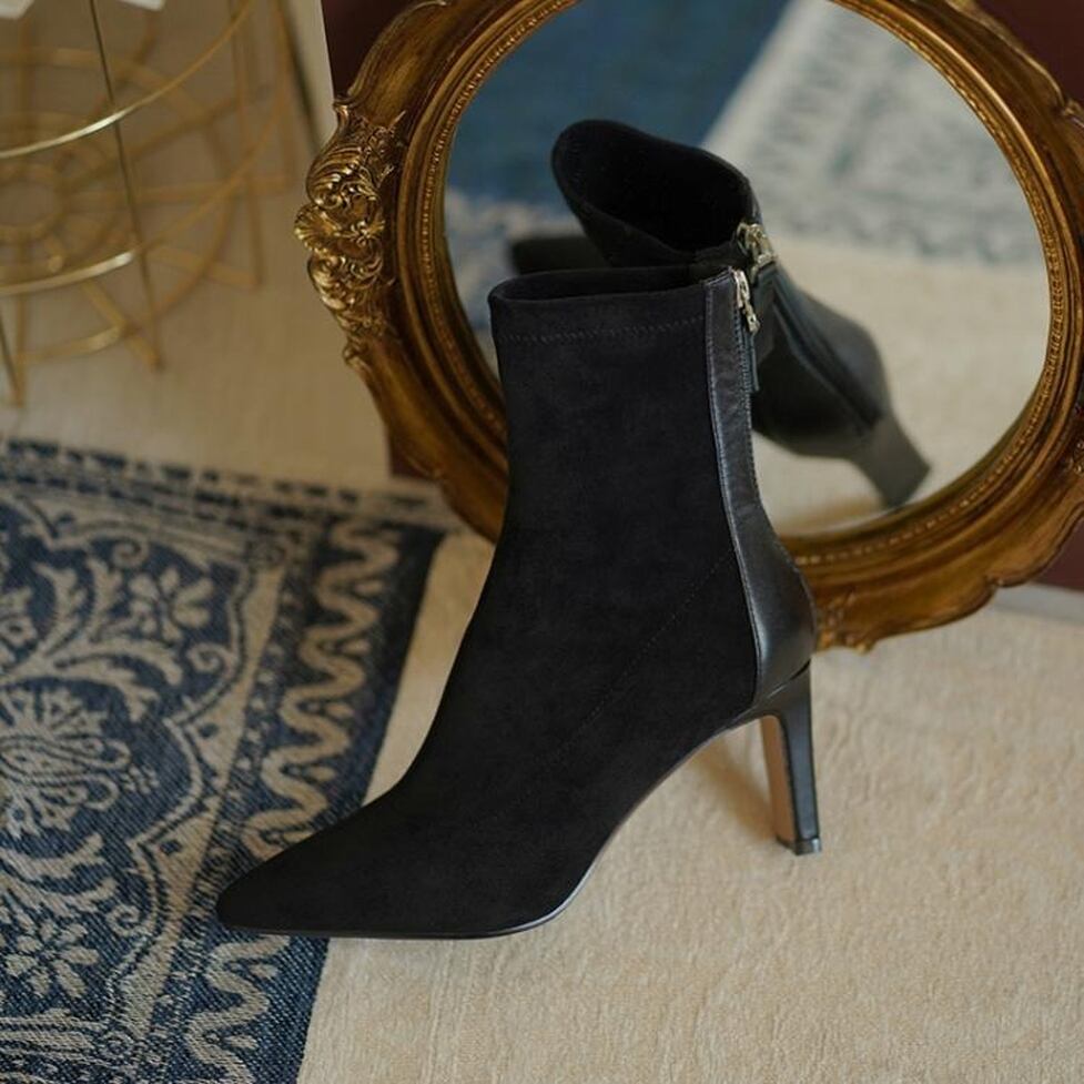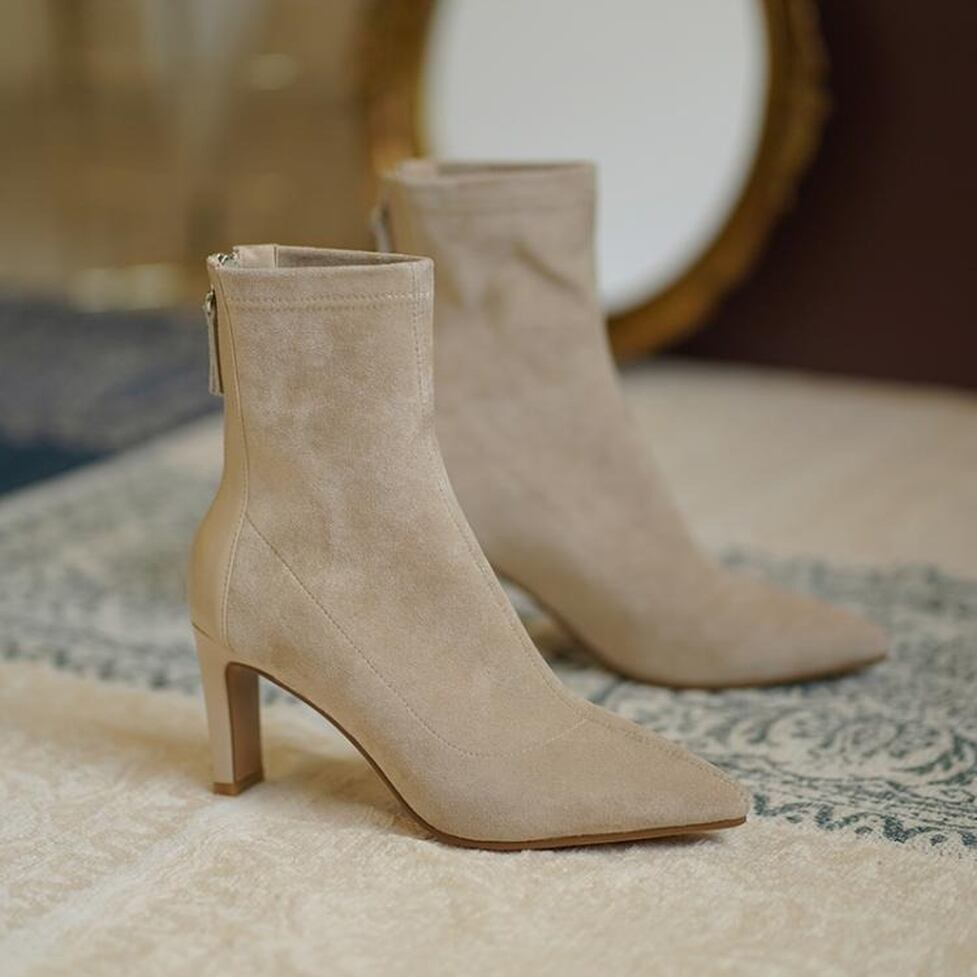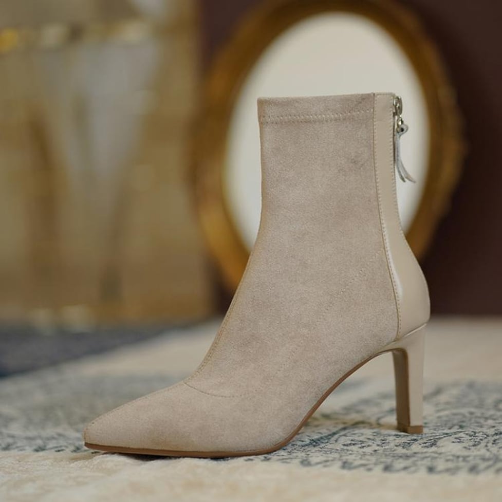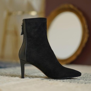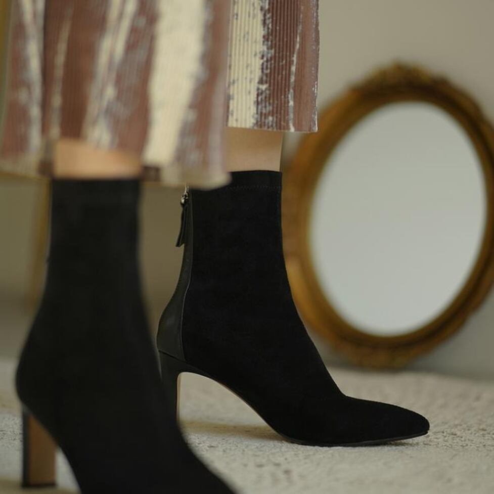 スエード調の素材と華奢に見せてくれるデザインでエレガントに決まるショートブーツ。
