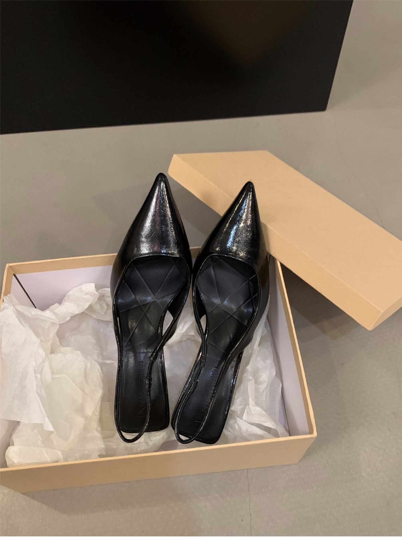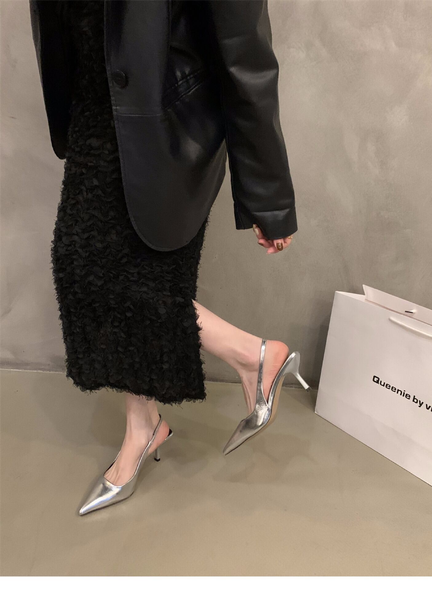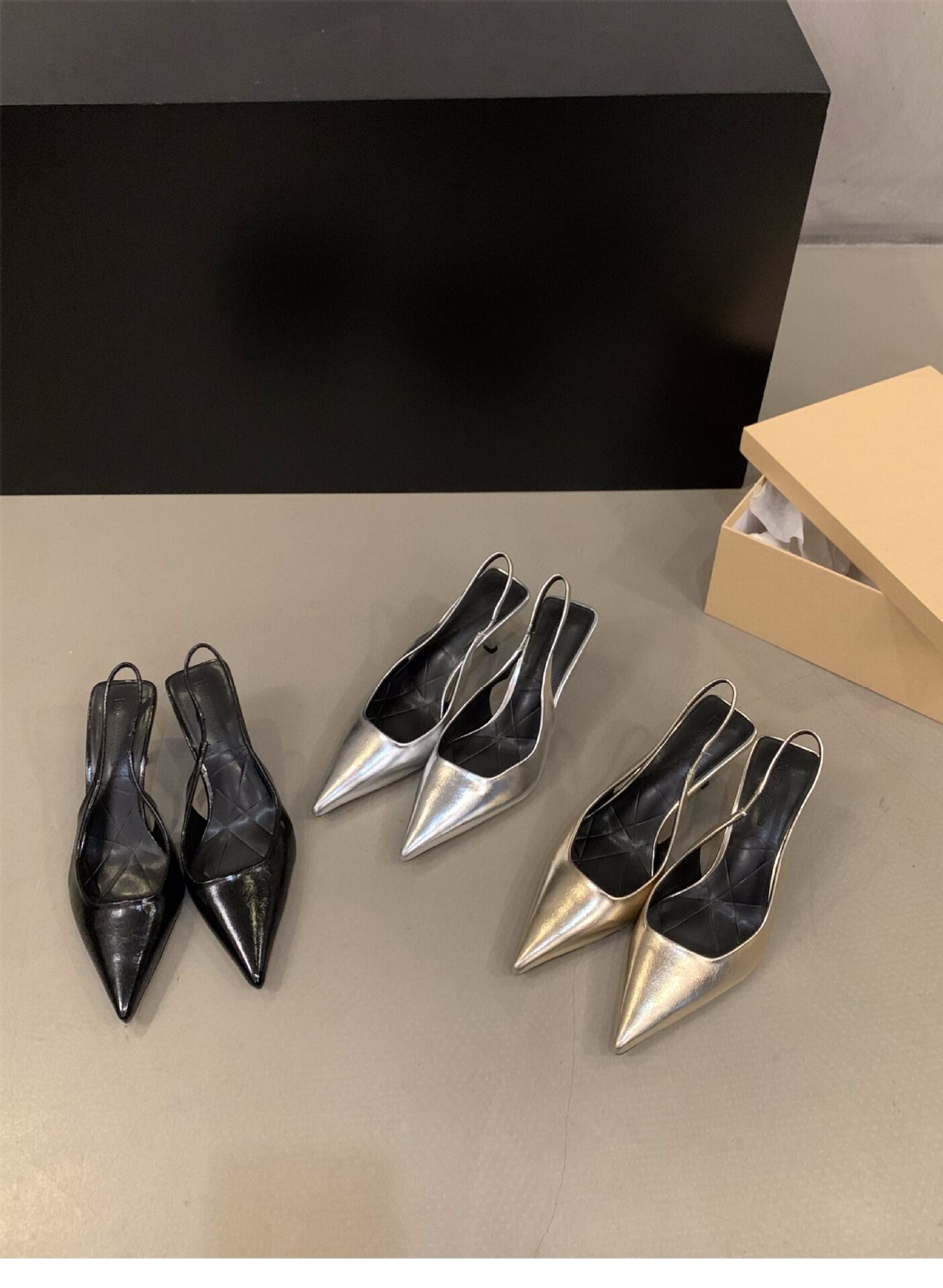 ポインテッドトゥデザインとバックストラップで、美脚効果を実感できる一足です!