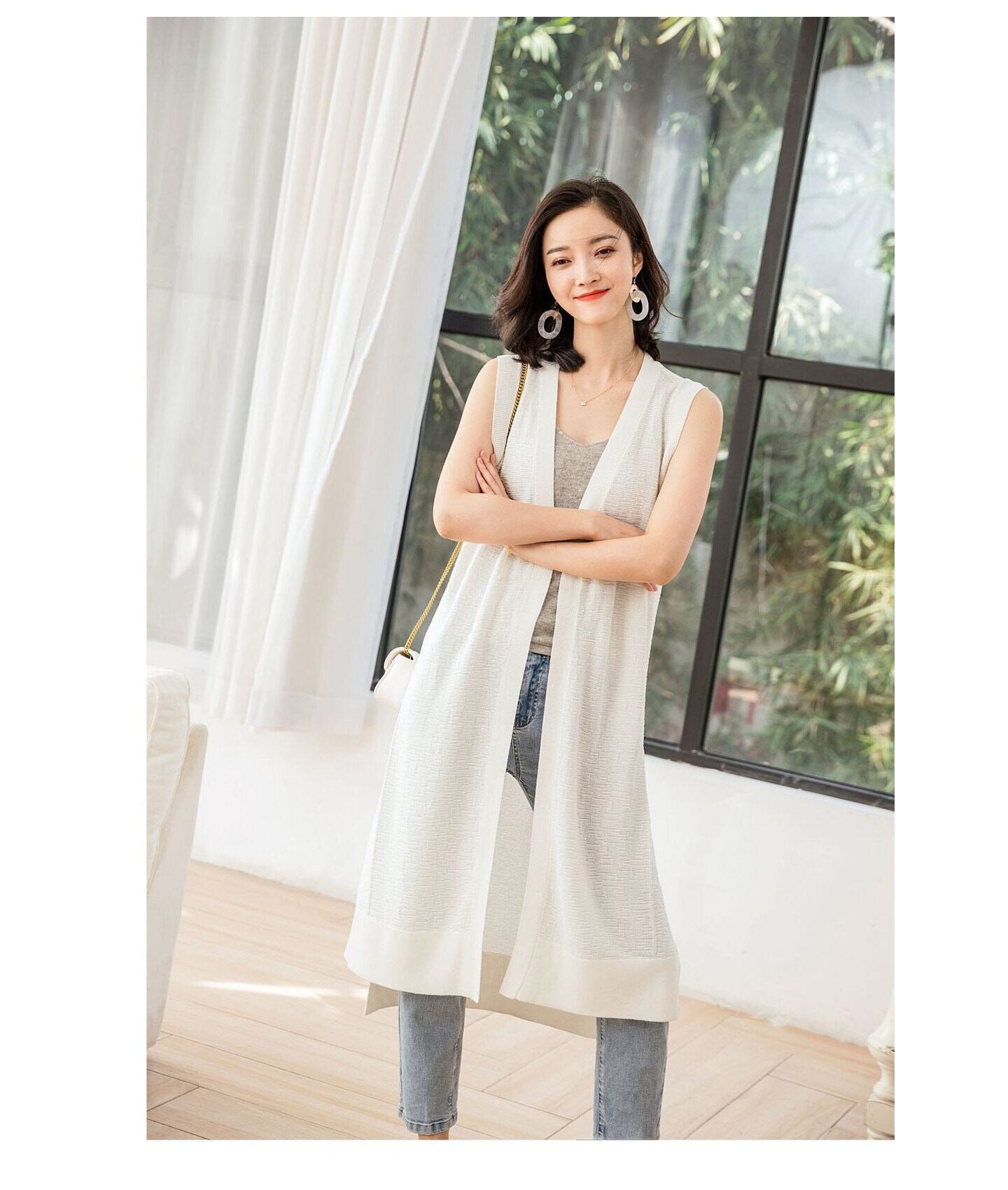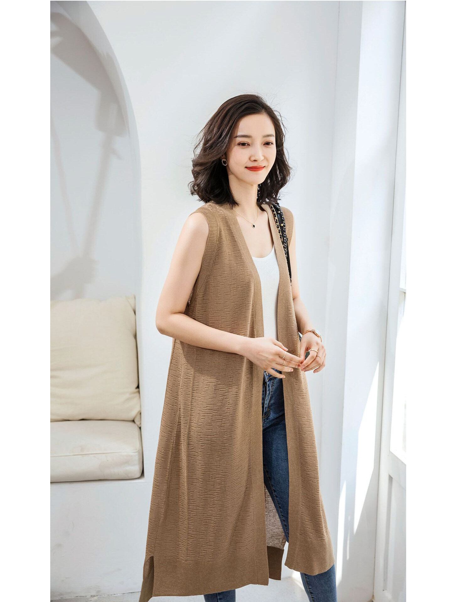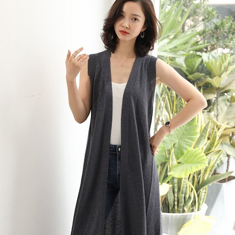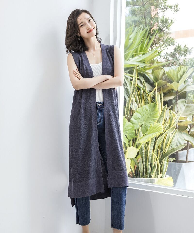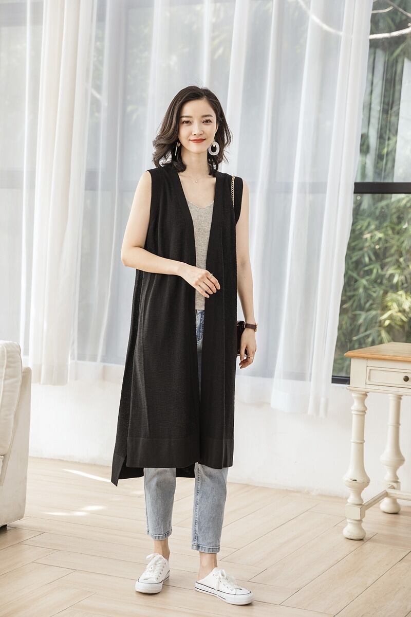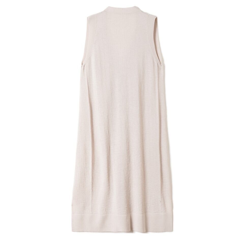 前開きのデザインとノースリーブは、軽やかさを演出し、サイドスリットがこなれ感をプラス。