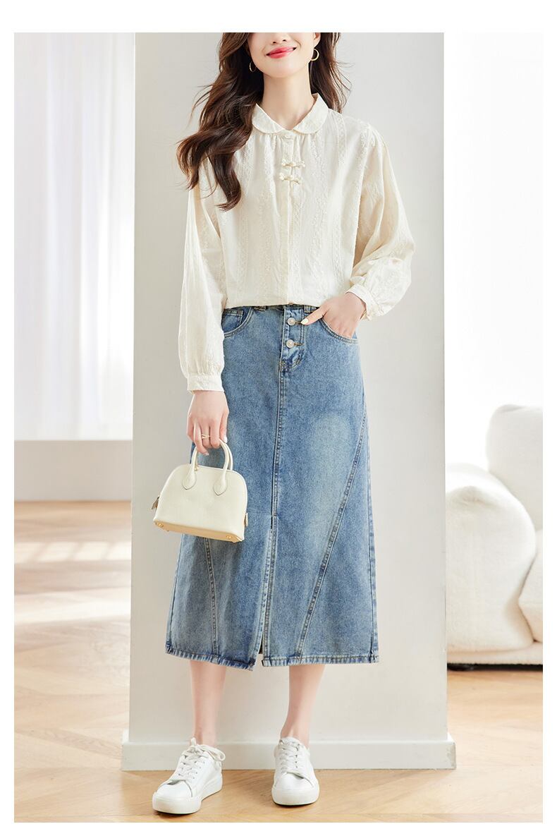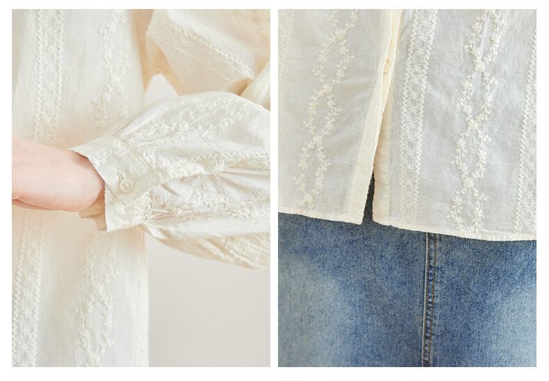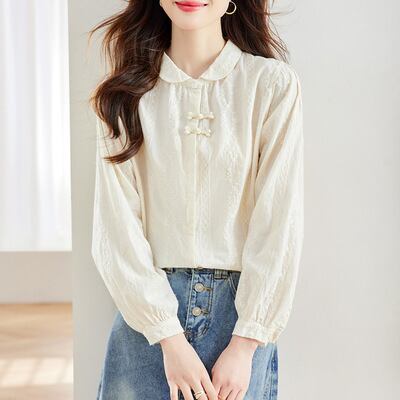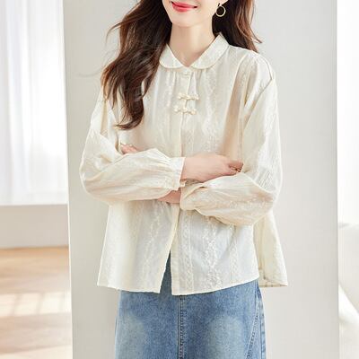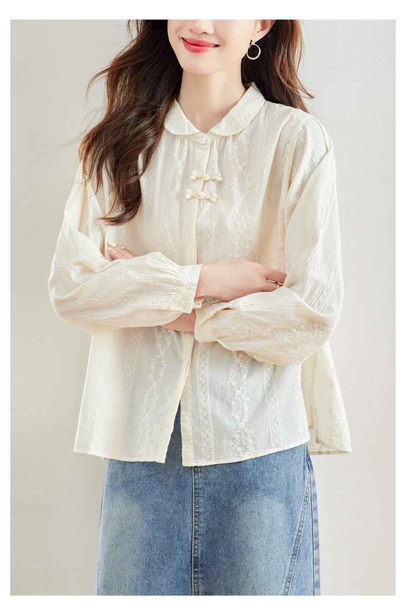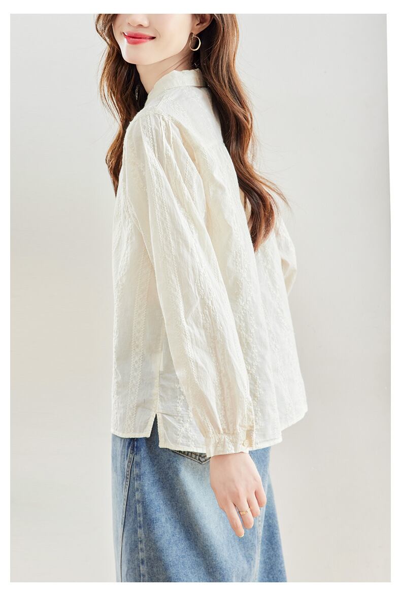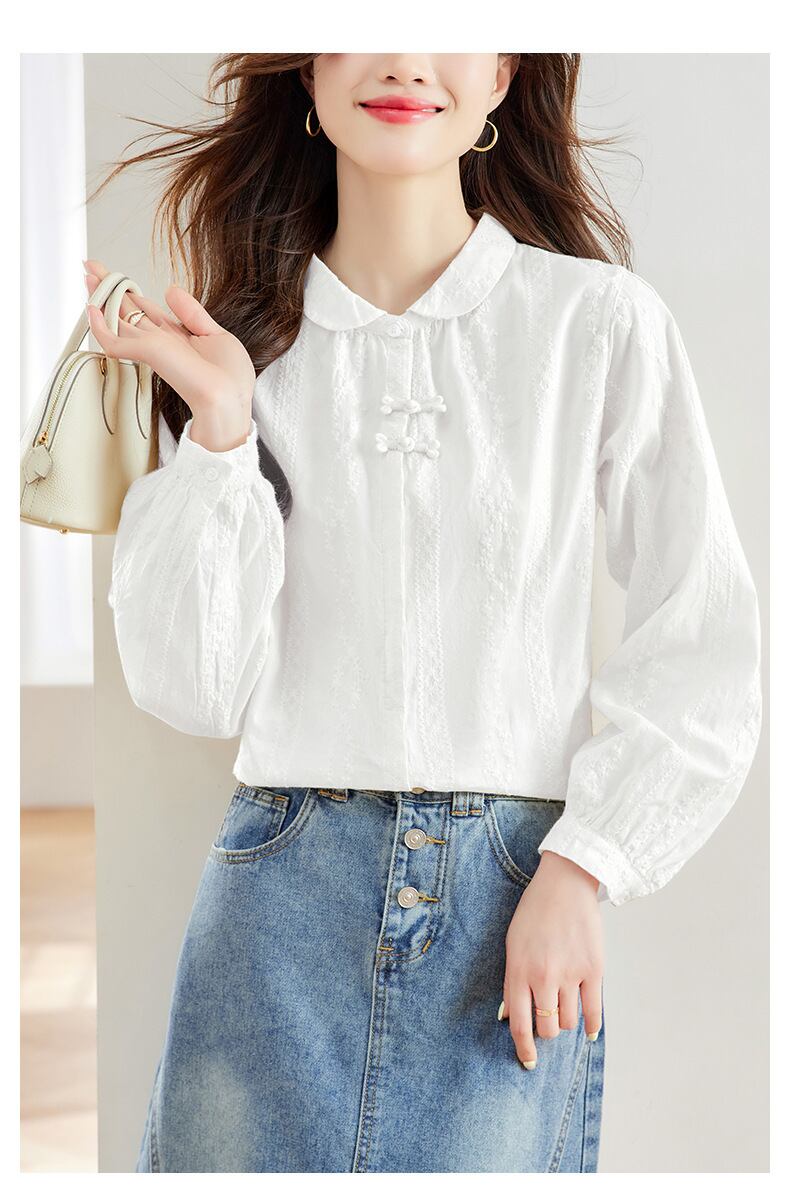 丸襟とボタンダウンデザインが、シンプルながらもフェミニンな印象を与えます。普段使いから特別な日まで幅広く活躍する、おしゃれで上品な一着です。