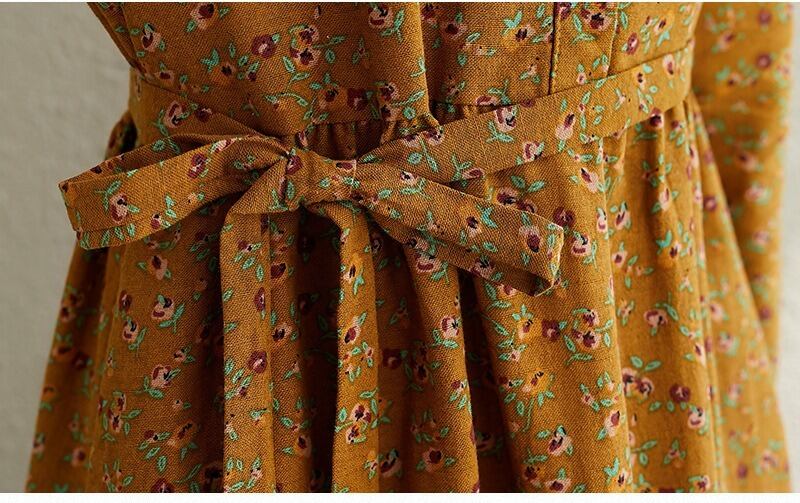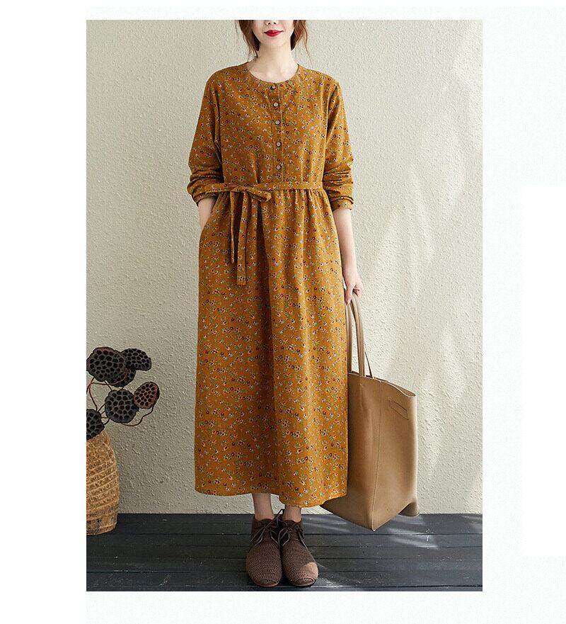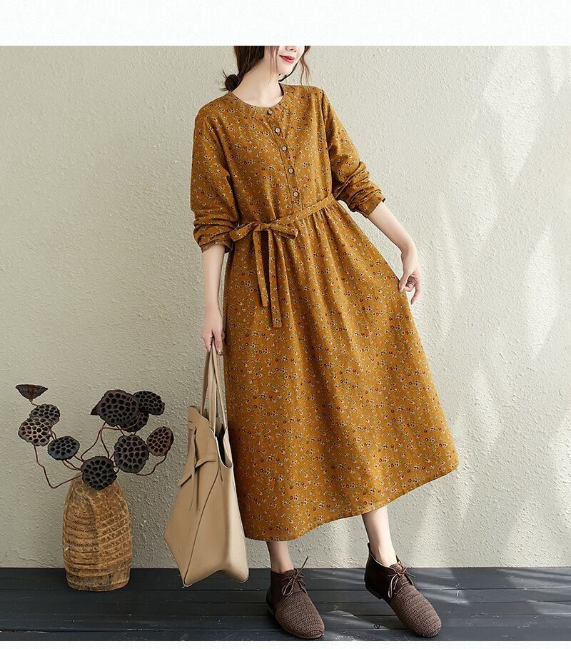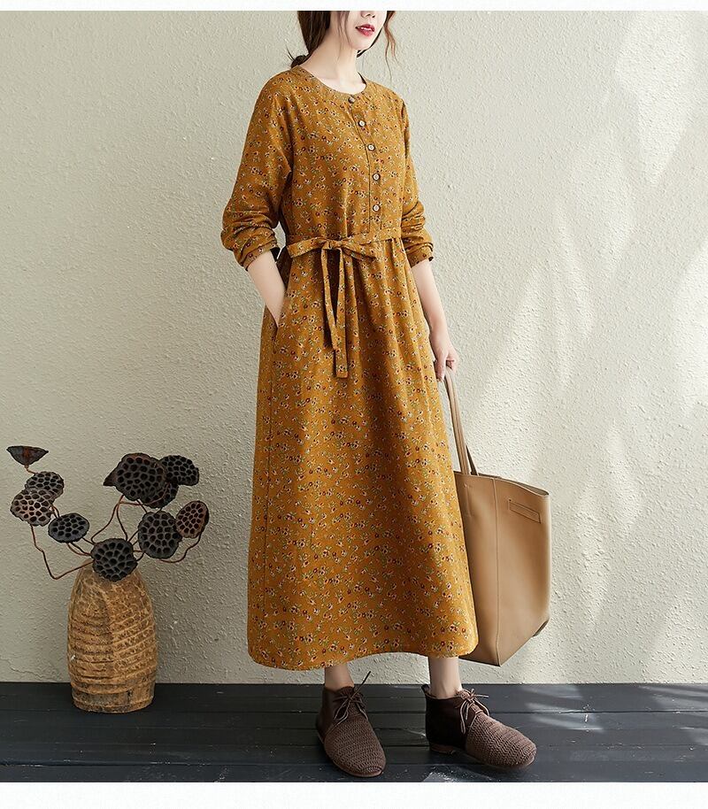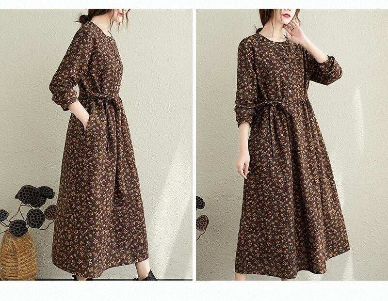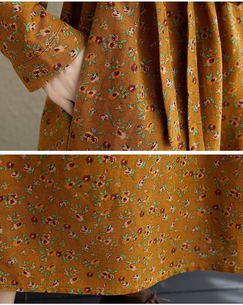 花柄とヘンリーネックが特徴的で、Aラインシルエットが女性らしい美しさを引き立てます。
