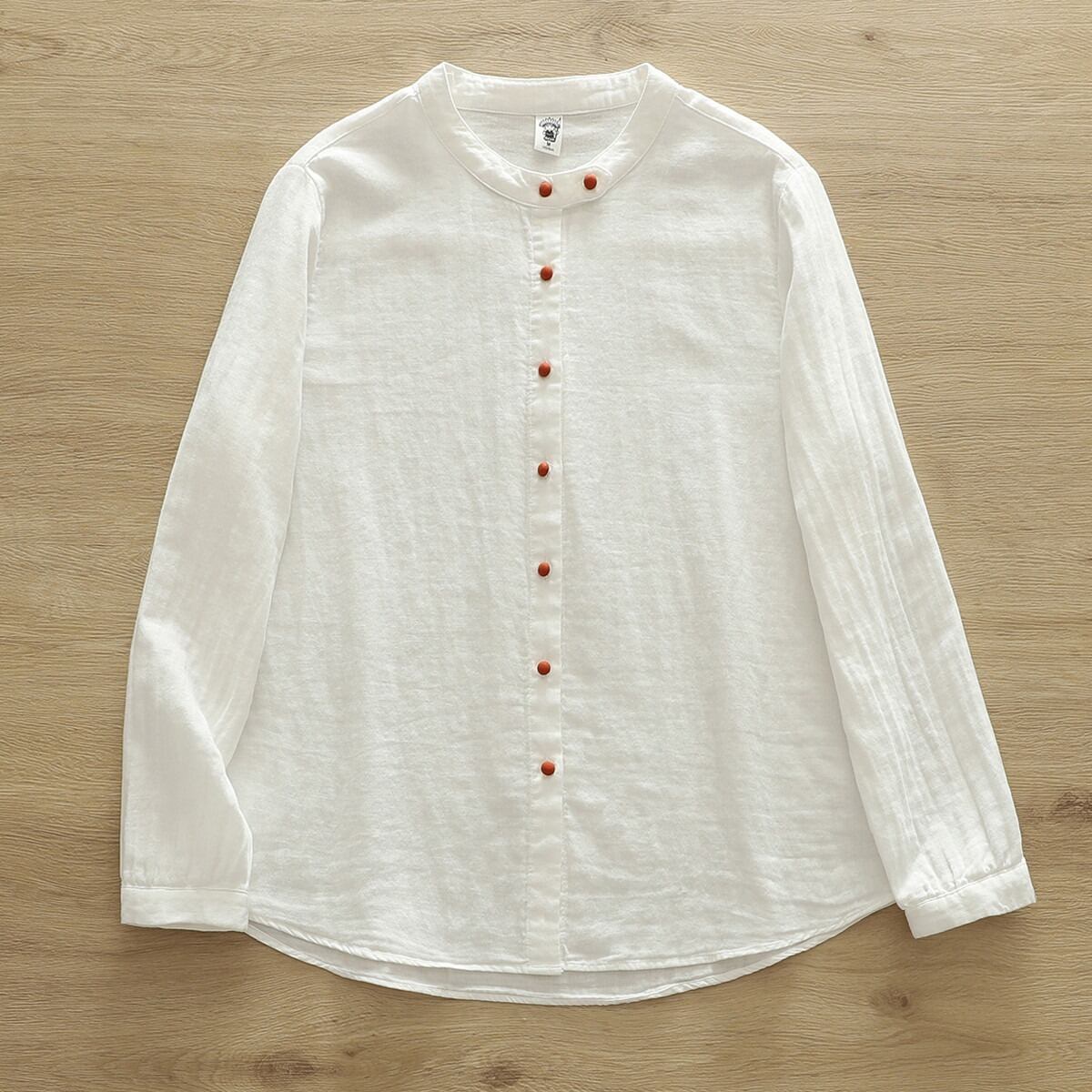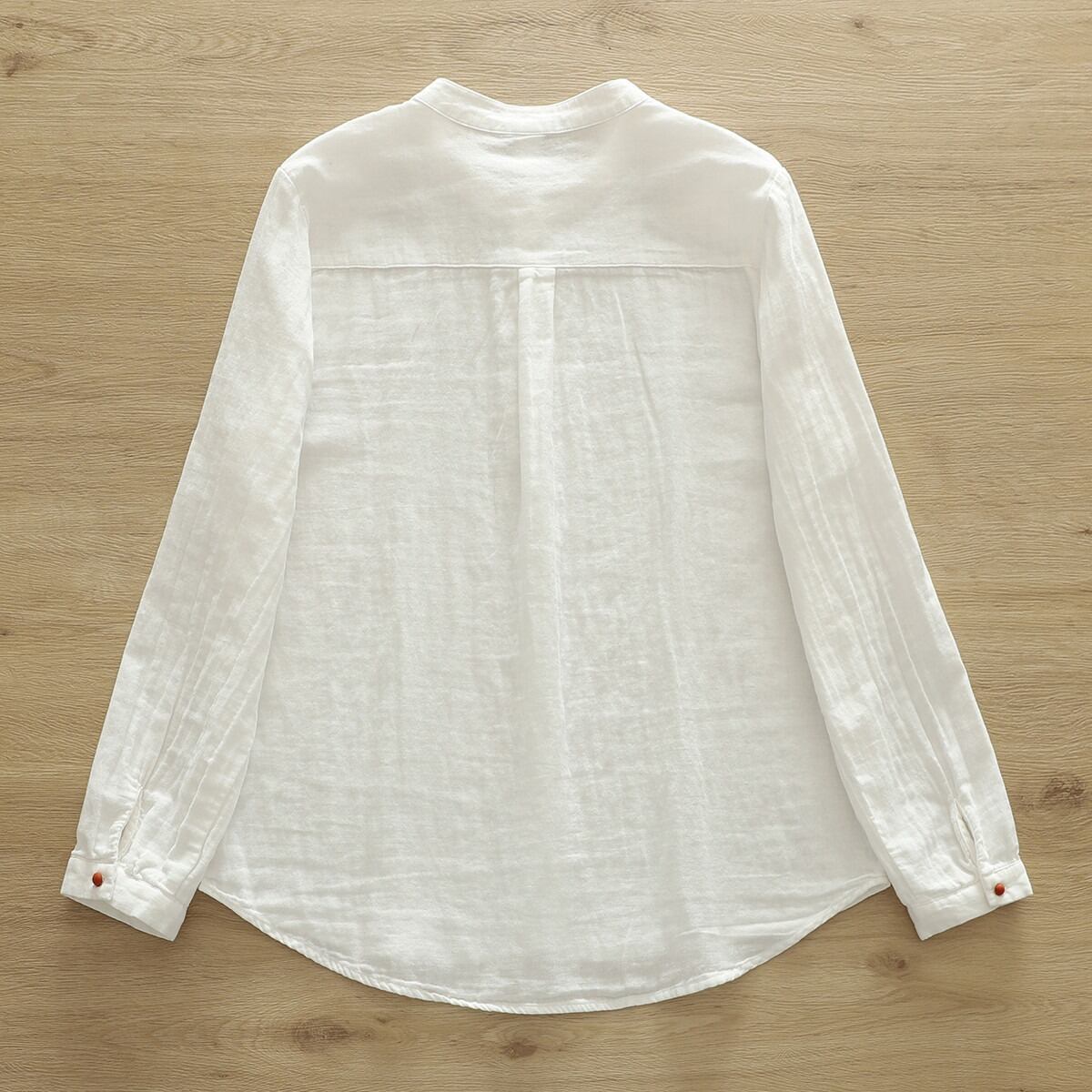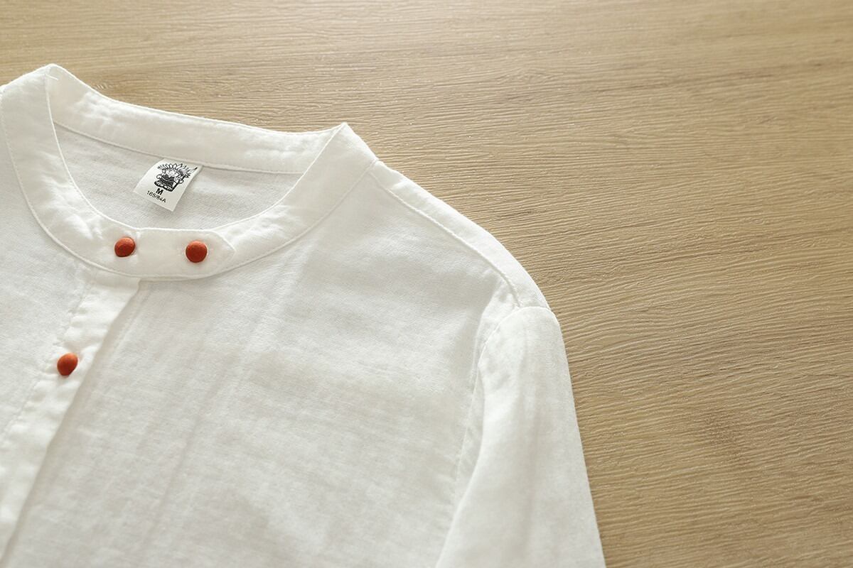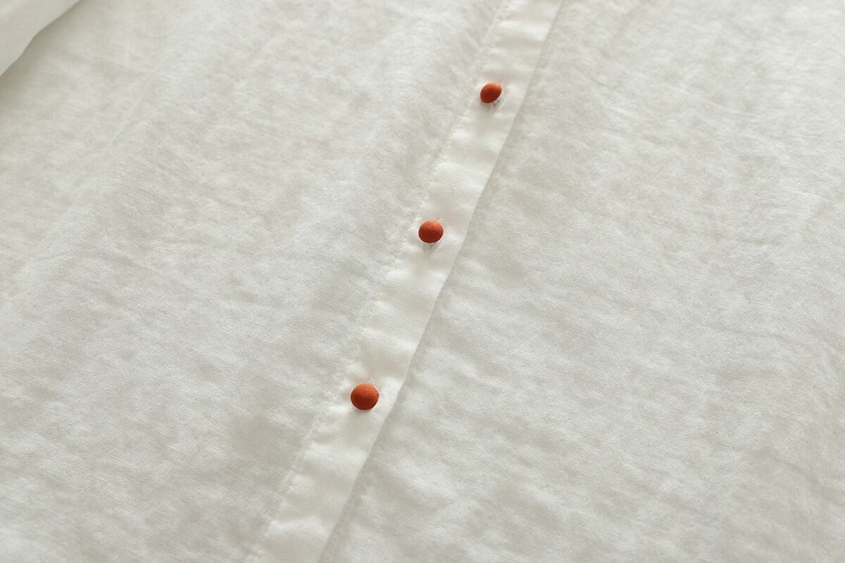 ノーカラーデザインが女性らしさを引き立て、ボタン付きの前開きスタイルで抜け感を演出します。