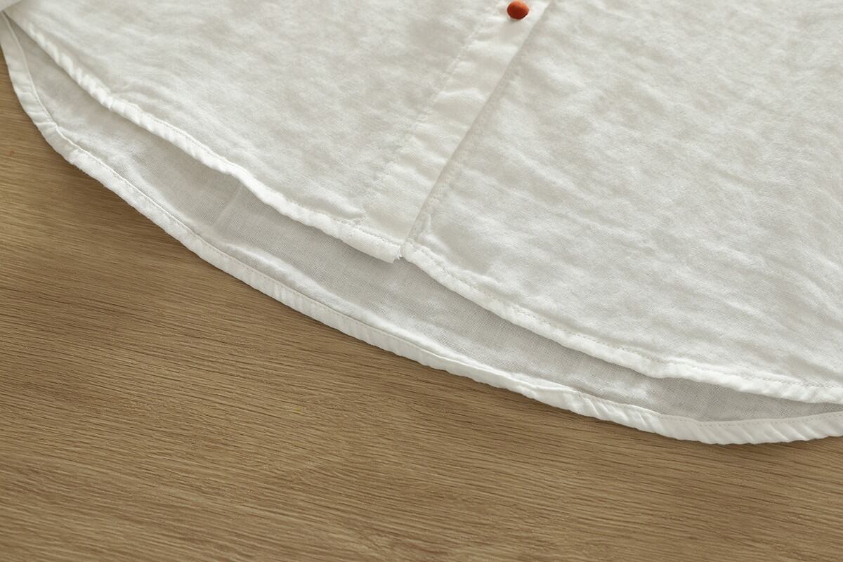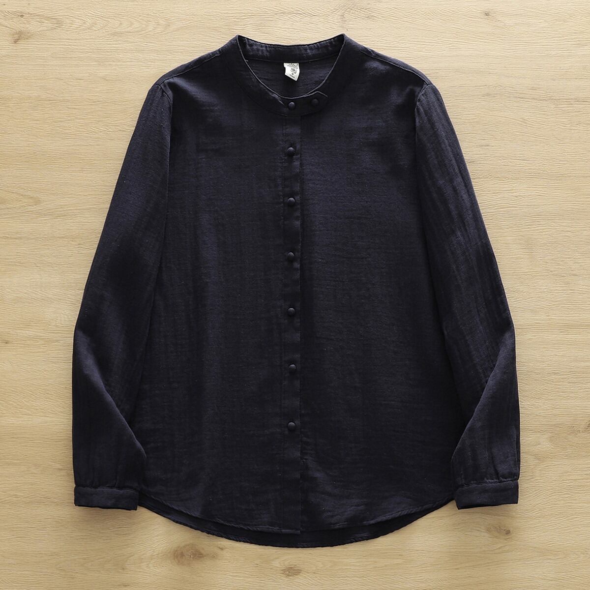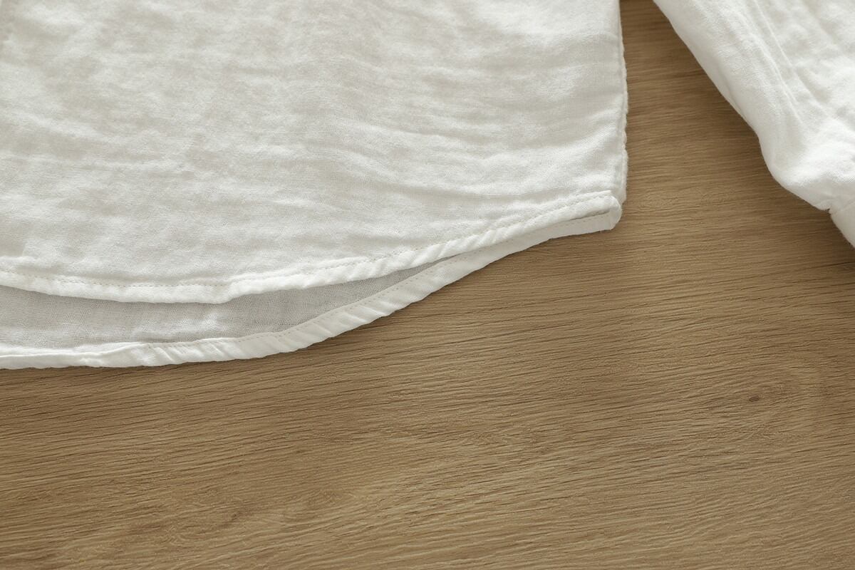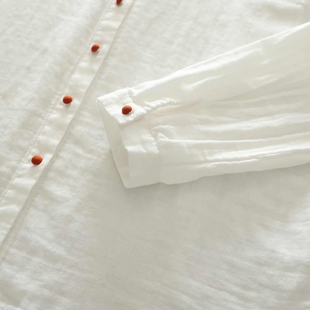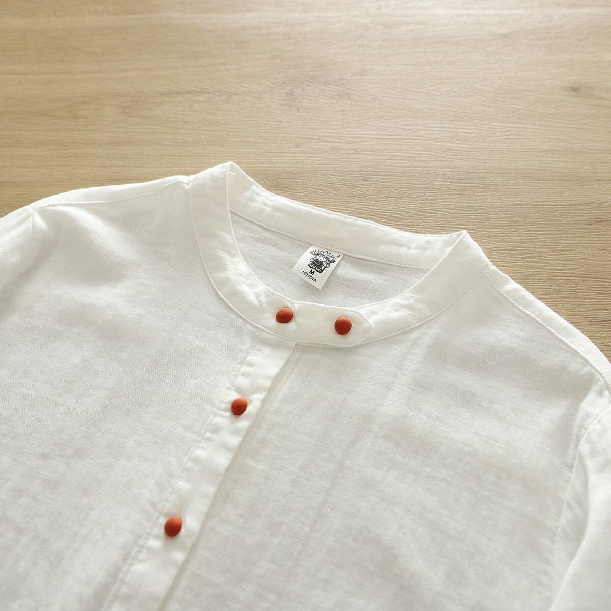 ノーカラーデザインが女性らしさを引き立て、ボタン付きの前開きスタイルで抜け感を演出します。