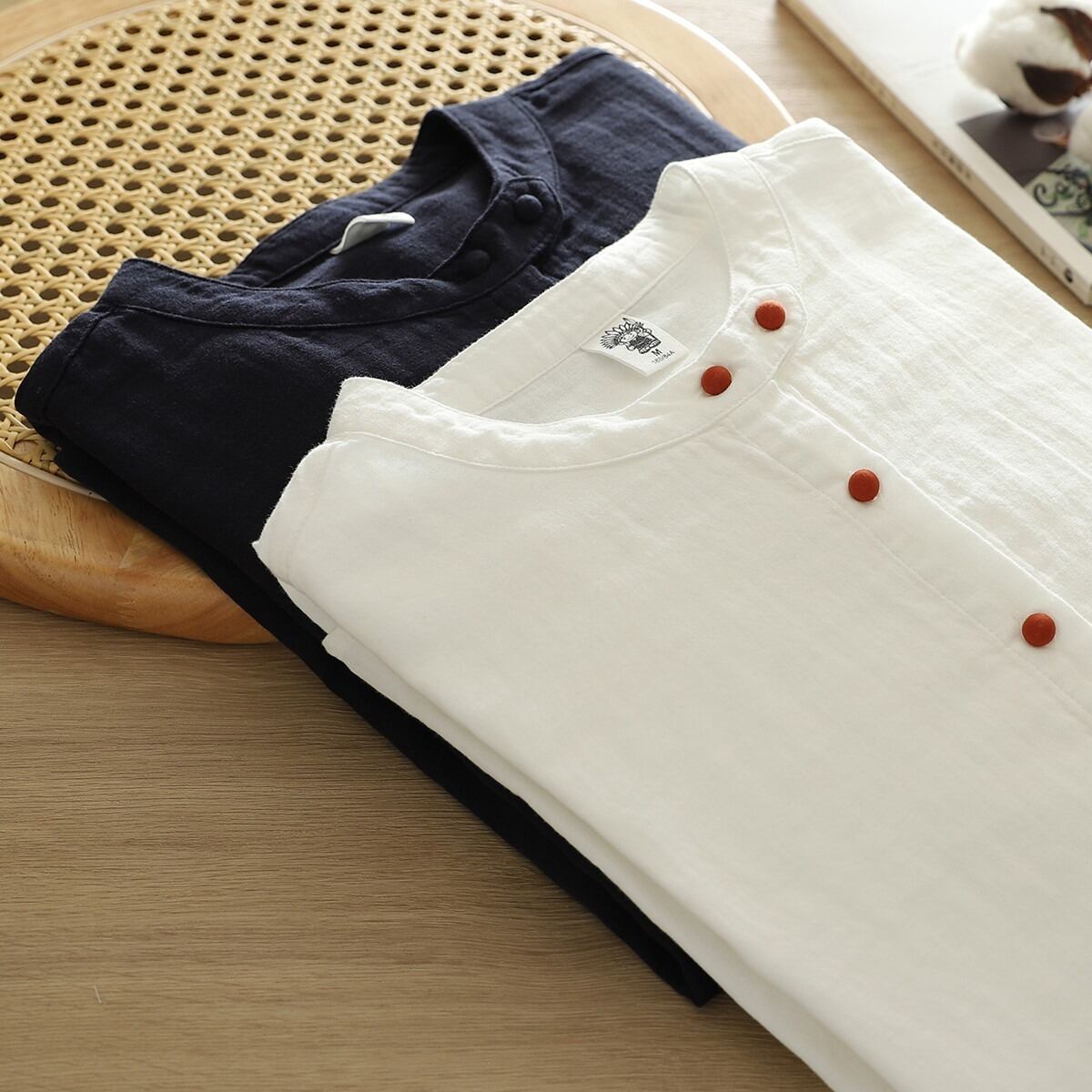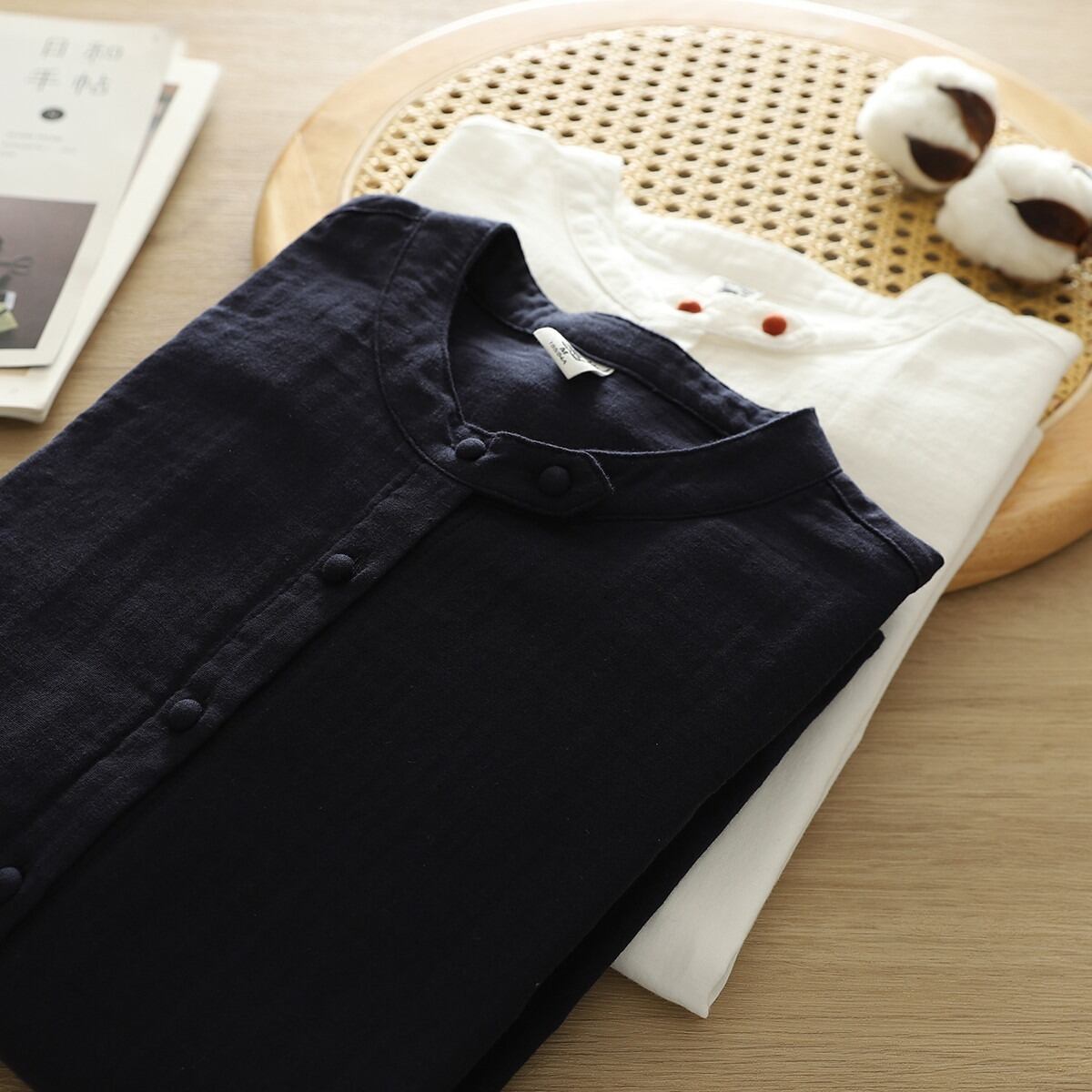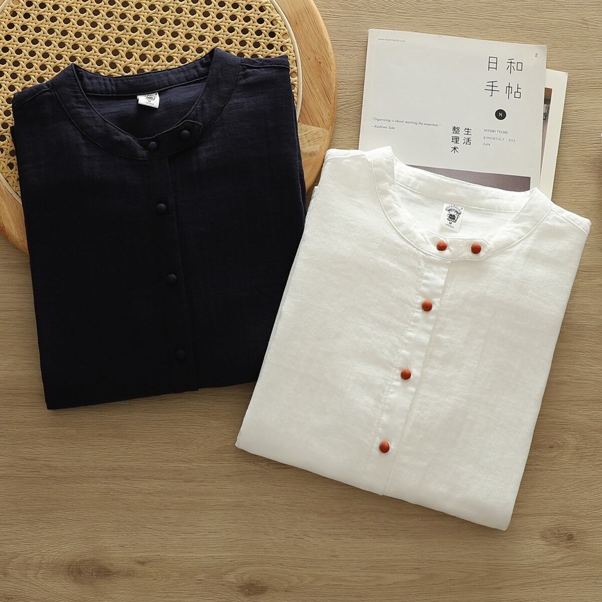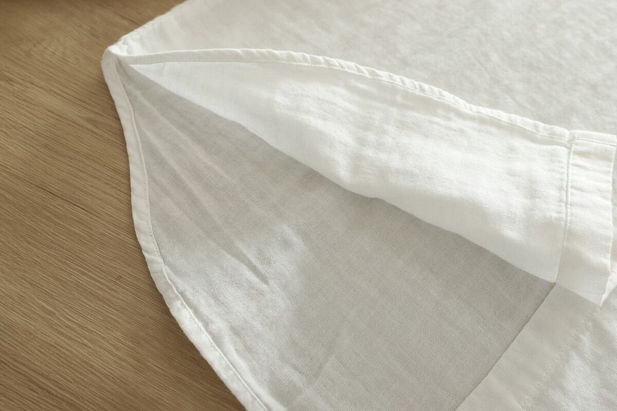 ノーカラーデザインが女性らしさを引き立て、ボタン付きの前開きスタイルで抜け感を演出します。