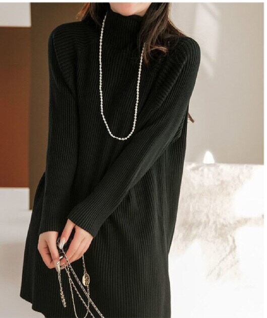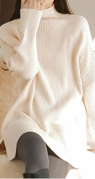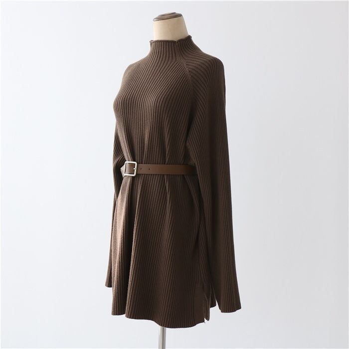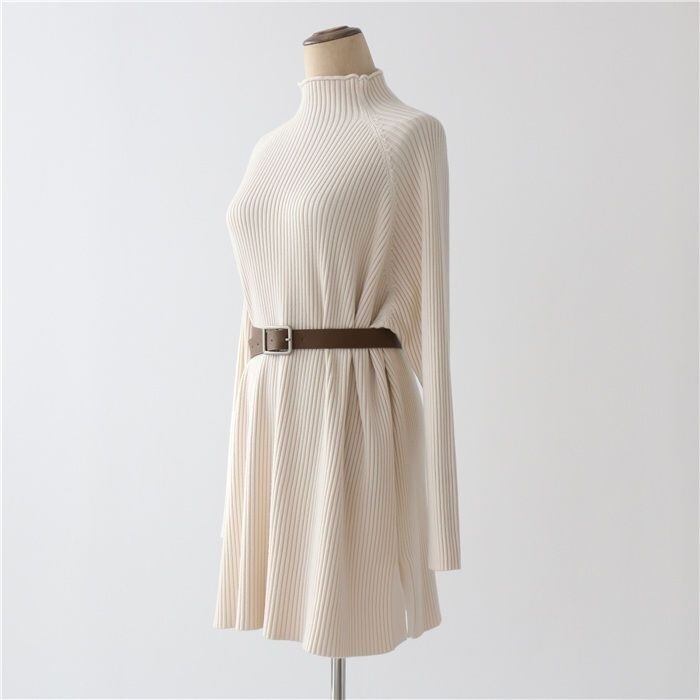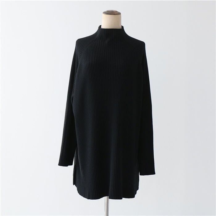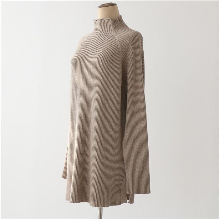 プルオーバータイプでハイネックデザインが首元をすっきりと見せ、萌袖の長袖が女性らしさを演出します。