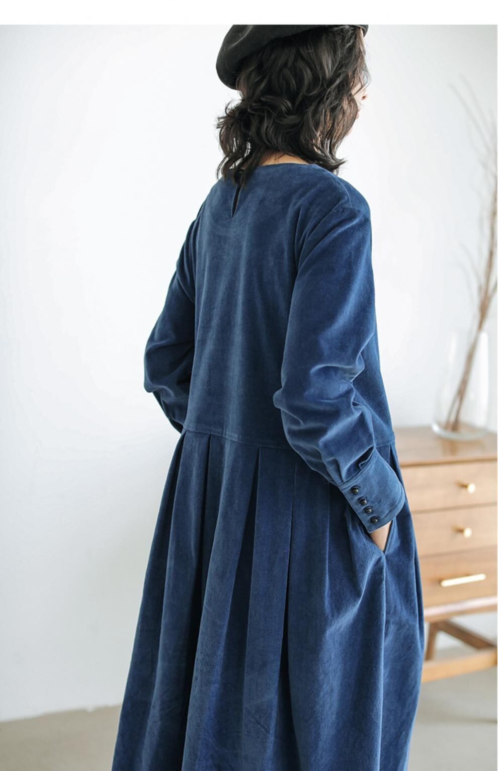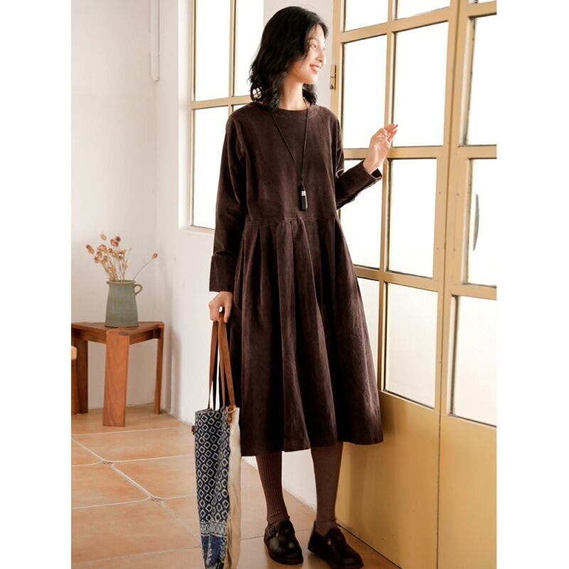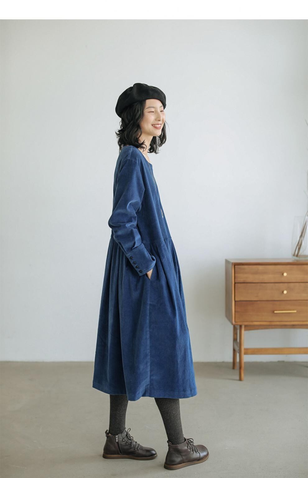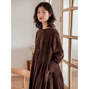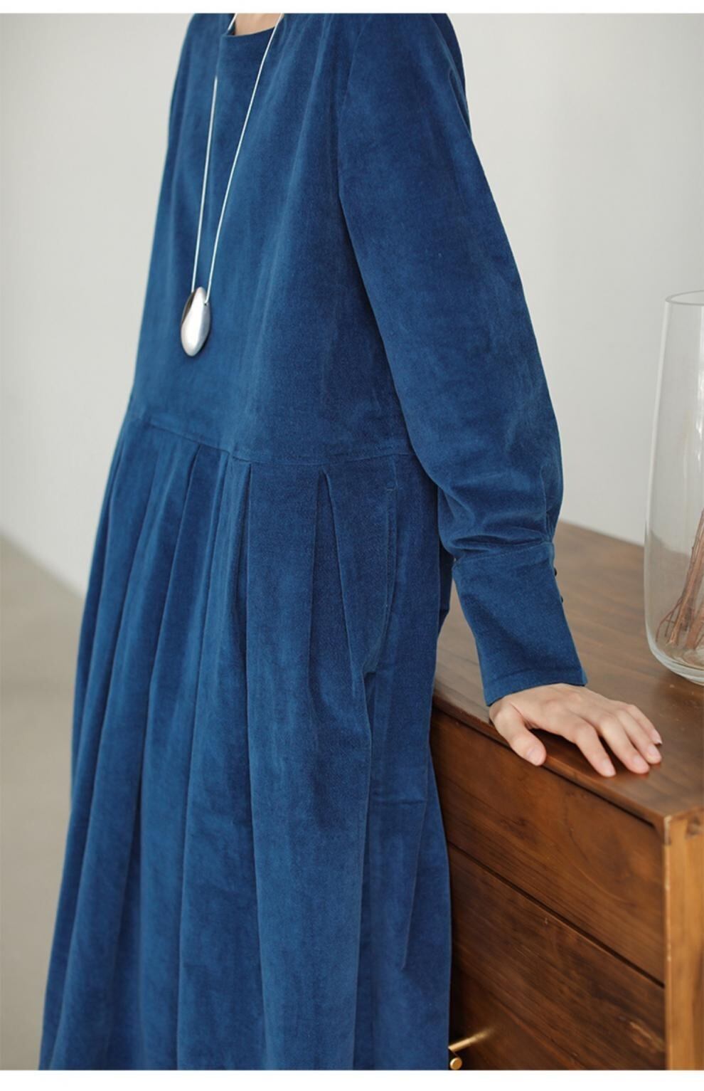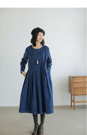 膝下丈に長袖カフスリーブが上品さを演出し、Uネックでデコルテラインを美しく見せます。