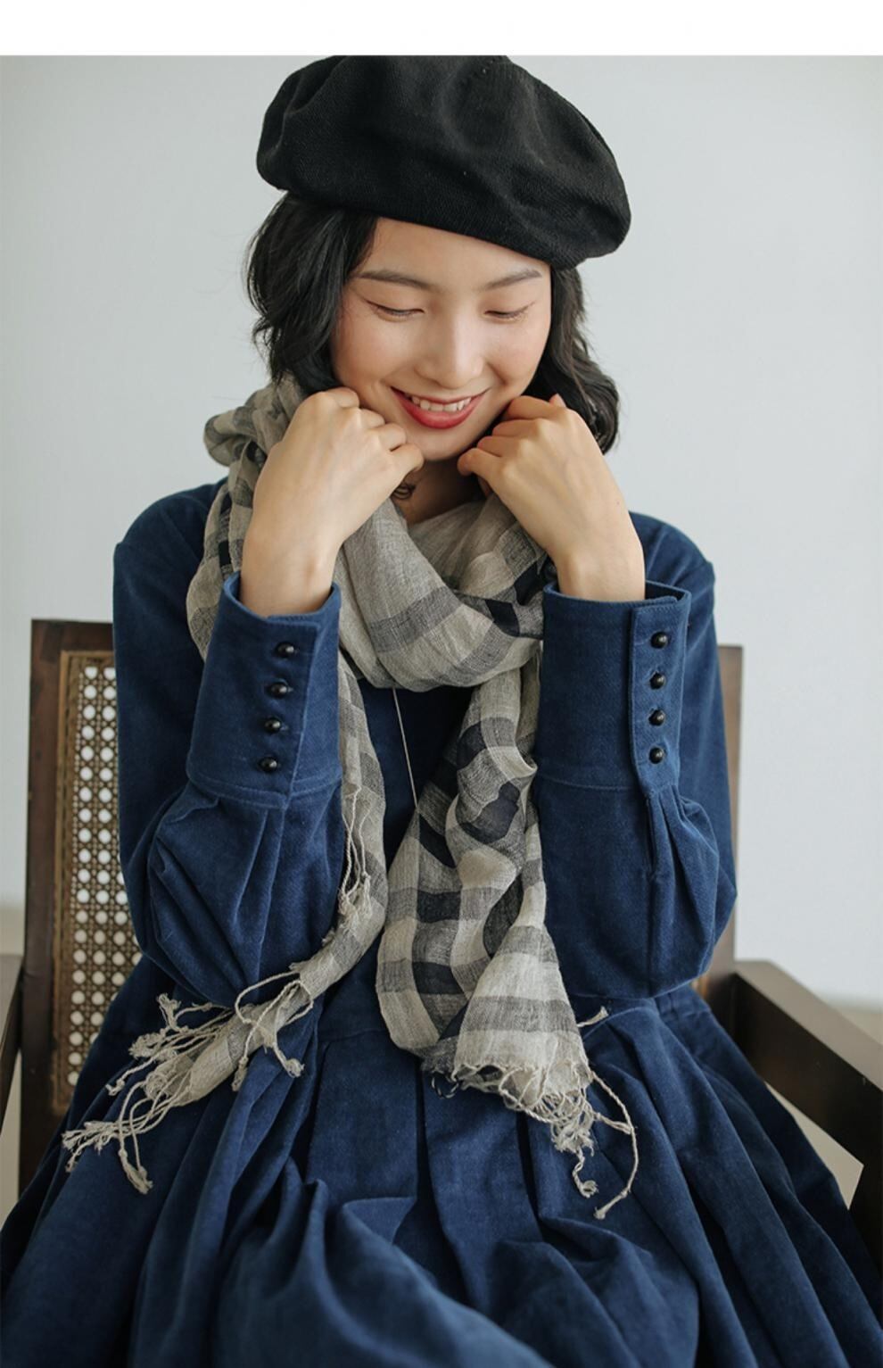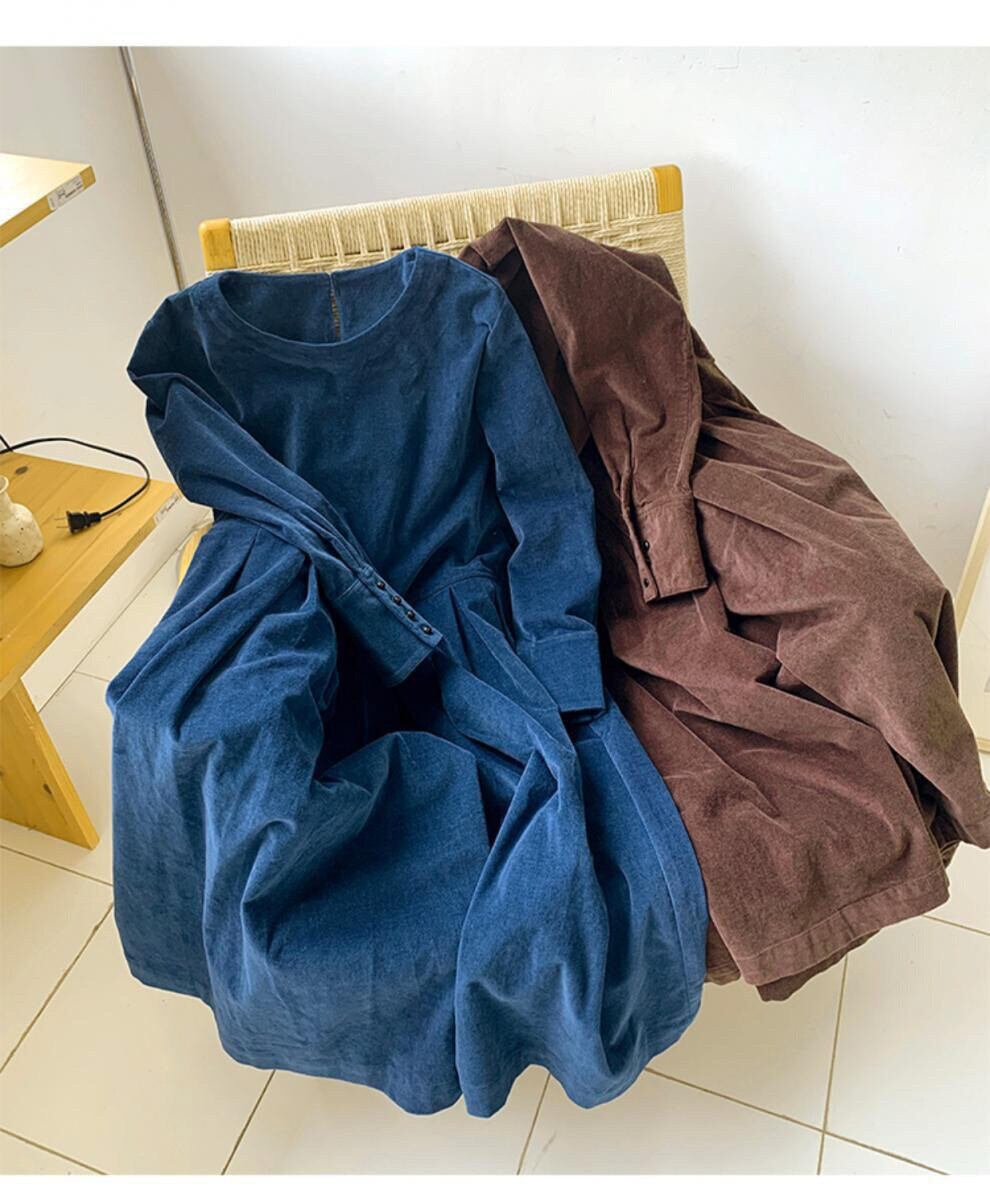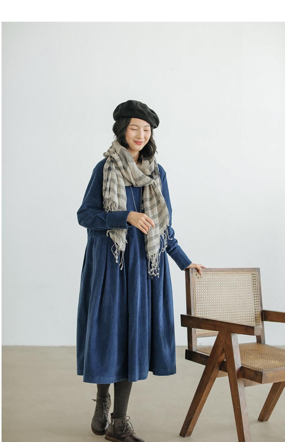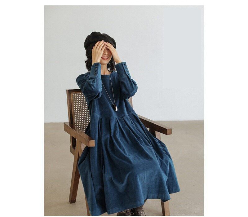 膝下丈に長袖カフスリーブが上品さを演出し、Uネックでデコルテラインを美しく見せます。