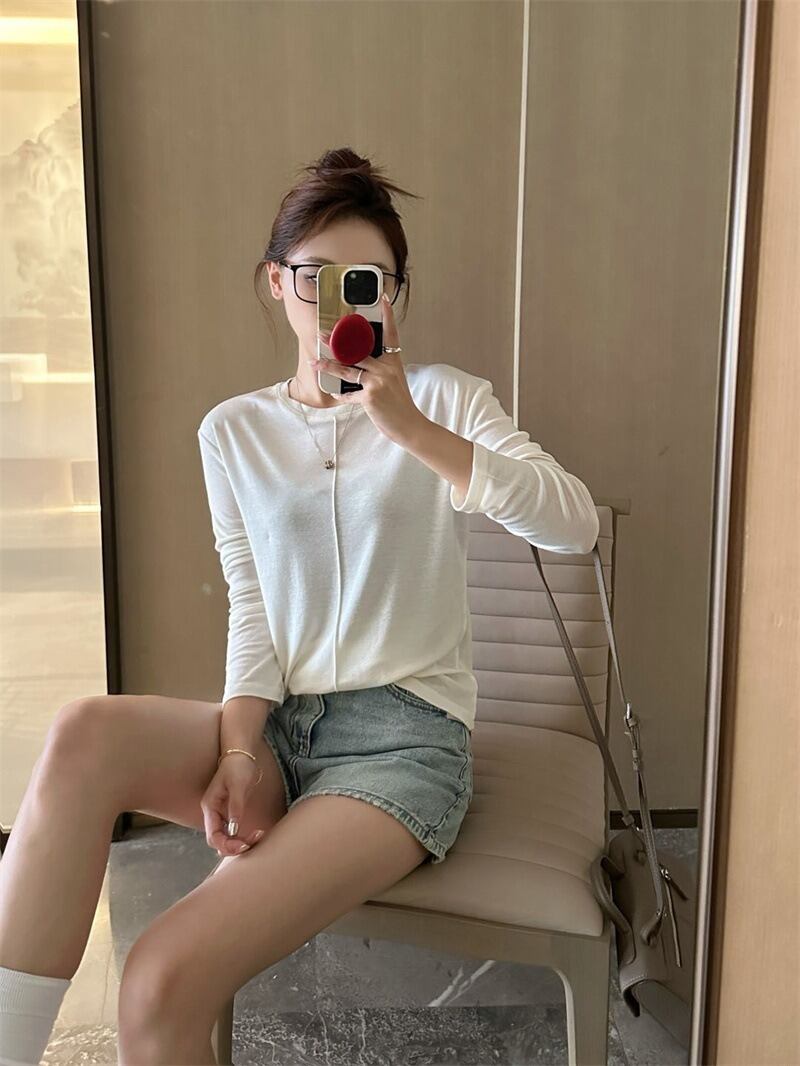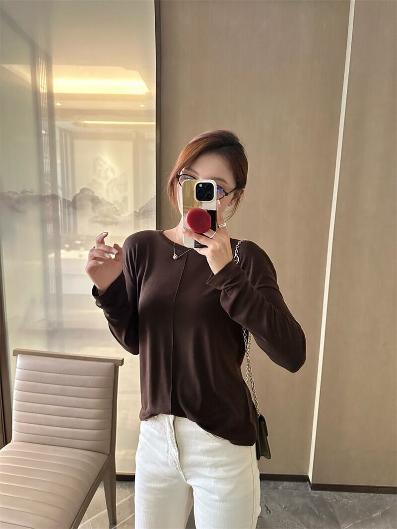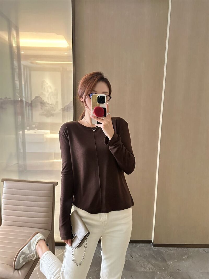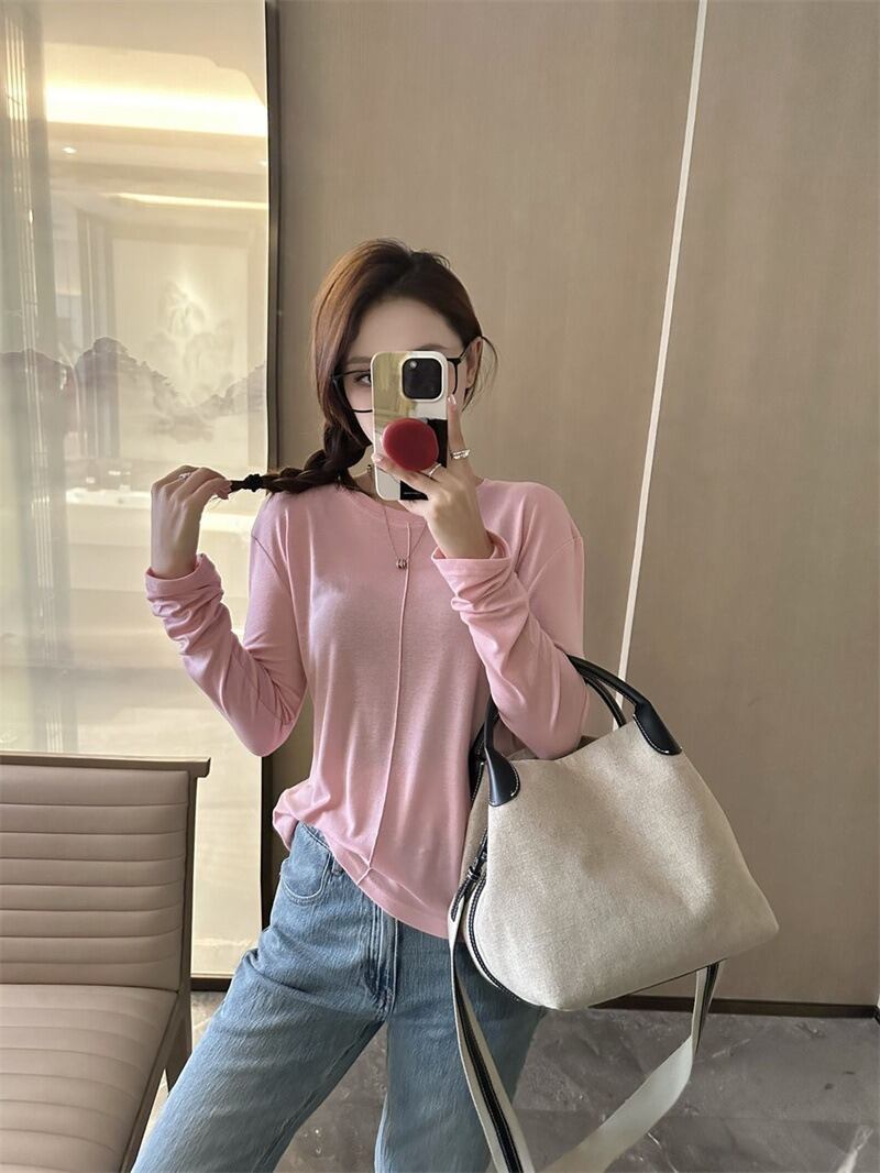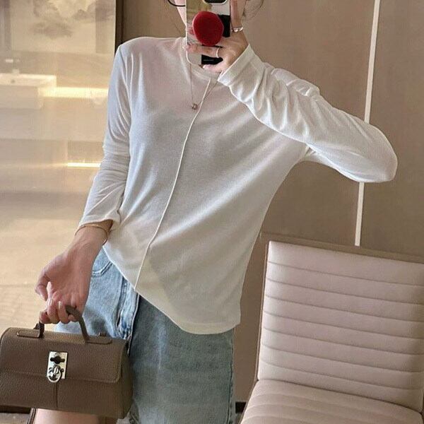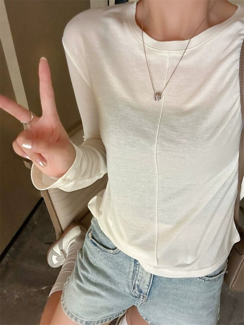ラウンドネックデザインと薄手の素材感で、春や秋のデイリーユースにぴったりなアイテムです。