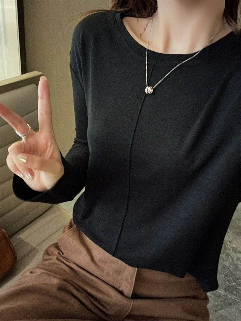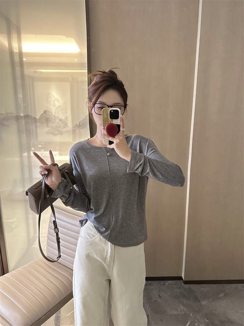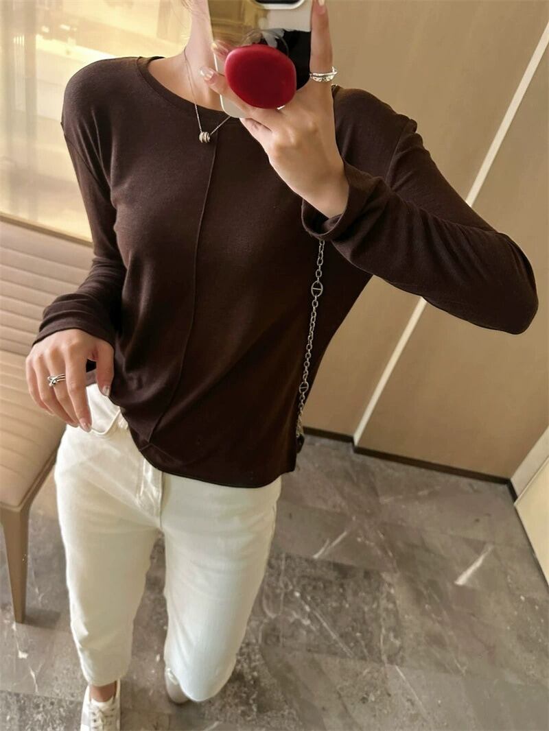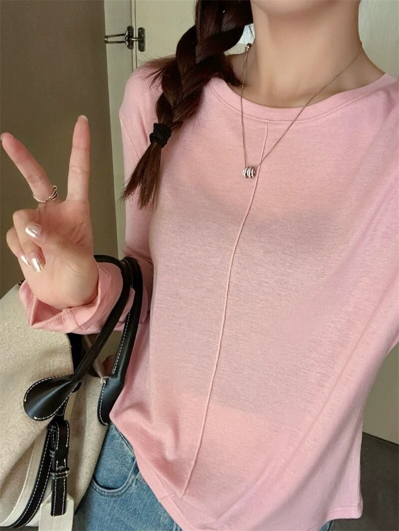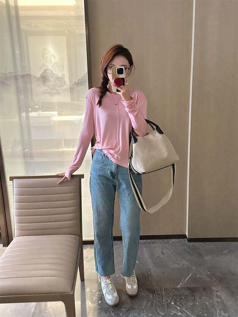 ラウンドネックデザインと薄手の素材感で、春や秋のデイリーユースにぴったりなアイテムです。