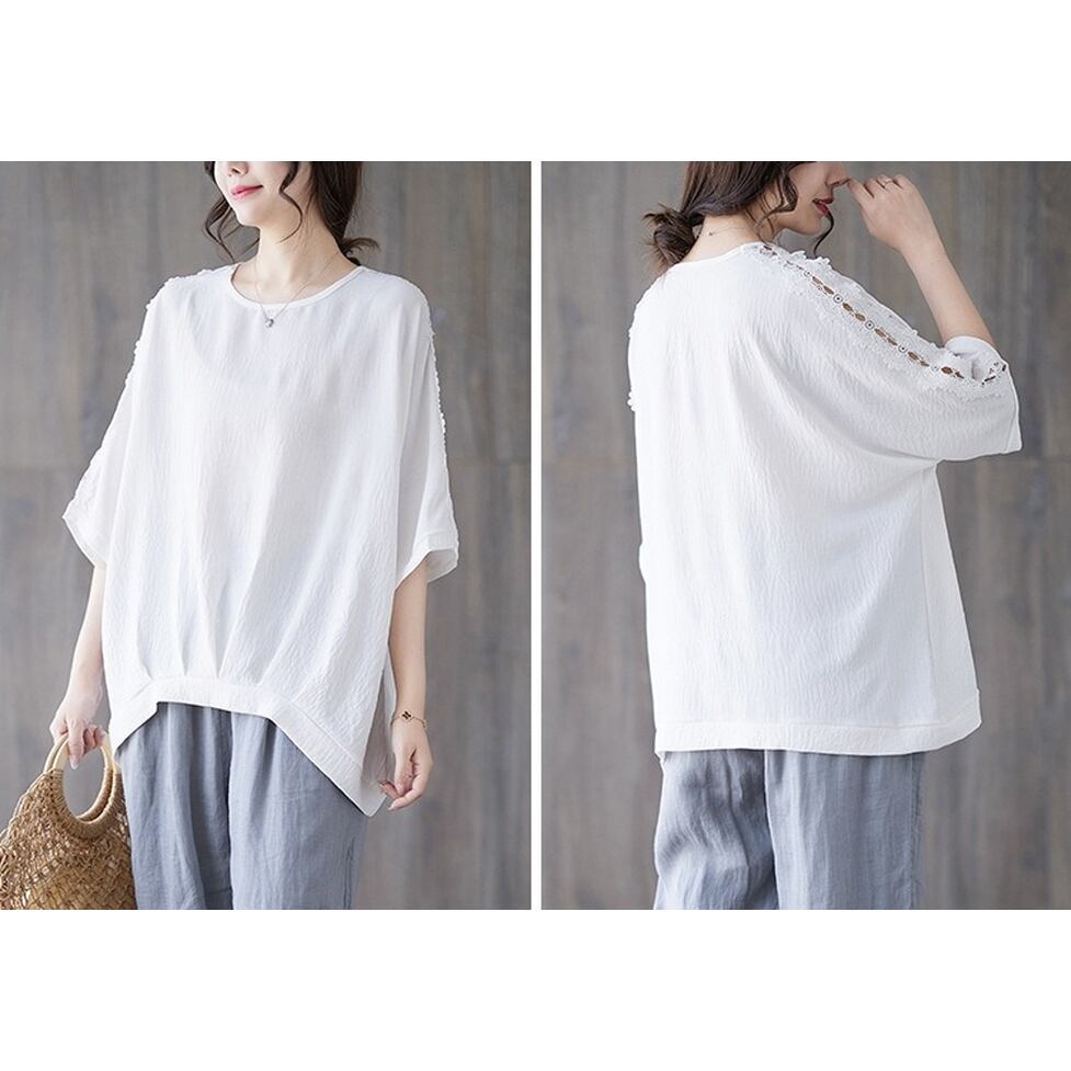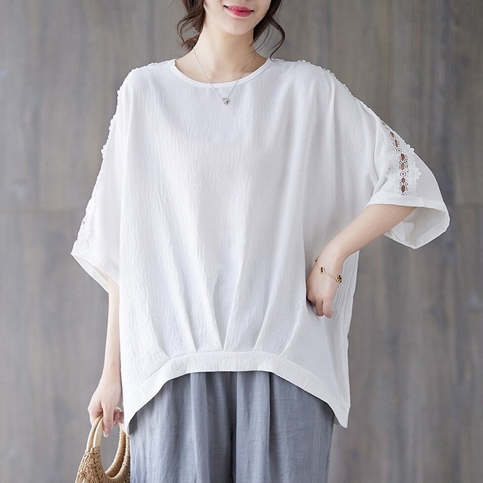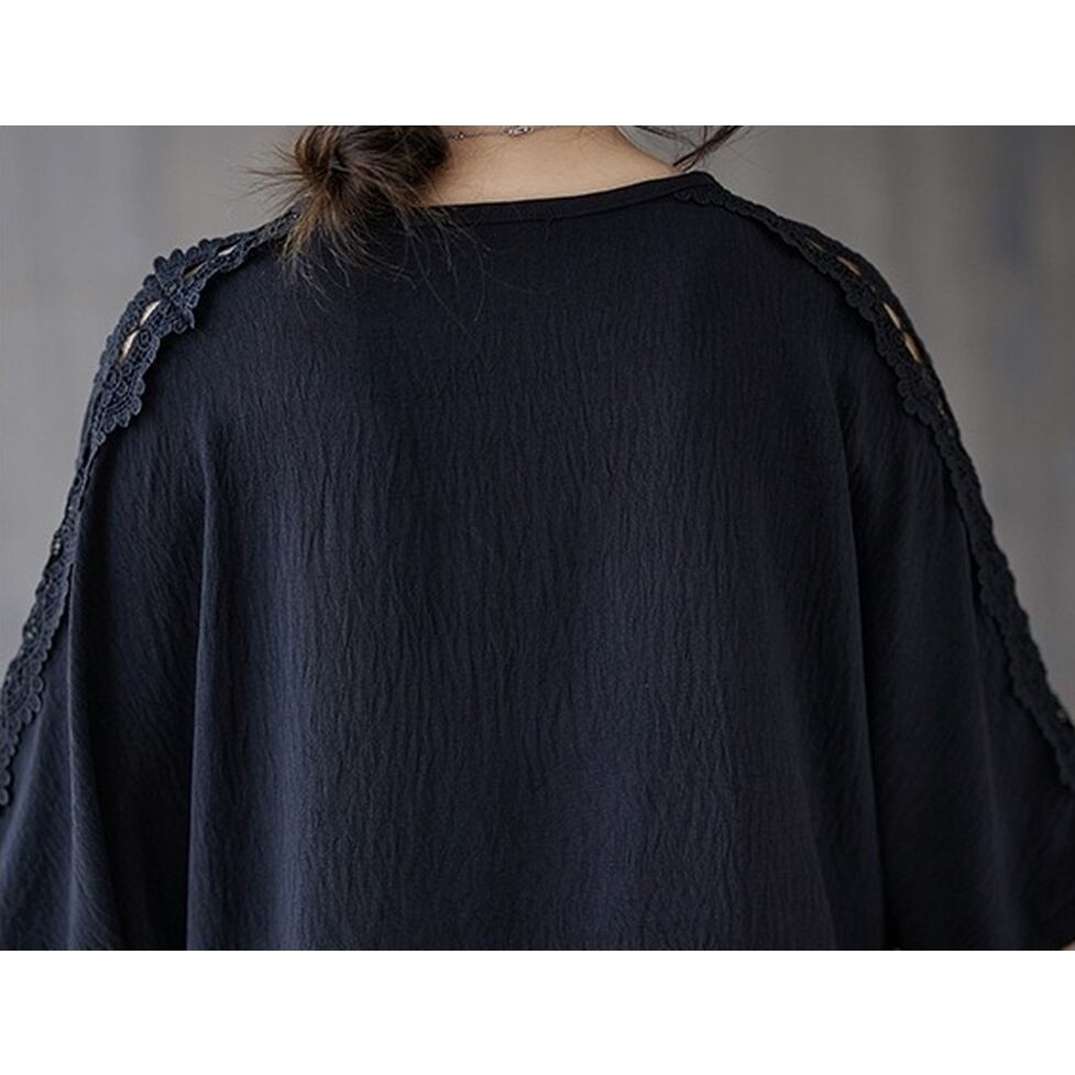 ショルダーから袖のラインに透け感のあるレースを配置したレトロカジュアルなシャツブラウス。