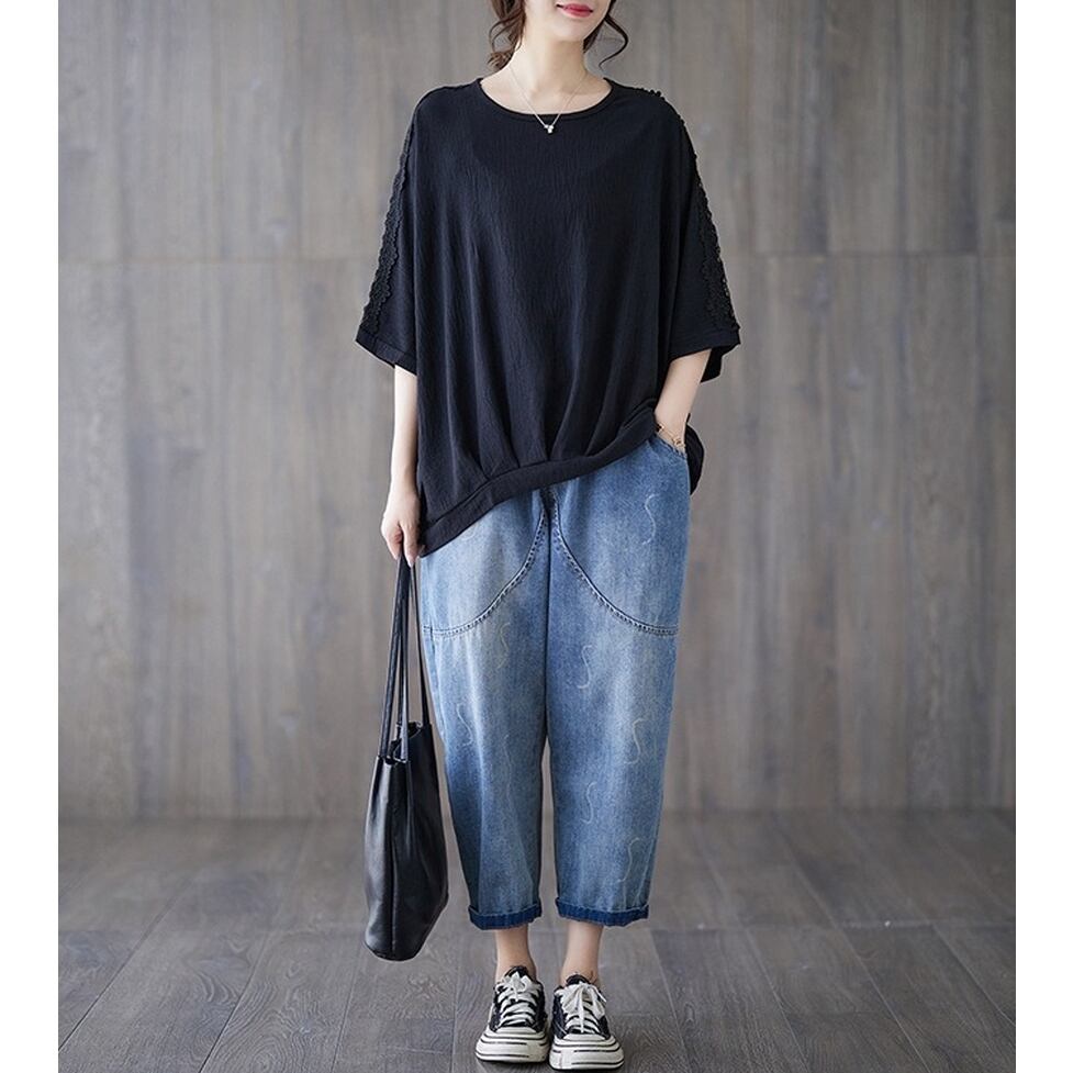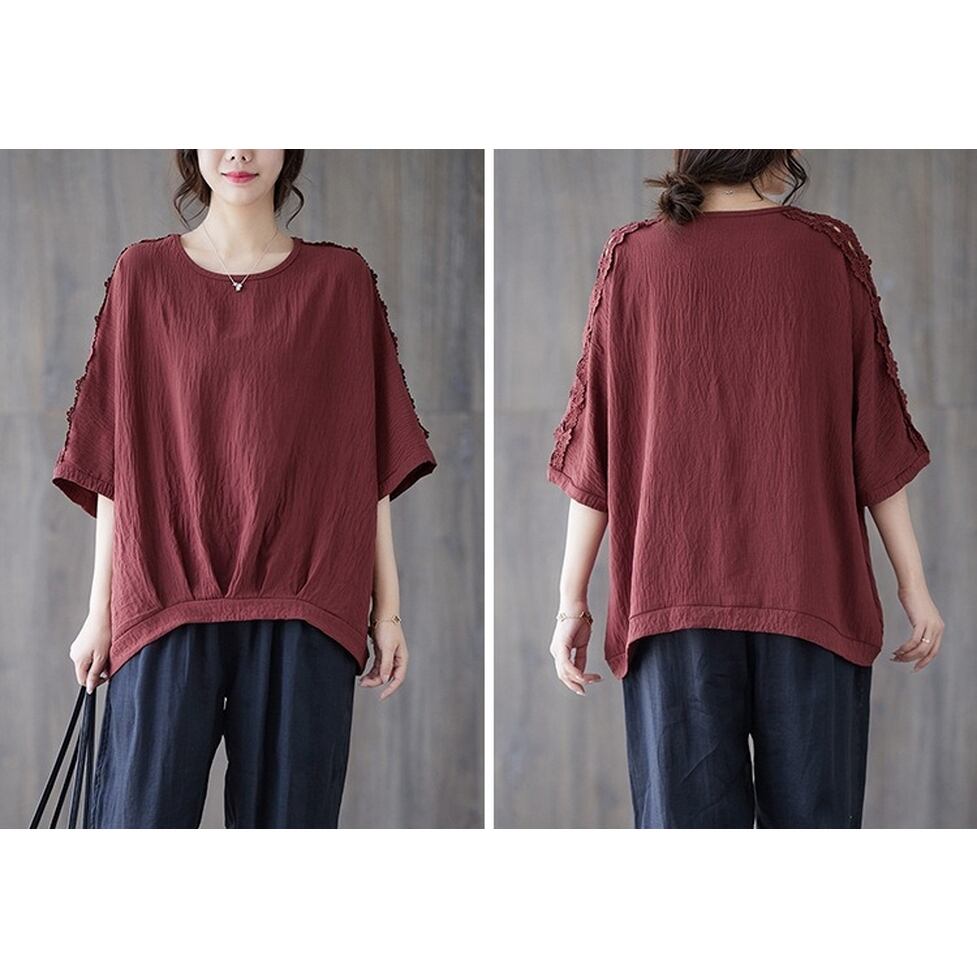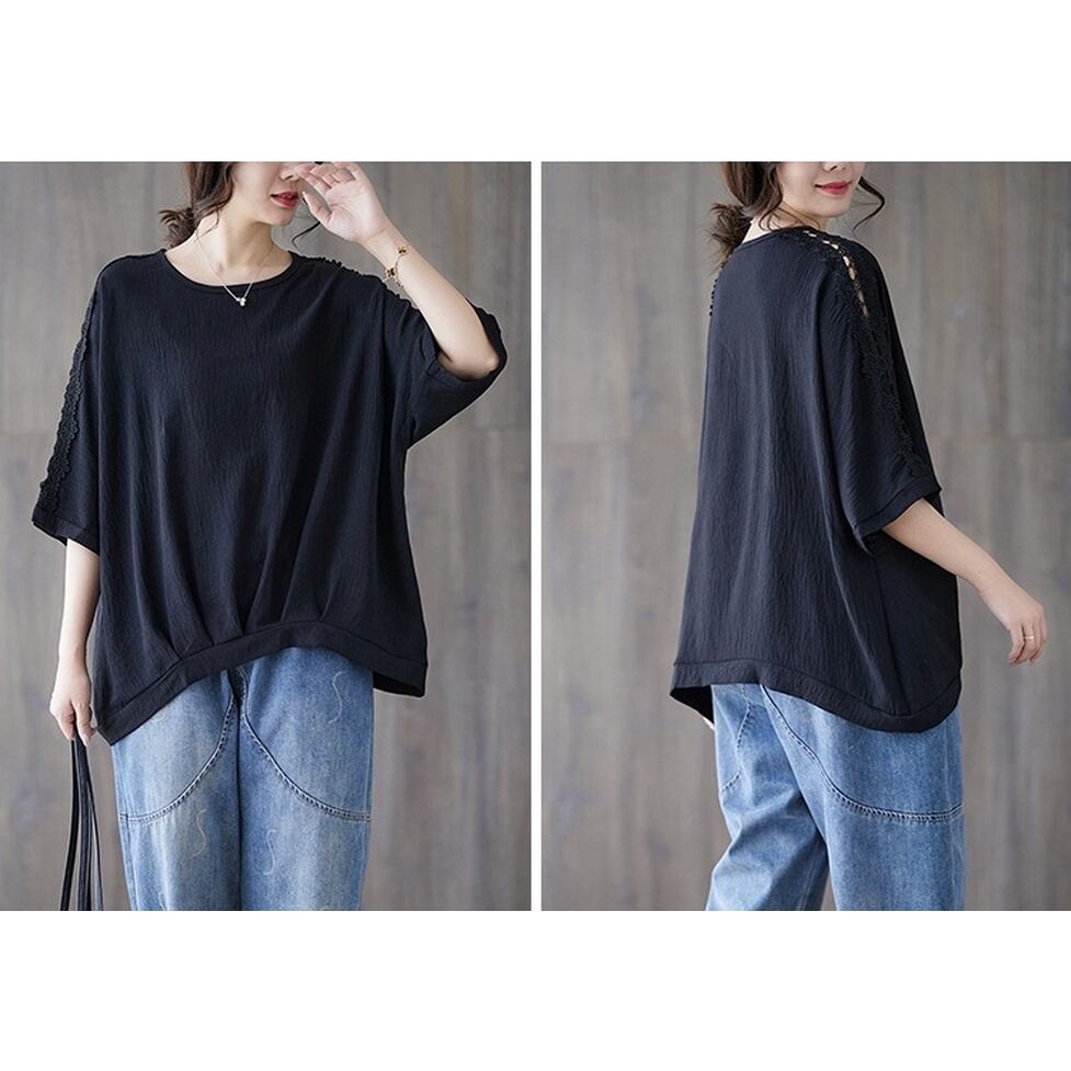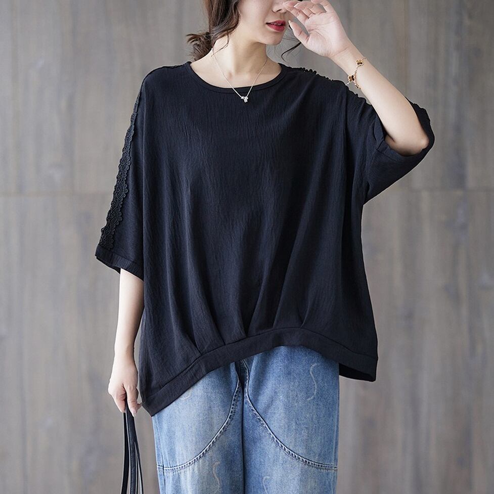ショルダーから袖のラインに透け感のあるレースを配置したレトロカジュアルなシャツブラウス。