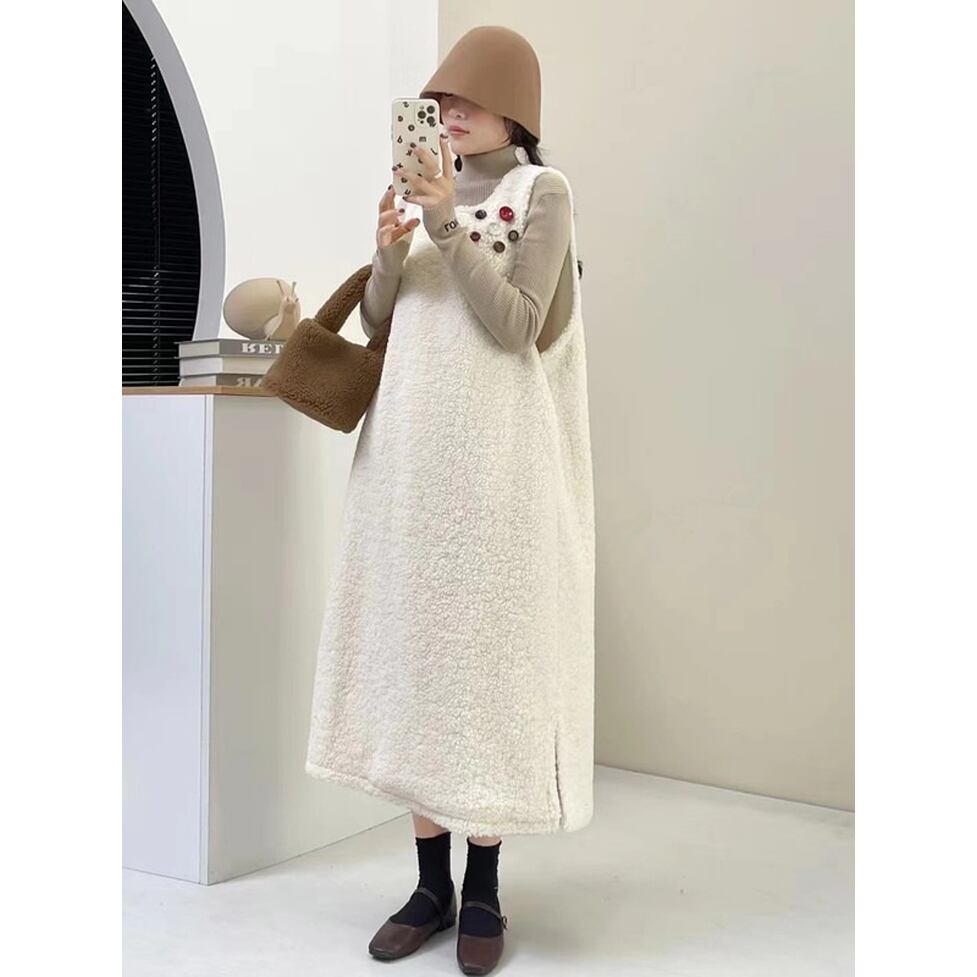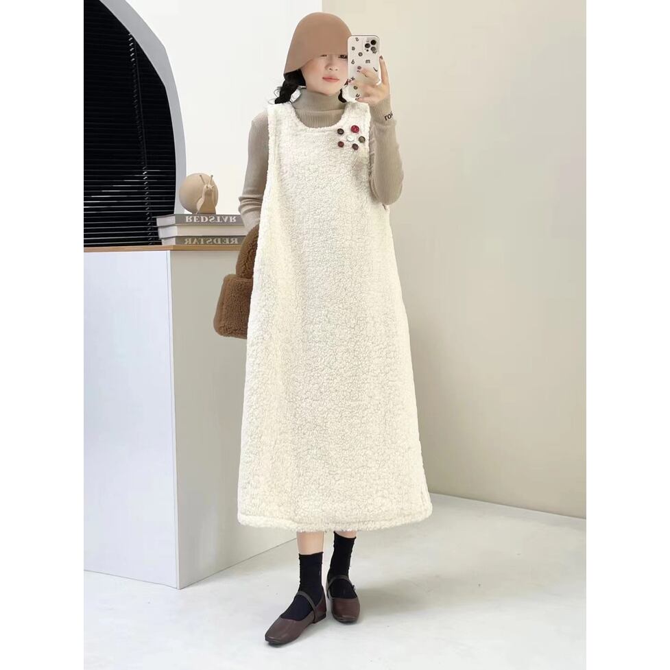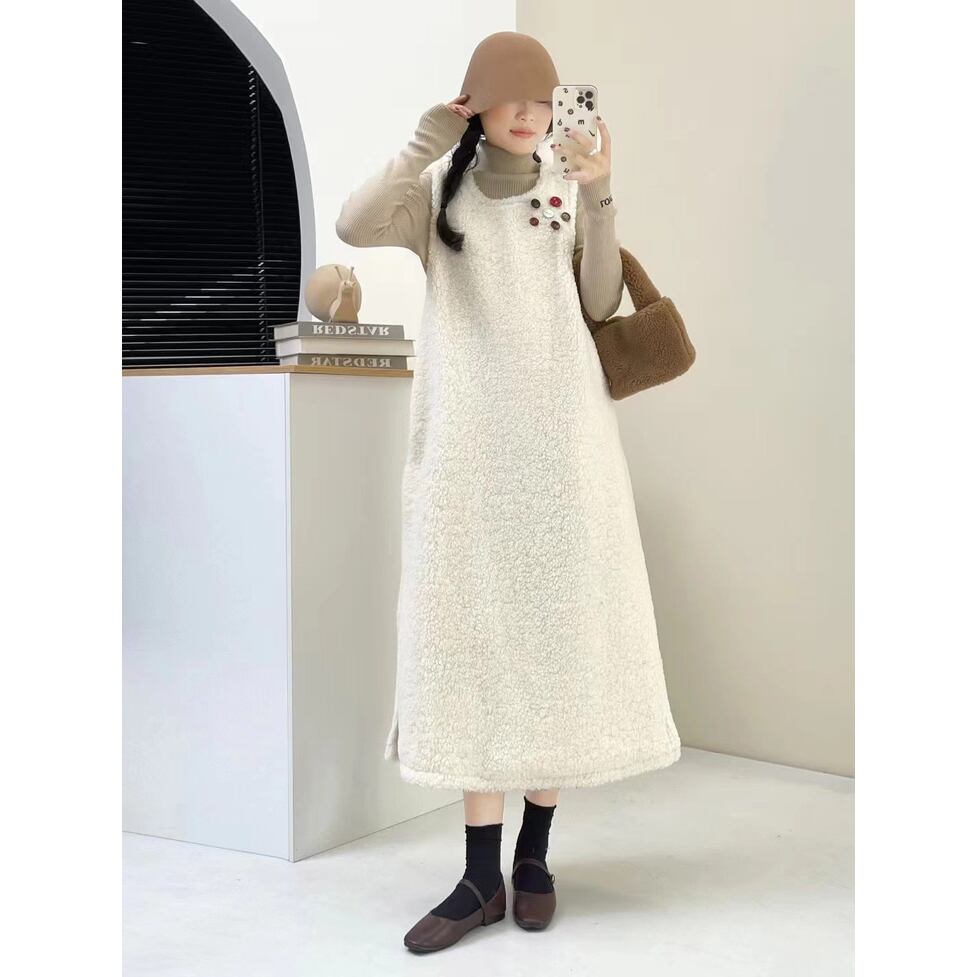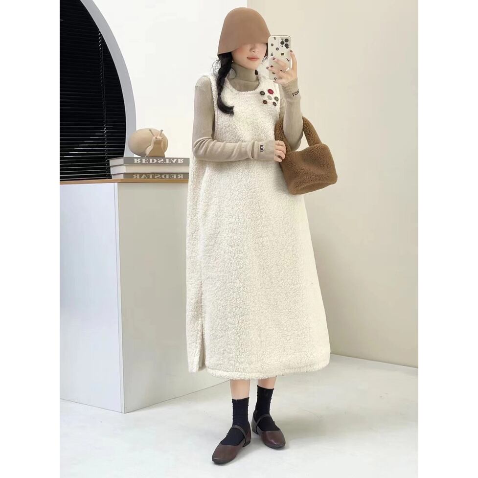 ワンショルダー下のボタンがアクセントになったもこもこニットが可愛いノースリーブオーバーワンピース。