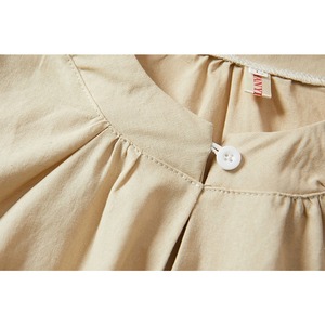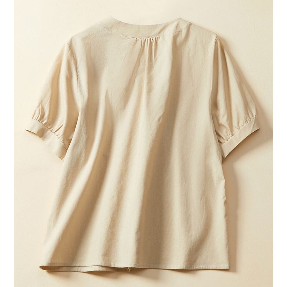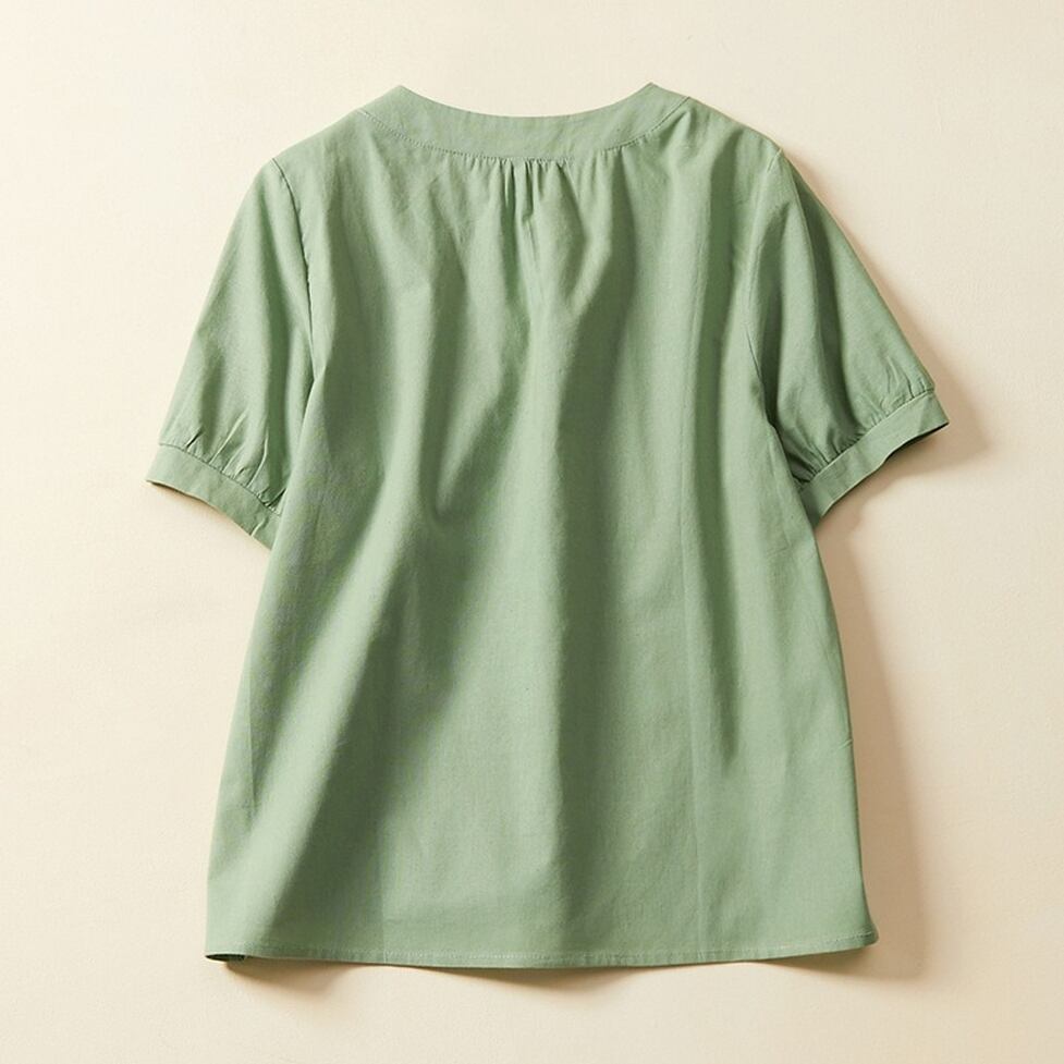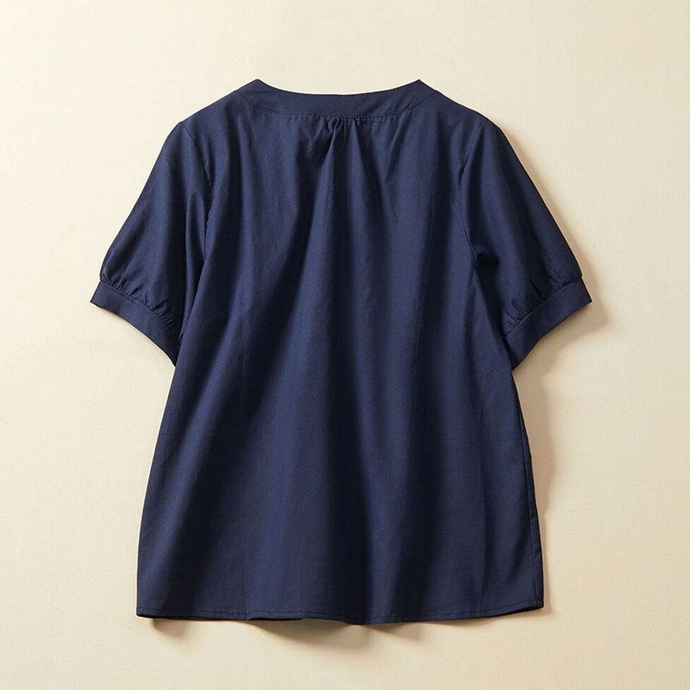 ネックラインのボタンとギャザーが高見えさせてくれるシャツ。