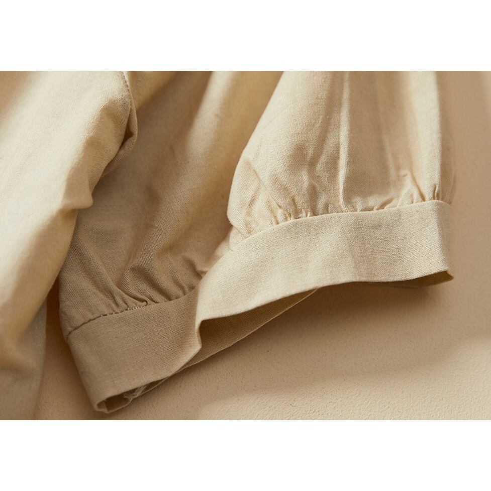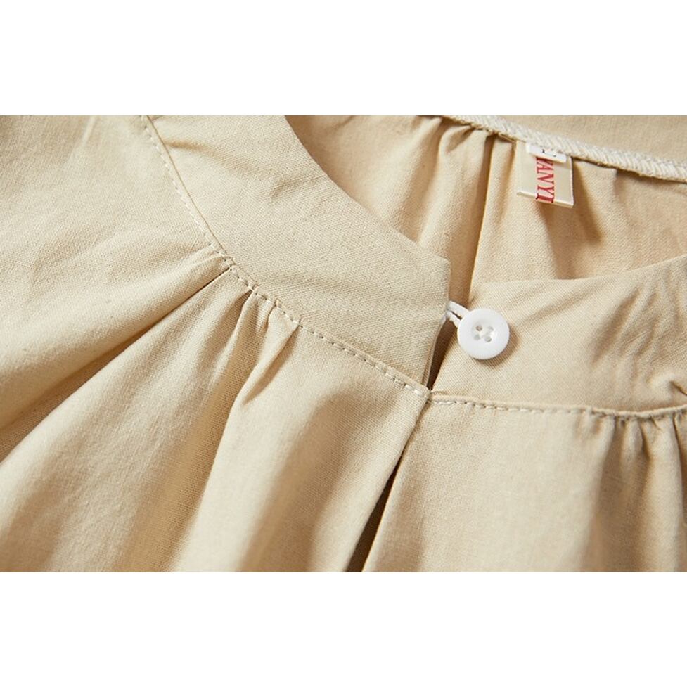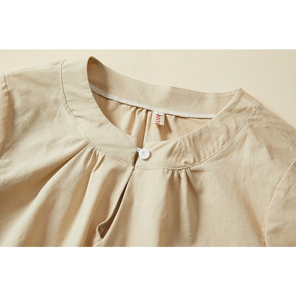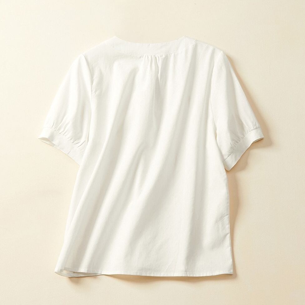 ネックラインのボタンとギャザーが高見えさせてくれるシャツ。