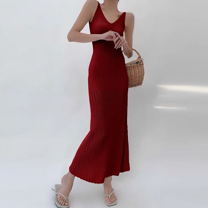 ノースリーブのVネックデザインが女性らしいラインを引き立て、スリムなシルエットが魅力的です。