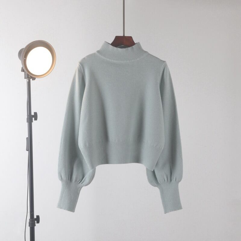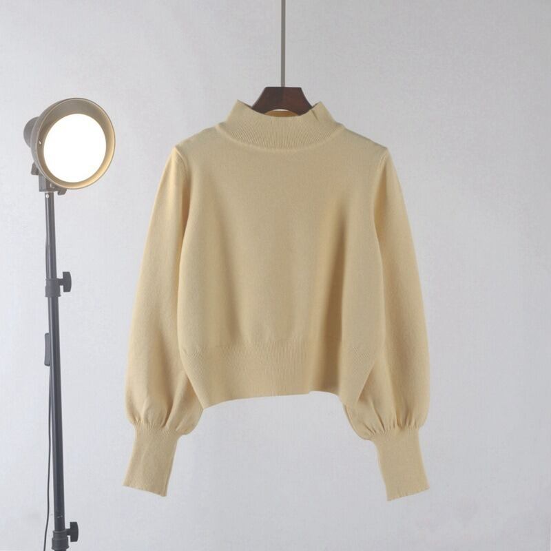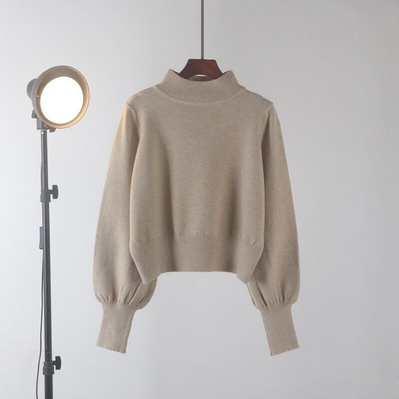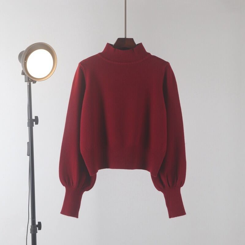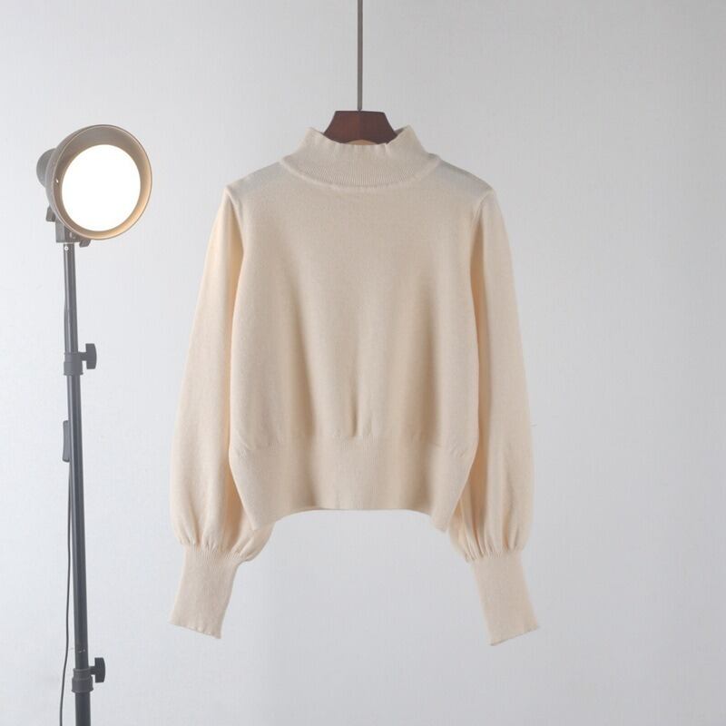 ハイネックとカフスリーブの組み合わせが大人可愛い印象を引き立てる、レディースニットセーターです。