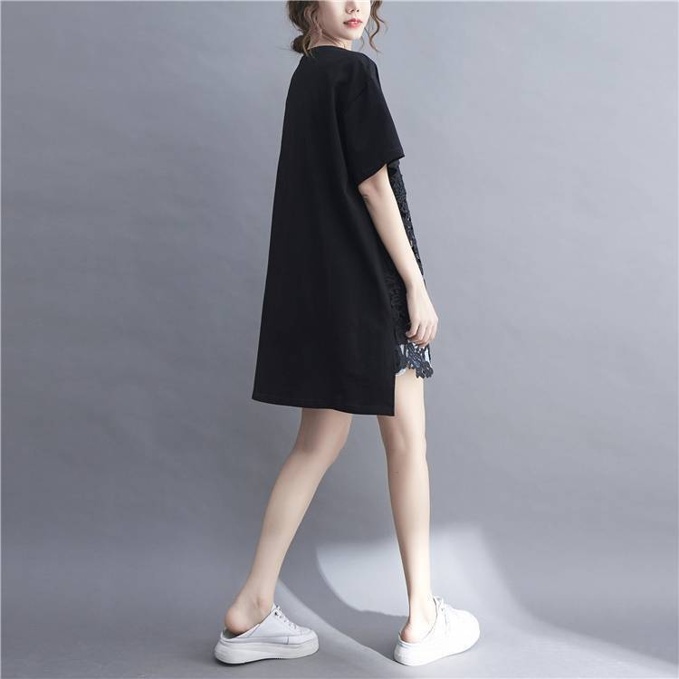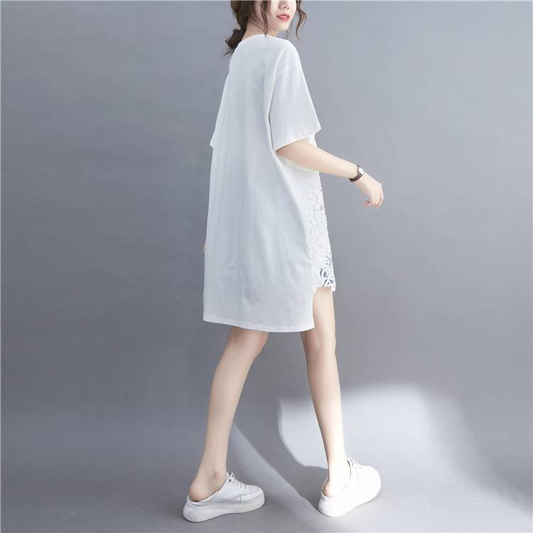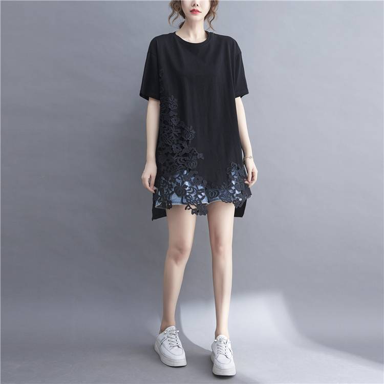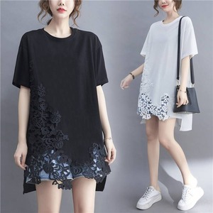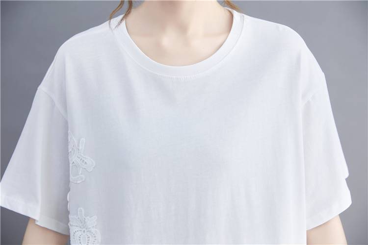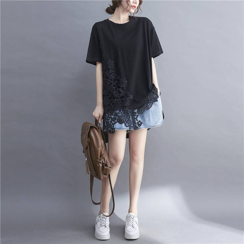 レースデザインが目を惹くクルーネック半袖Tシャツ。