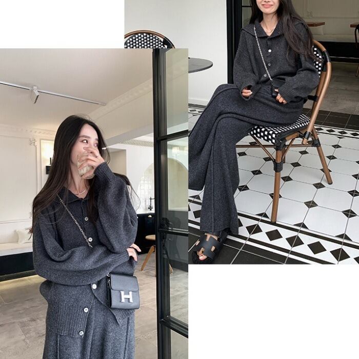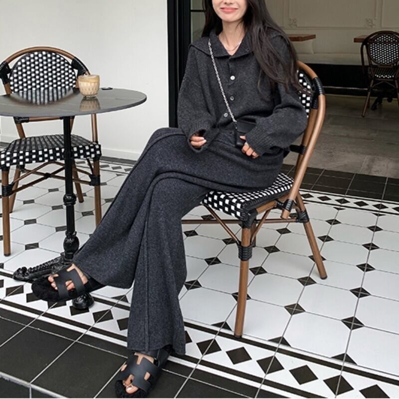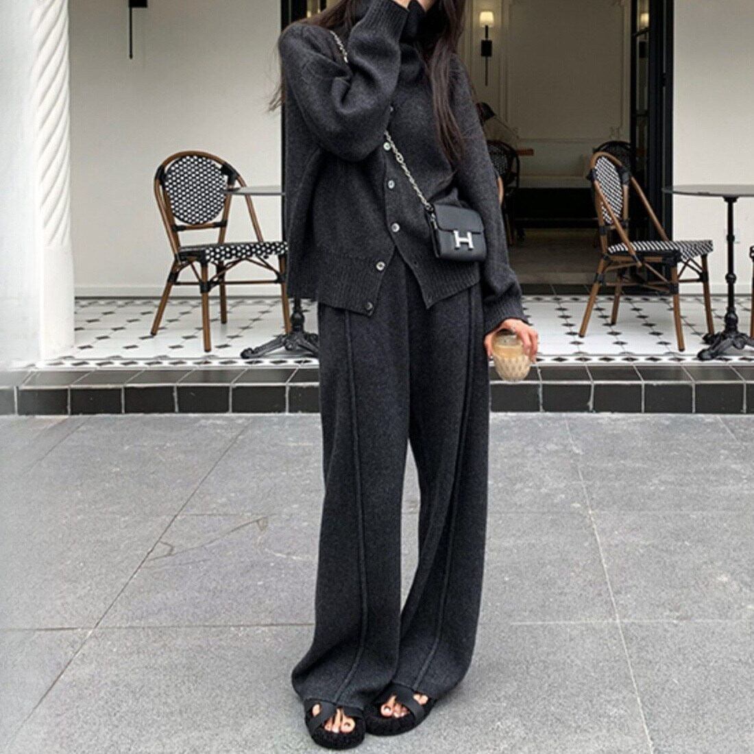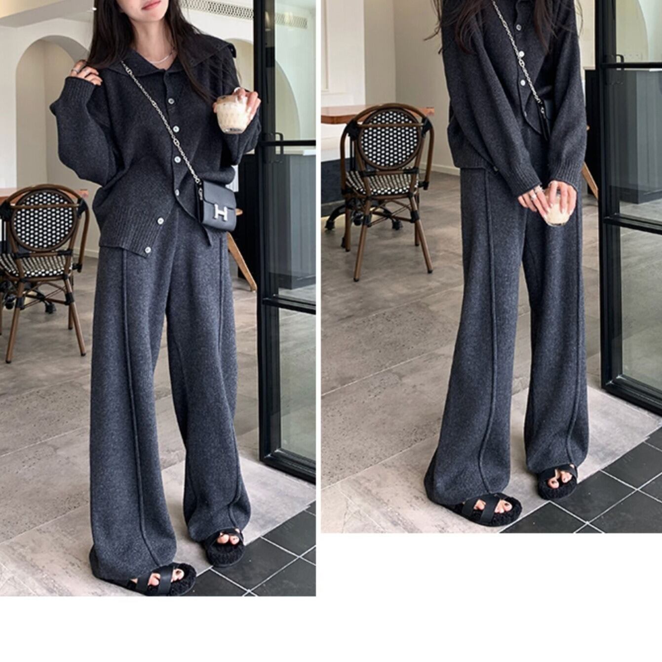 ニットセーターとストレートパンツの組み合わせで、スタイリッシュながらもリラックスした雰囲気を演出します。