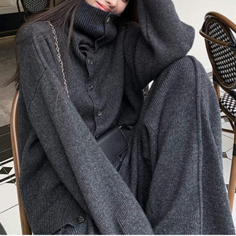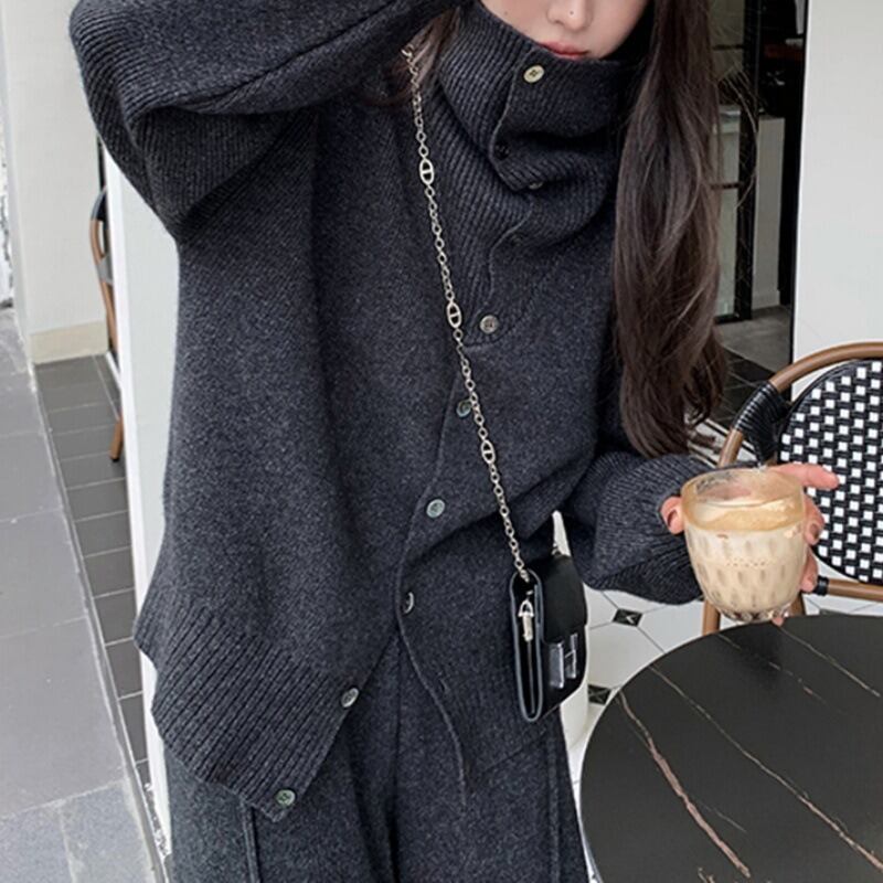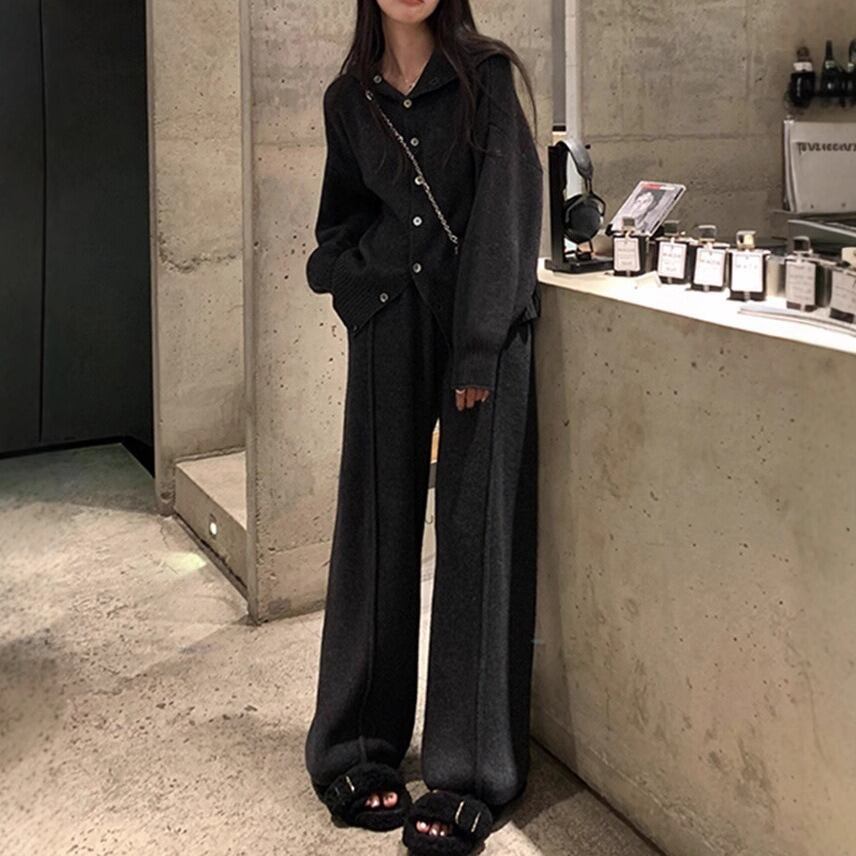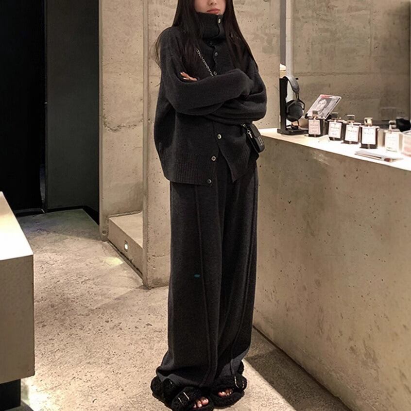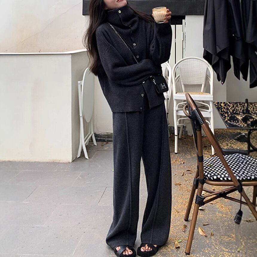 ニットセーターとストレートパンツの組み合わせで、スタイリッシュながらもリラックスした雰囲気を演出します。