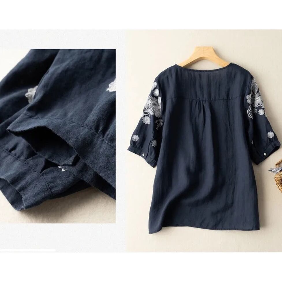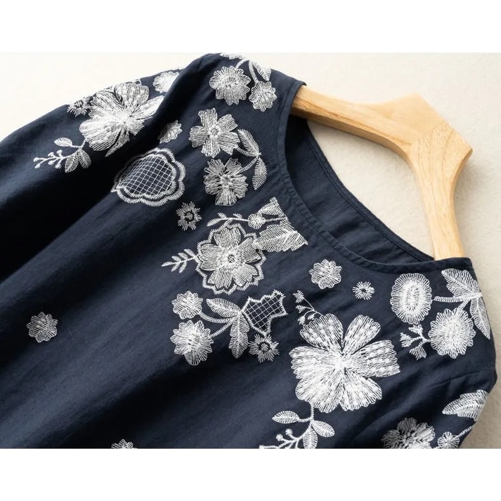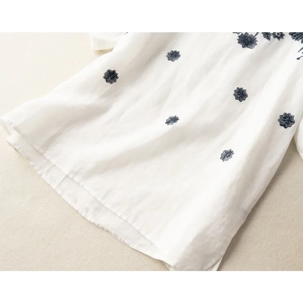シックな花柄がアクセントのシャツブラウス。