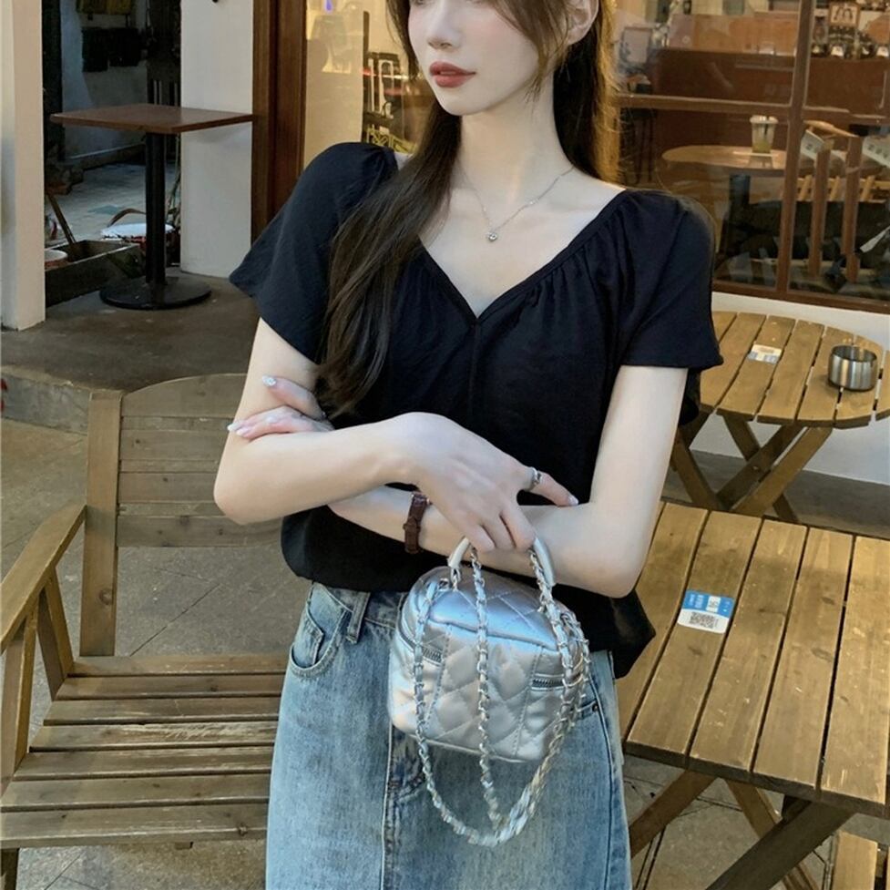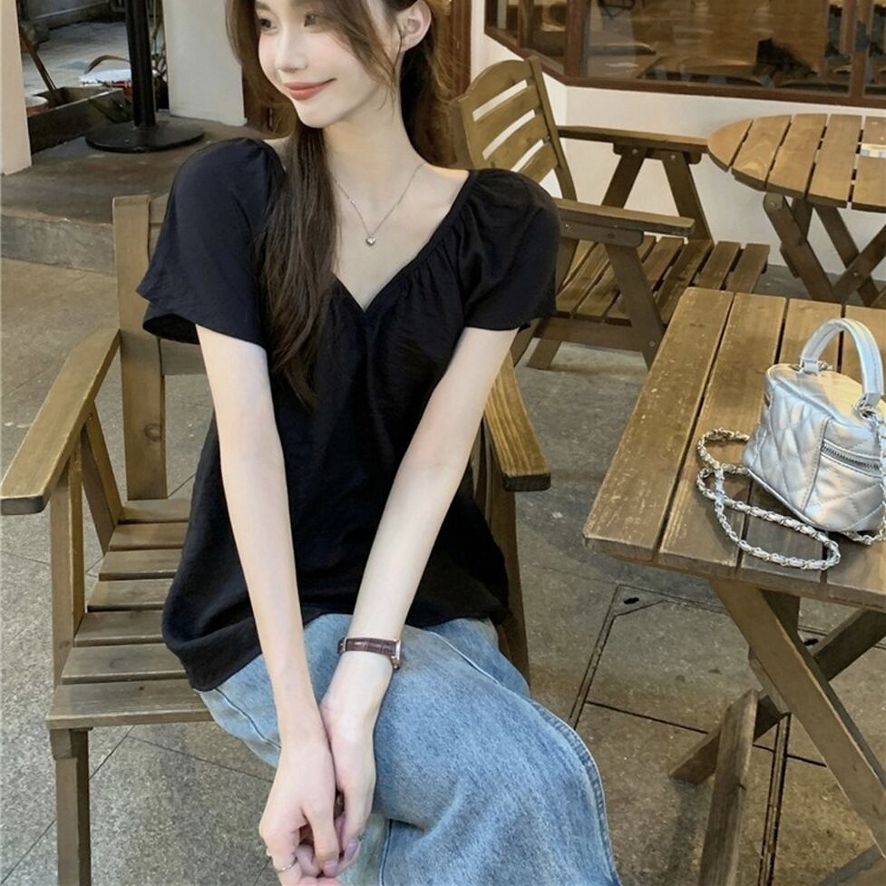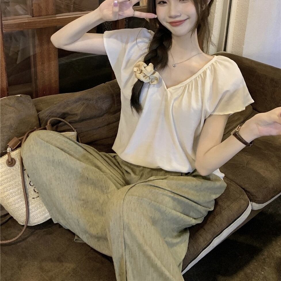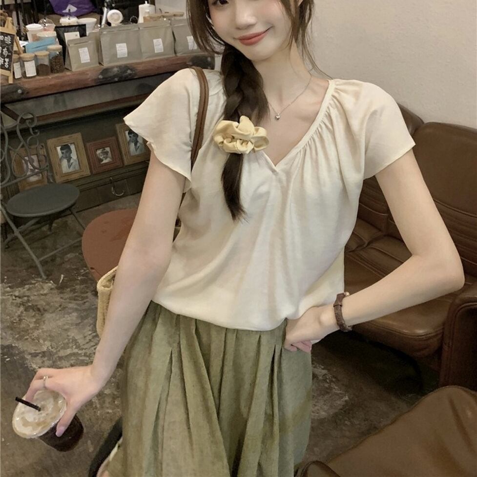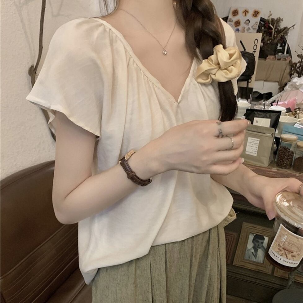 ネックラインのギャザーや軽やかにひらりとした袖の細やかなディティールをシンプルに落とし込んだシャツ。