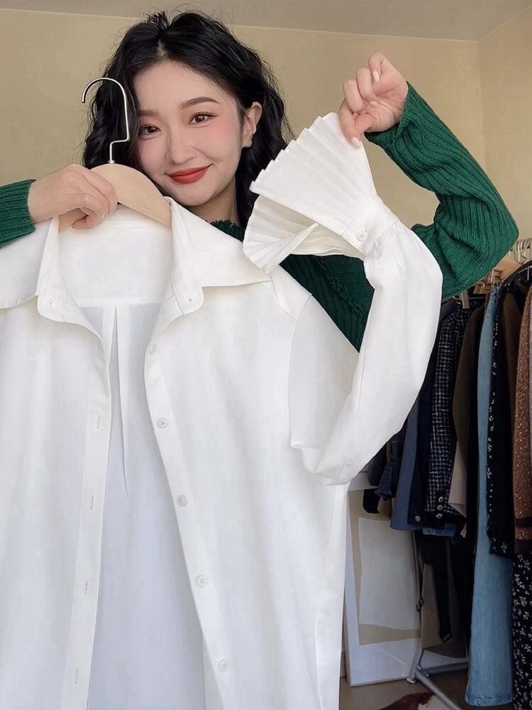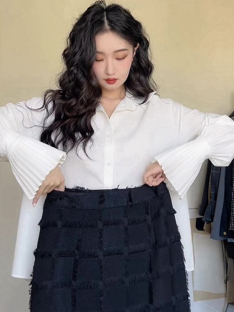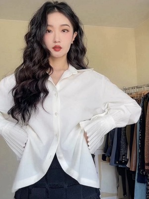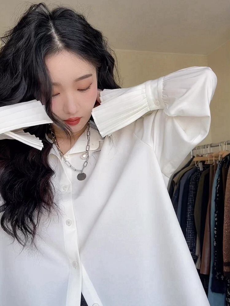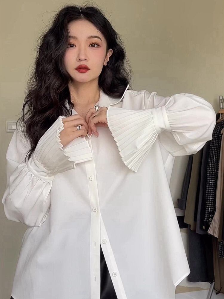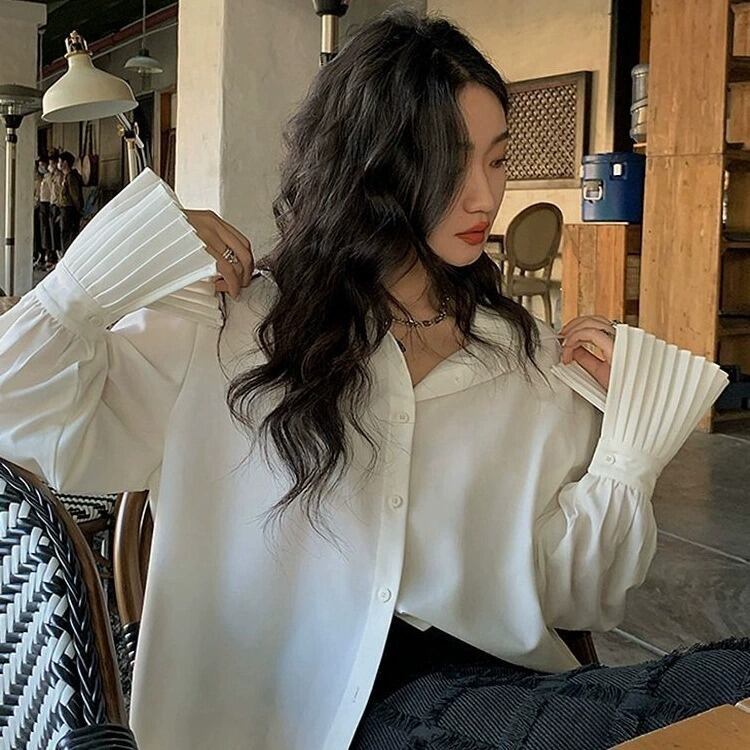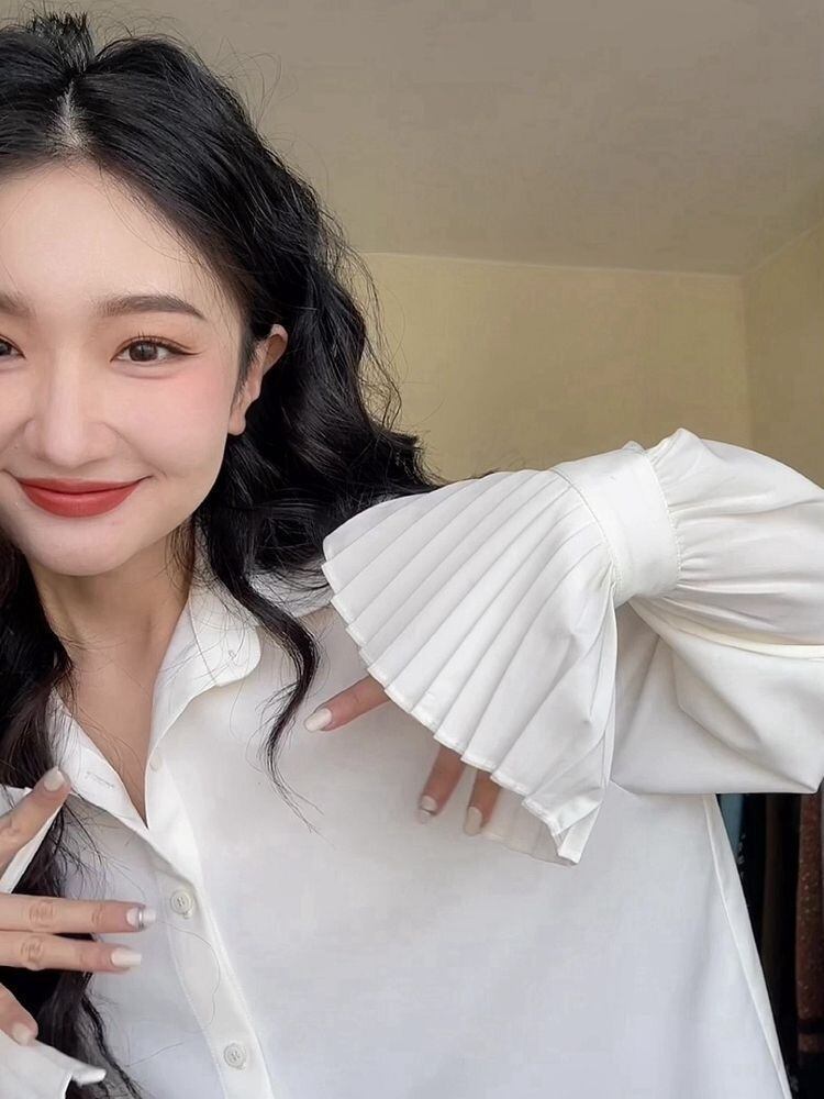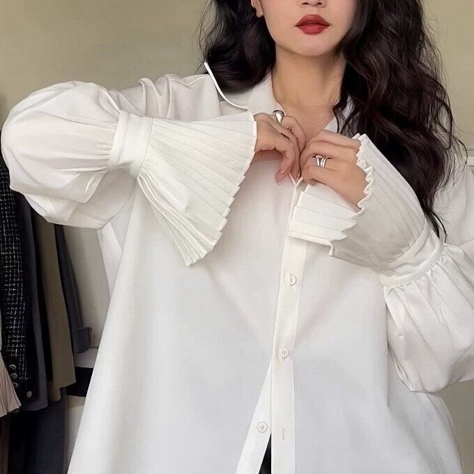 印象的なプリーツカフスが目を引く、ゆったりシルエットのフェミニンブラウスです。