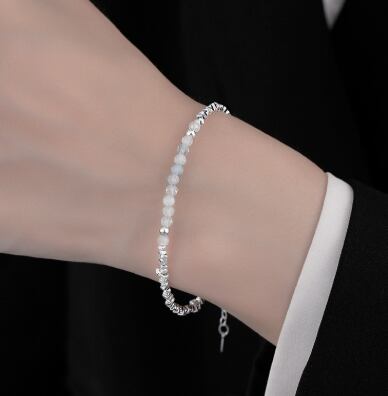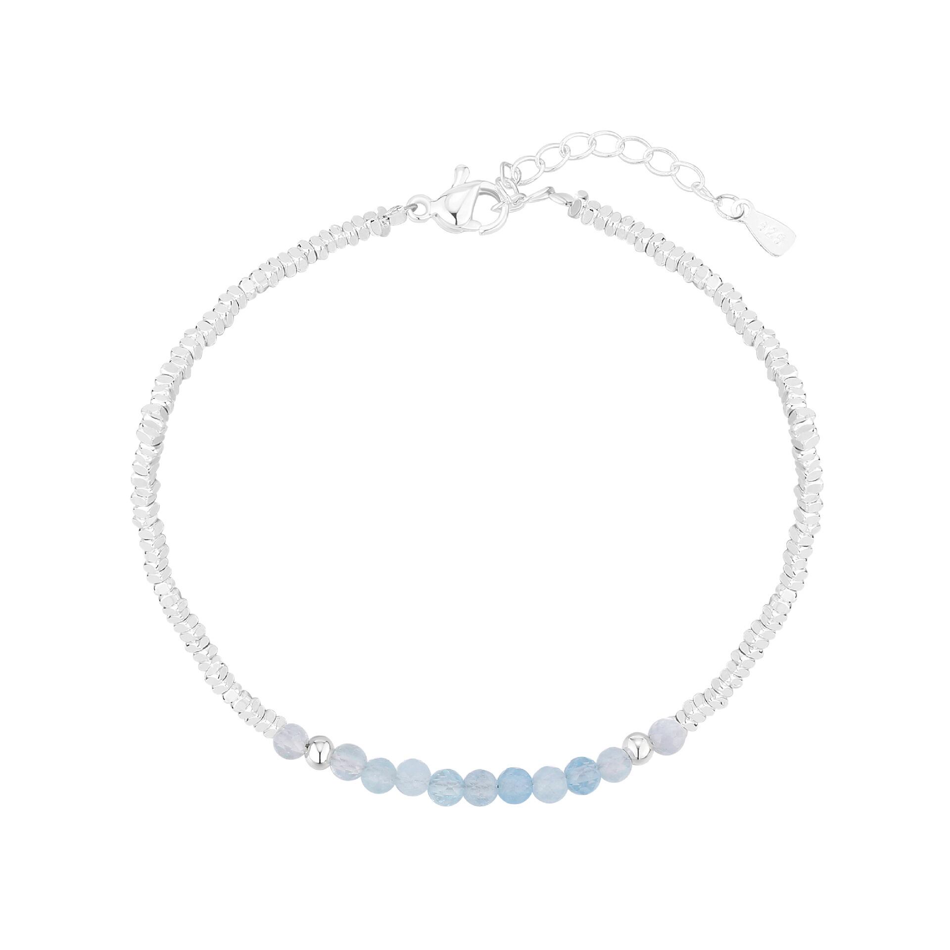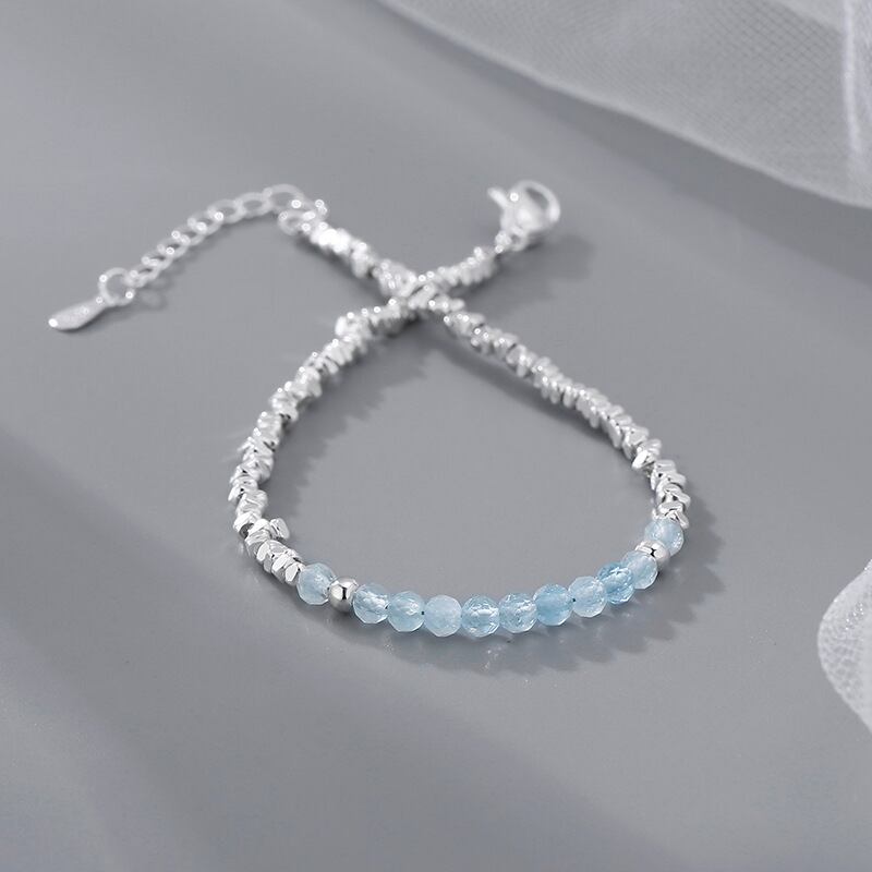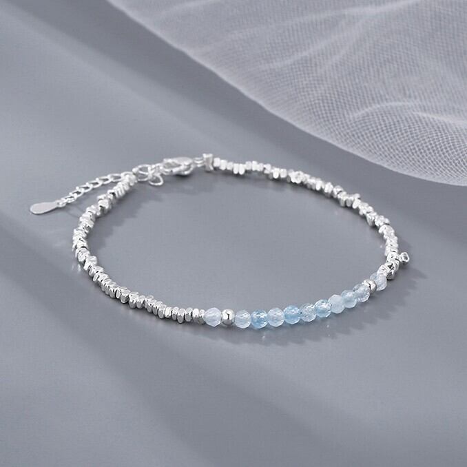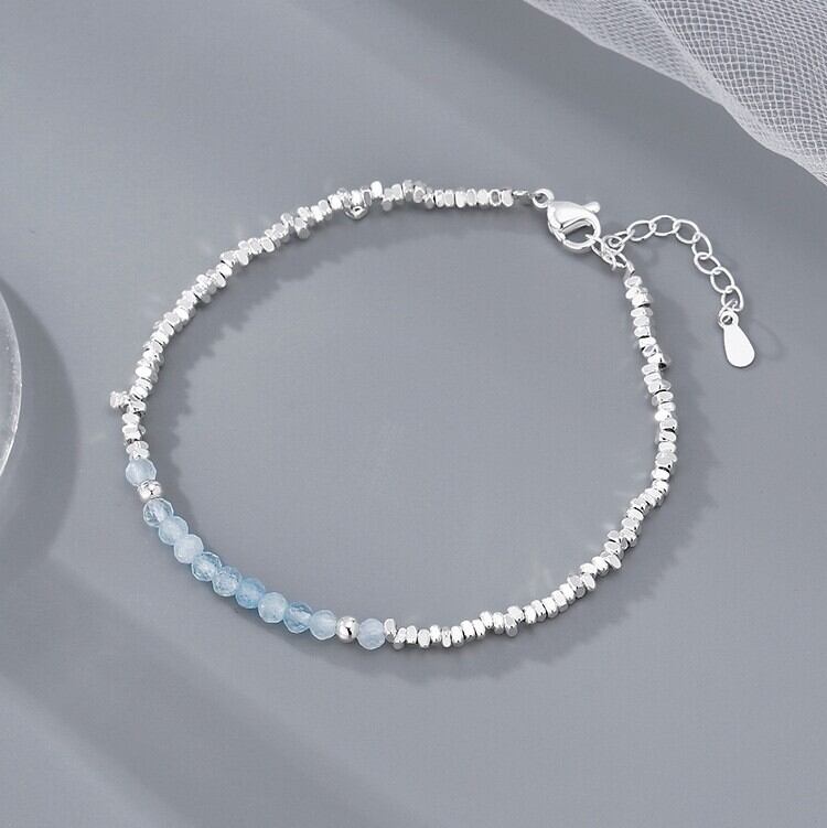 淡いブルーのビーズが涼しげに揺れる、繊細で上品なシルバーブレスレット。