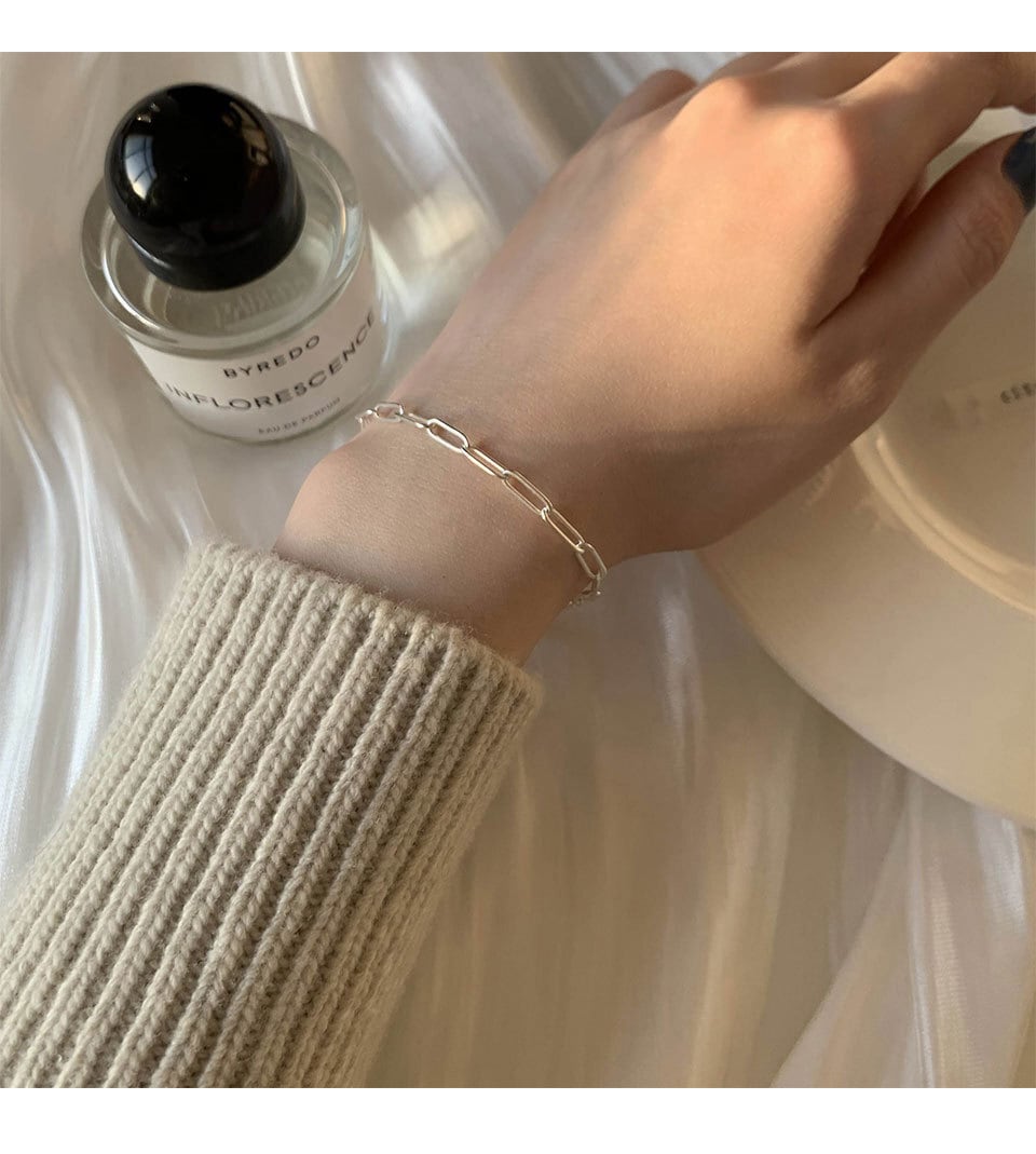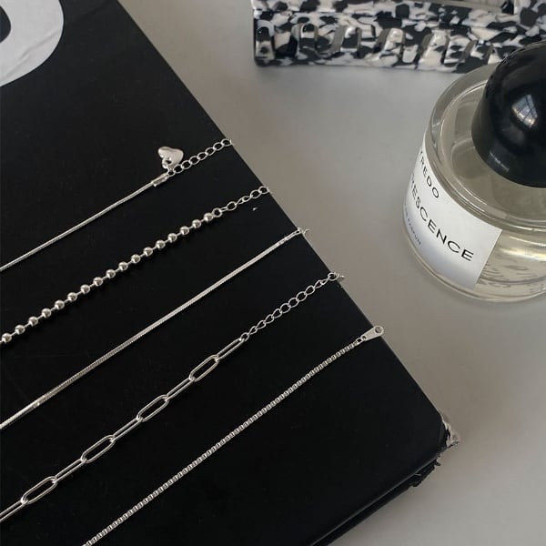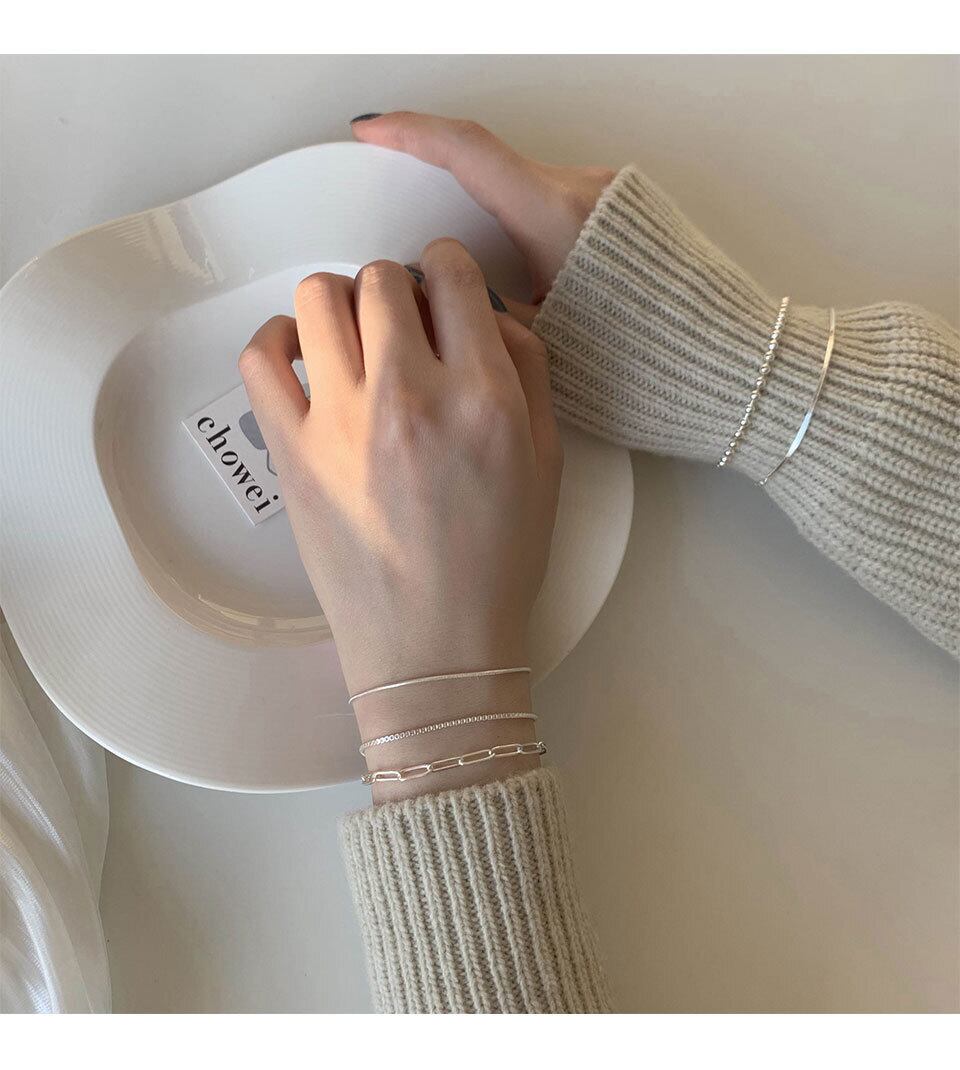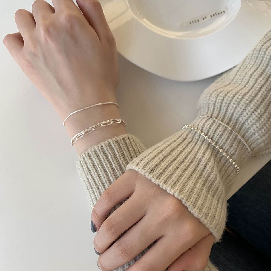 4種類のチェーンタイプからお好みでお選びいただける、シンプルな銀色のブレスレットで抜け感を演出。
