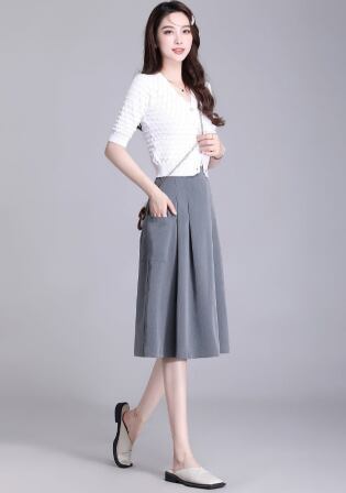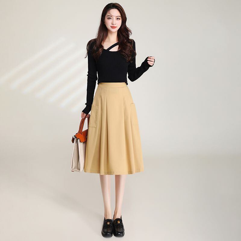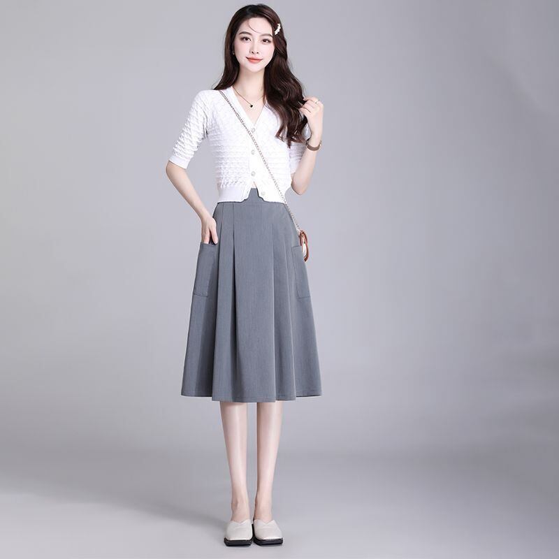 ひざ下丈のスカートが清楚な印象を与え、通勤やお出かけにもぴったりです。