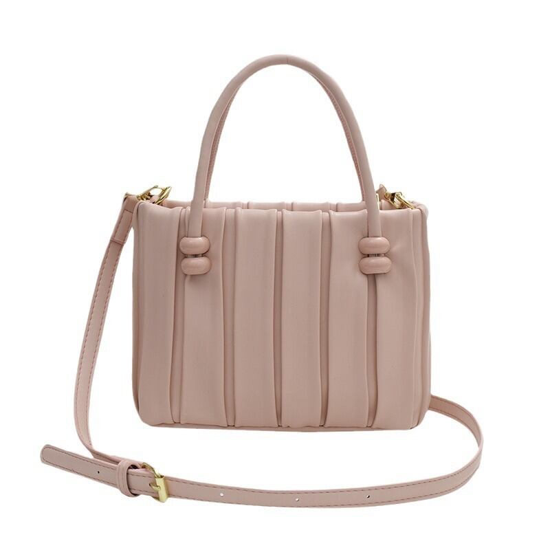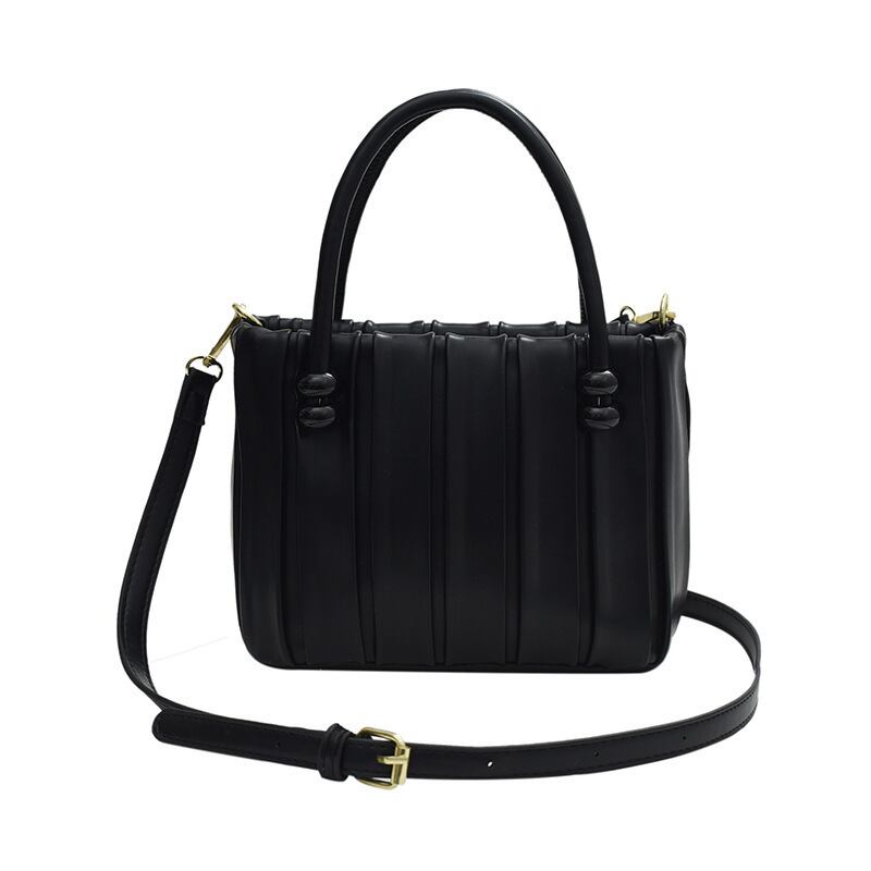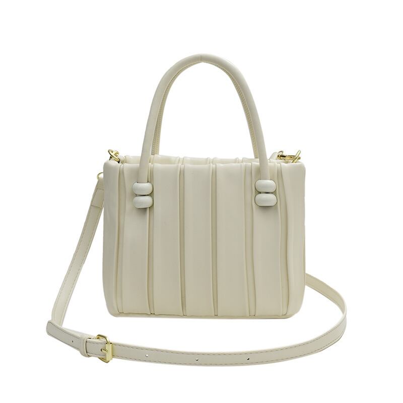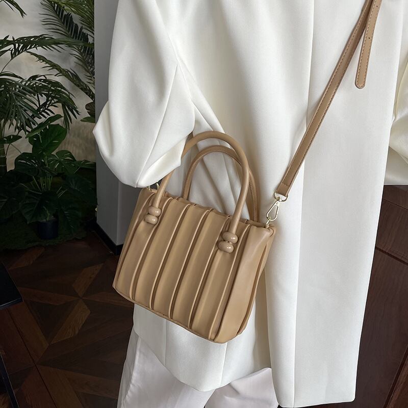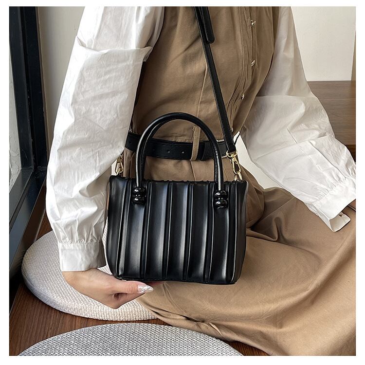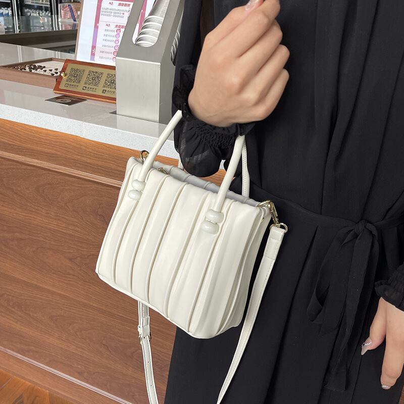 ハンドル付け根のビーズ装飾と縦のラインがスマートな印象を与える、上品見えするキルティング風ハンドバッグ。