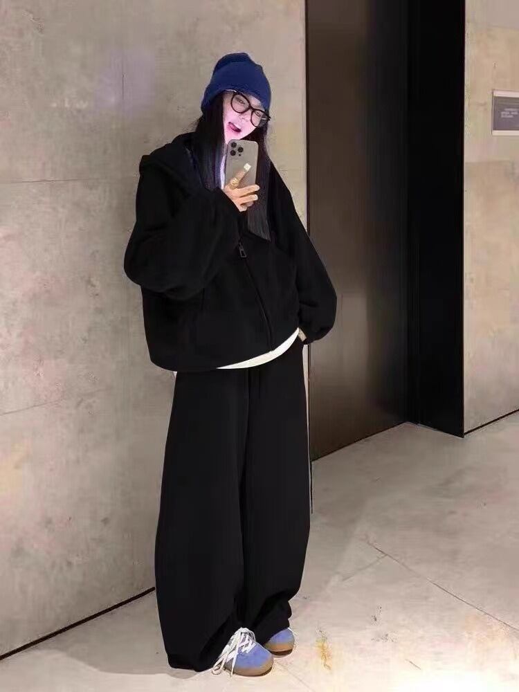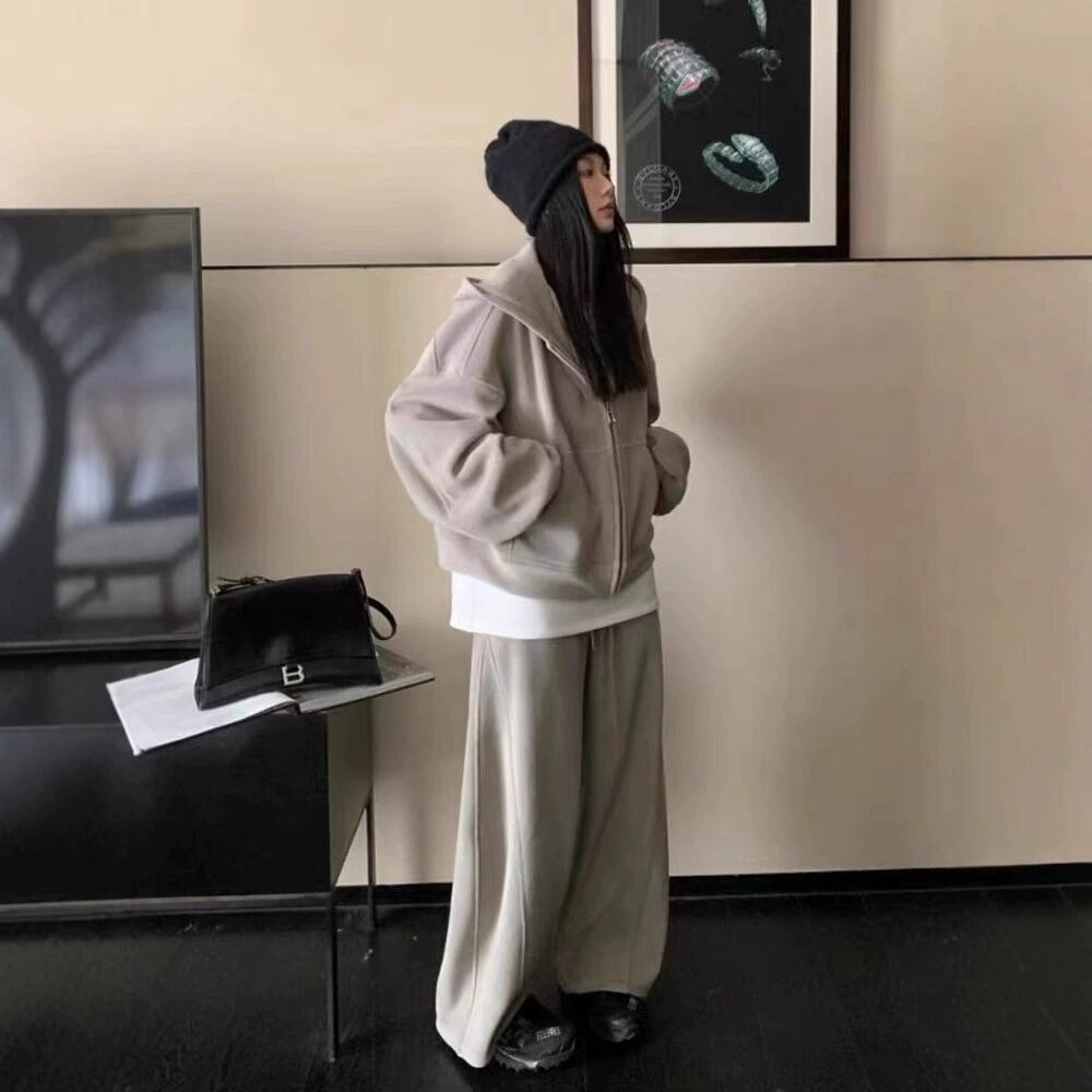 ファスナー仕様で羽織りやすく、ボトムスはストレートラインで脚長効果も抜群。