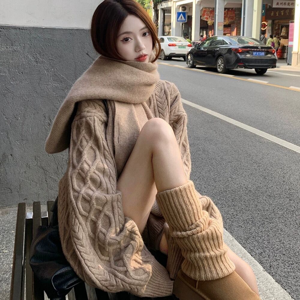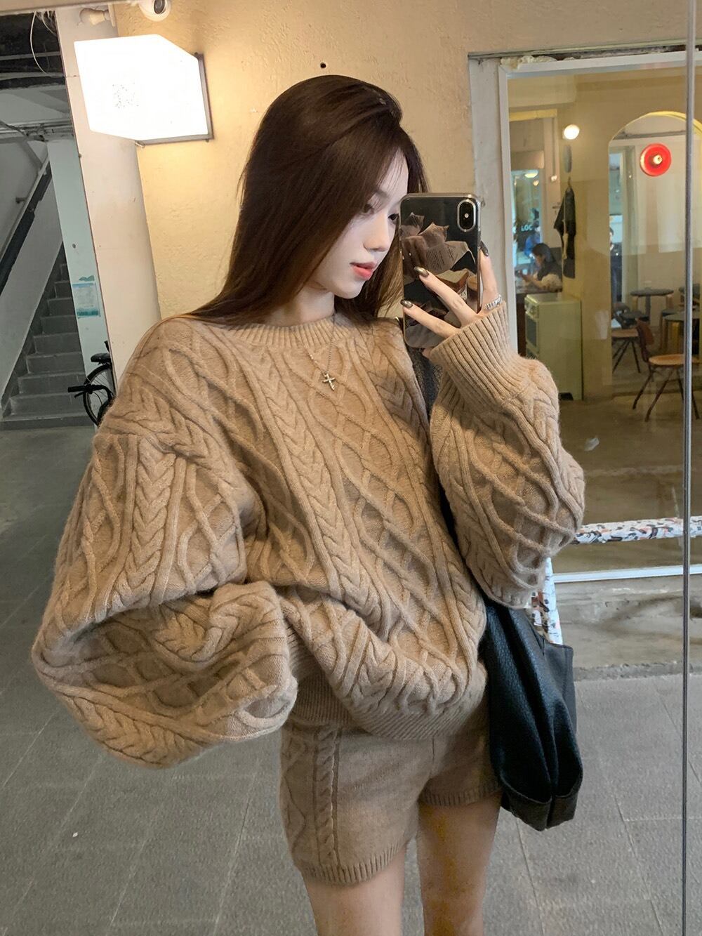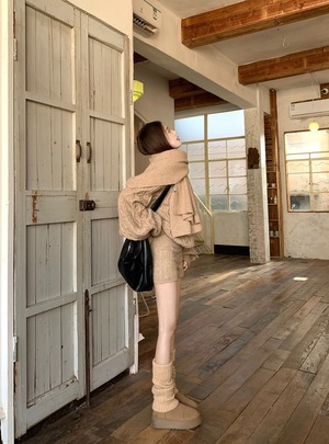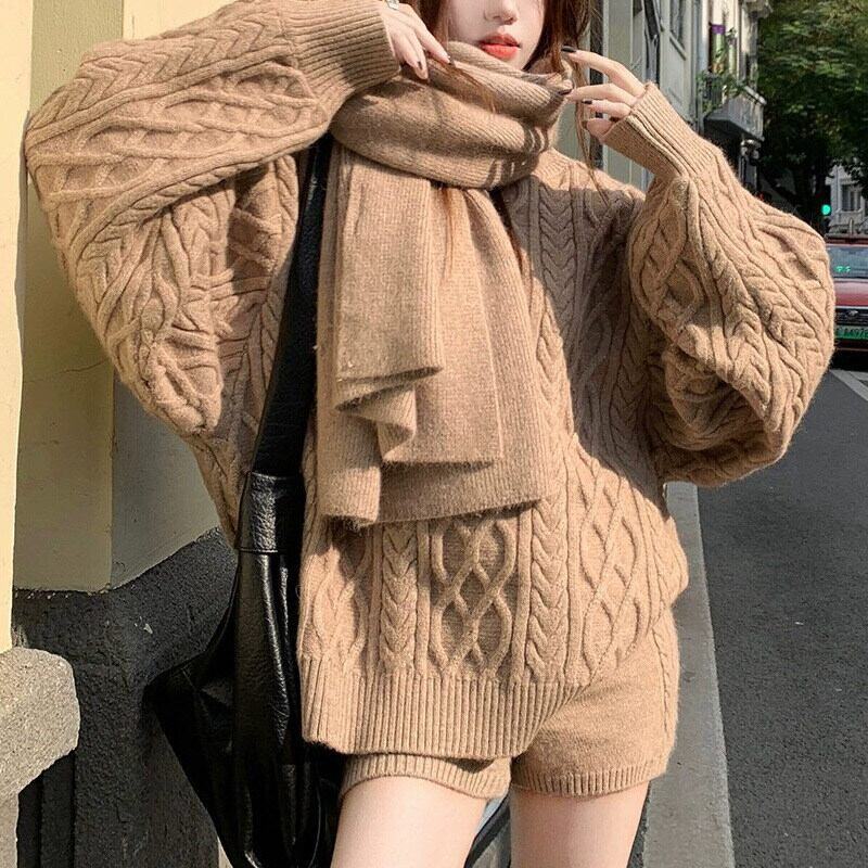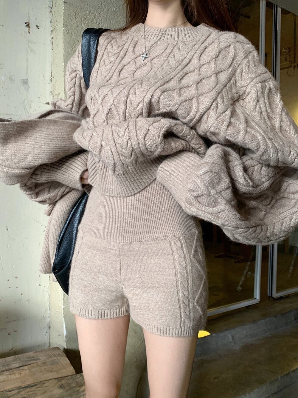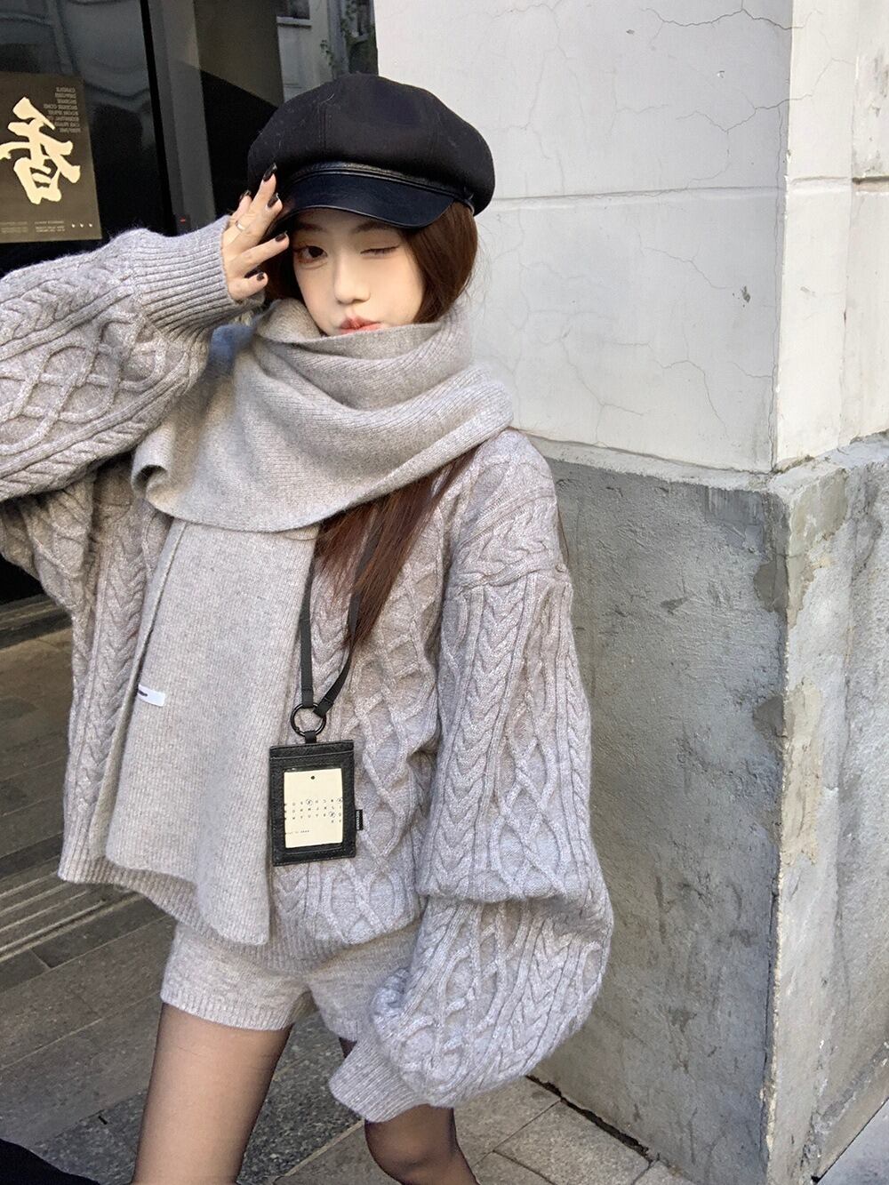 立体感のあるケーブル編みが目を惹く、秋冬にぴったりの3点セットニットアップです。
