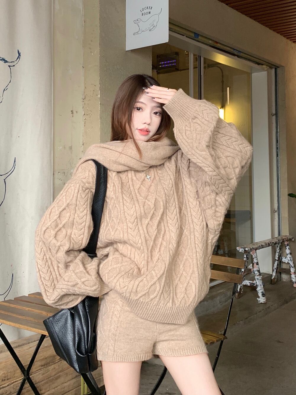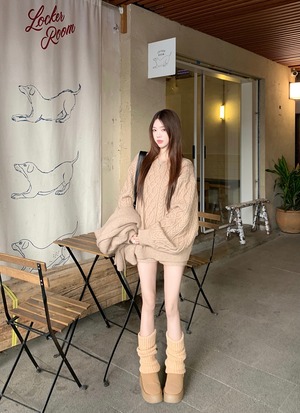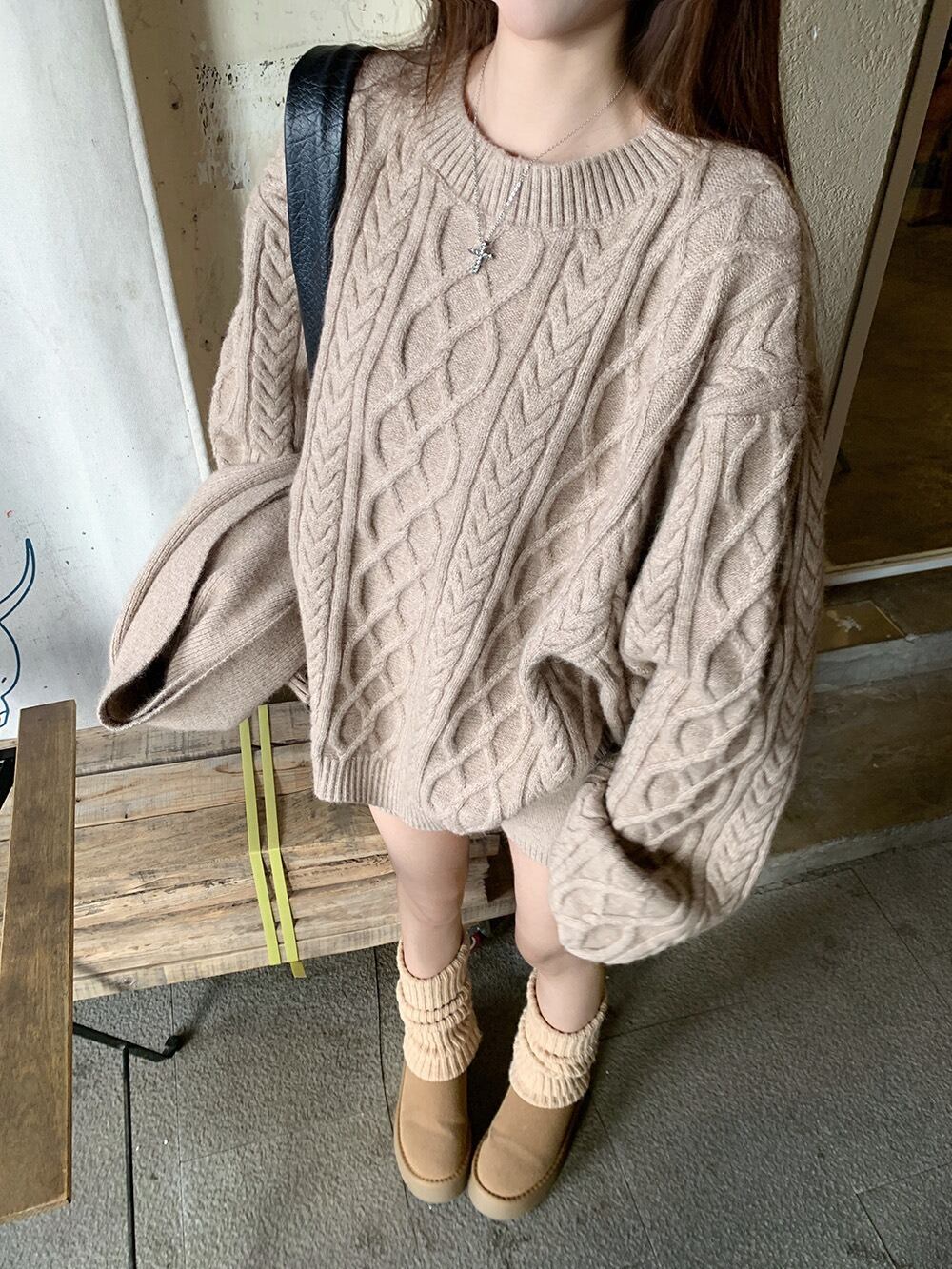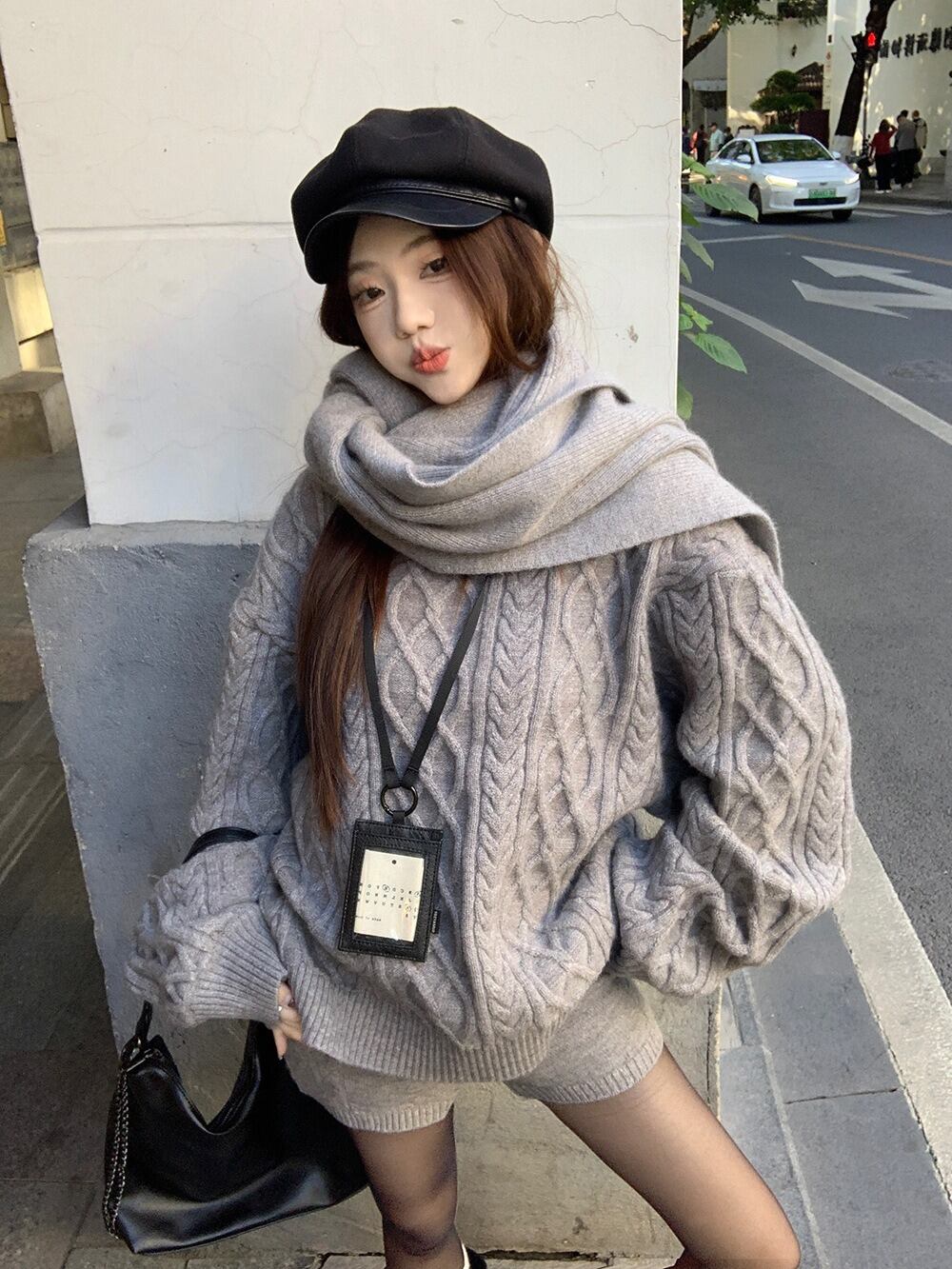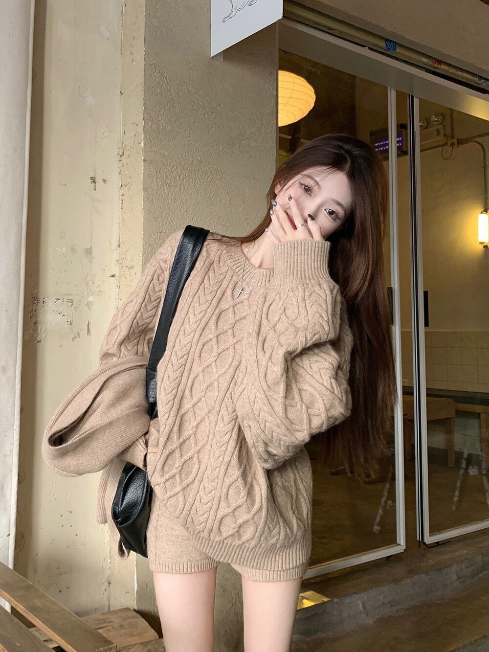立体感のあるケーブル編みが目を惹く、秋冬にぴったりの3点セットニットアップです。