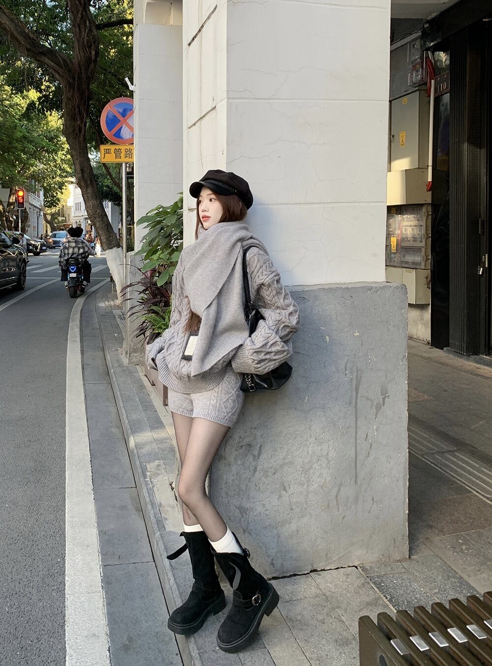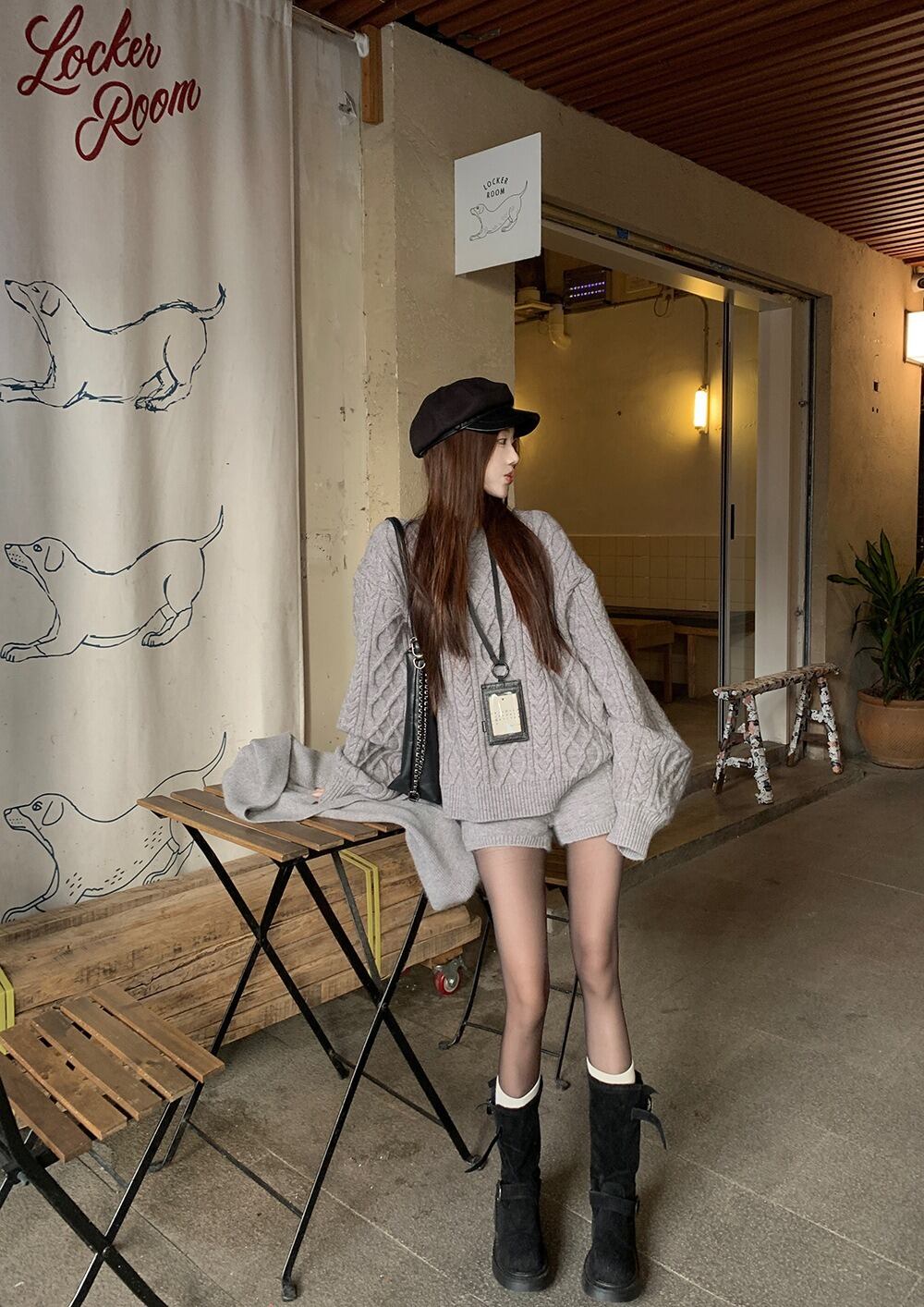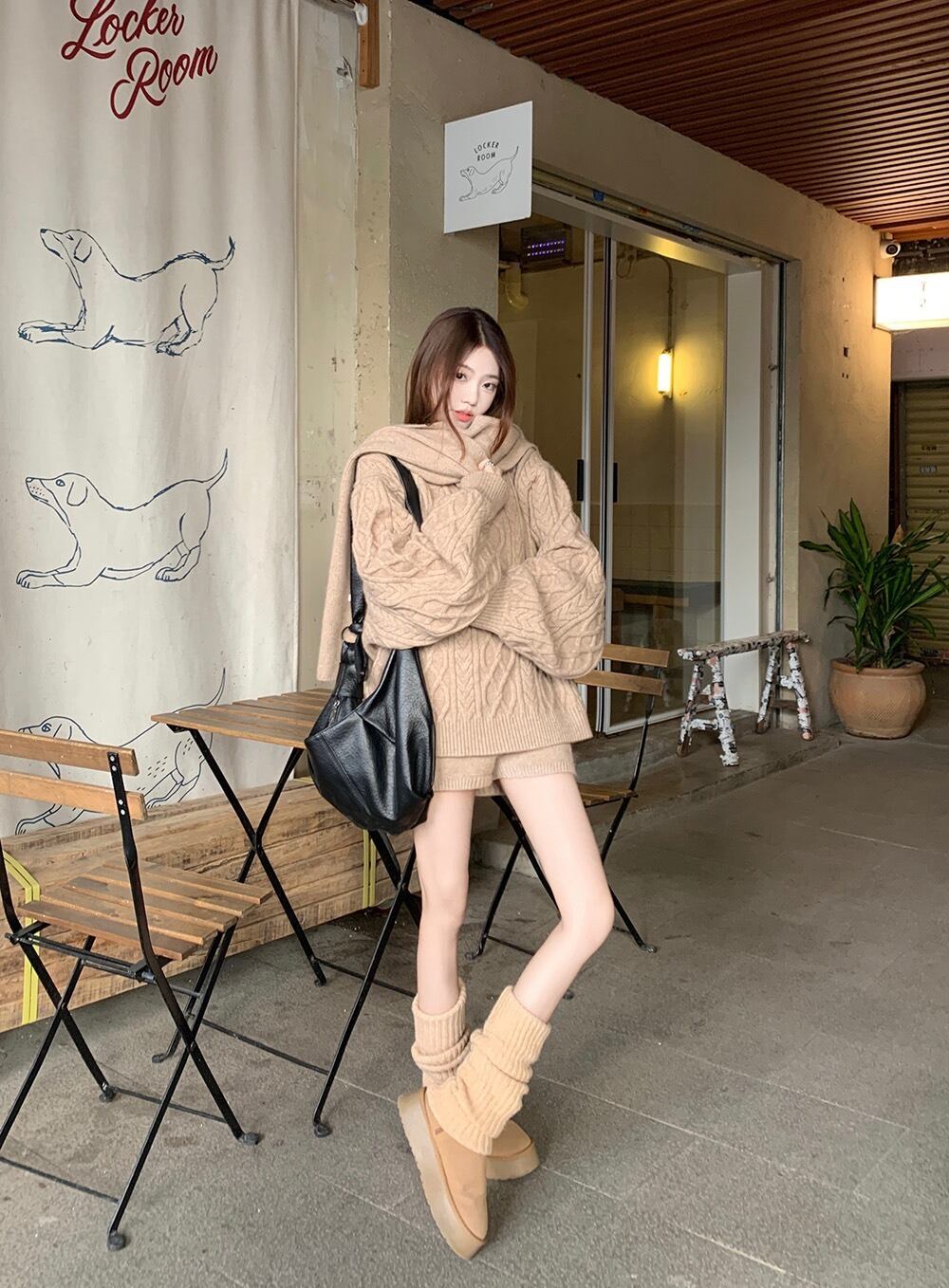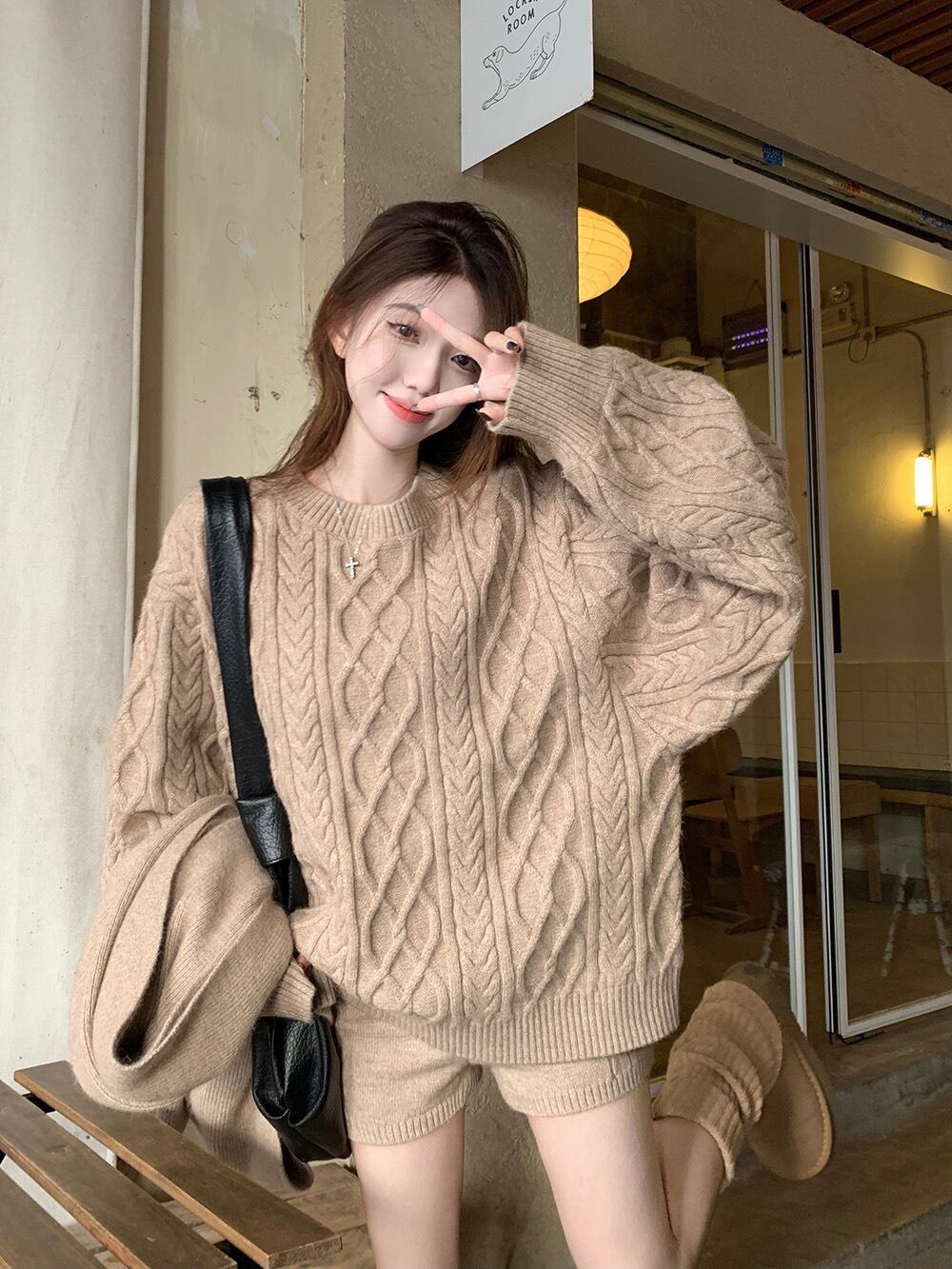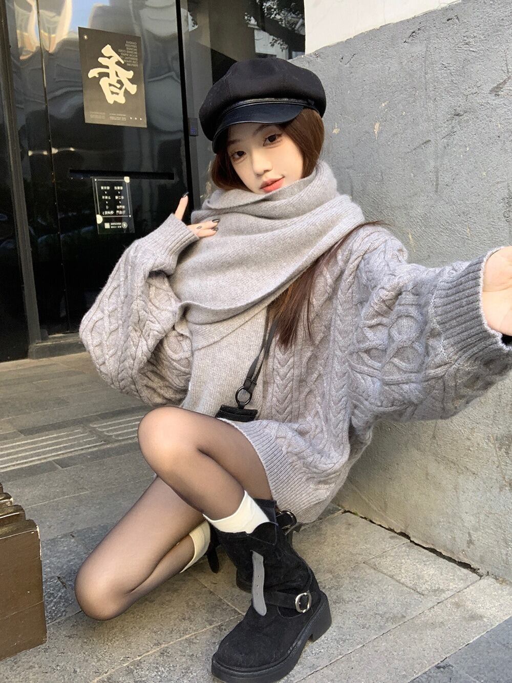 立体感のあるケーブル編みが目を惹く、秋冬にぴったりの3点セットニットアップです。