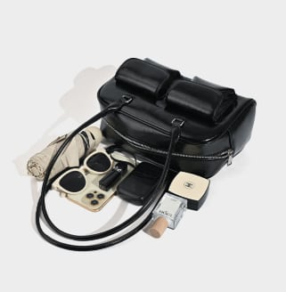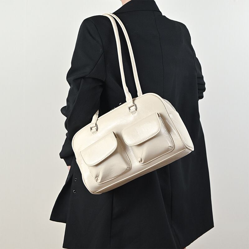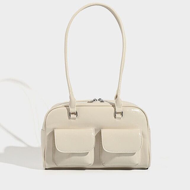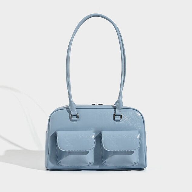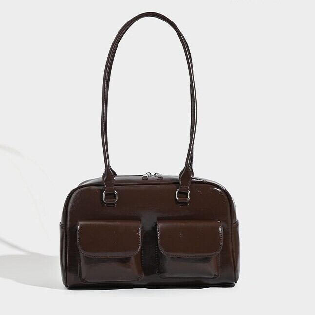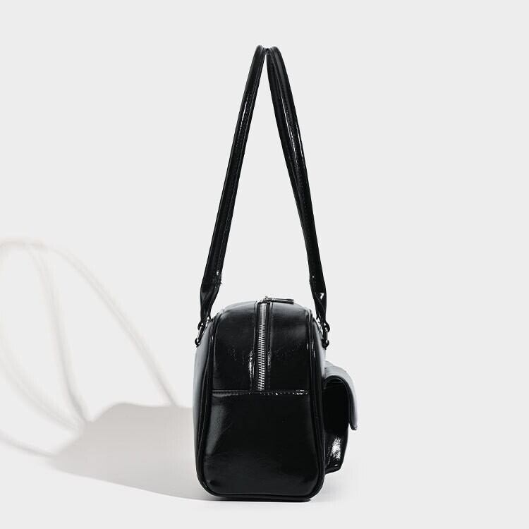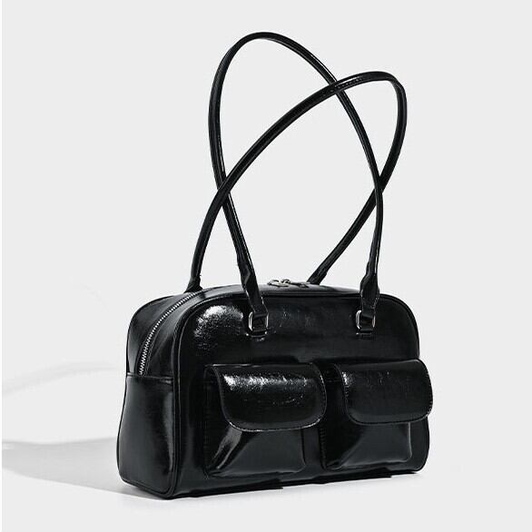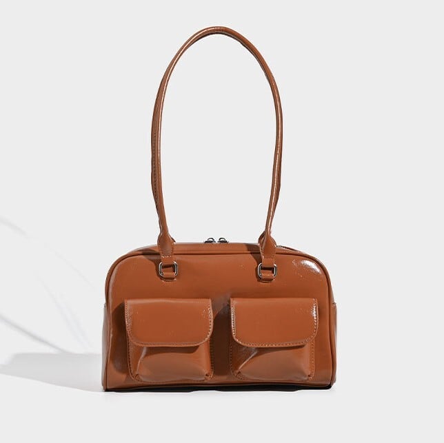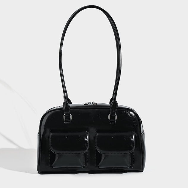 ツヤ感のある素材と立体的なダブルポケットが印象的な、上品ショルダーバッグ。