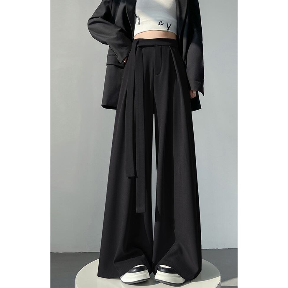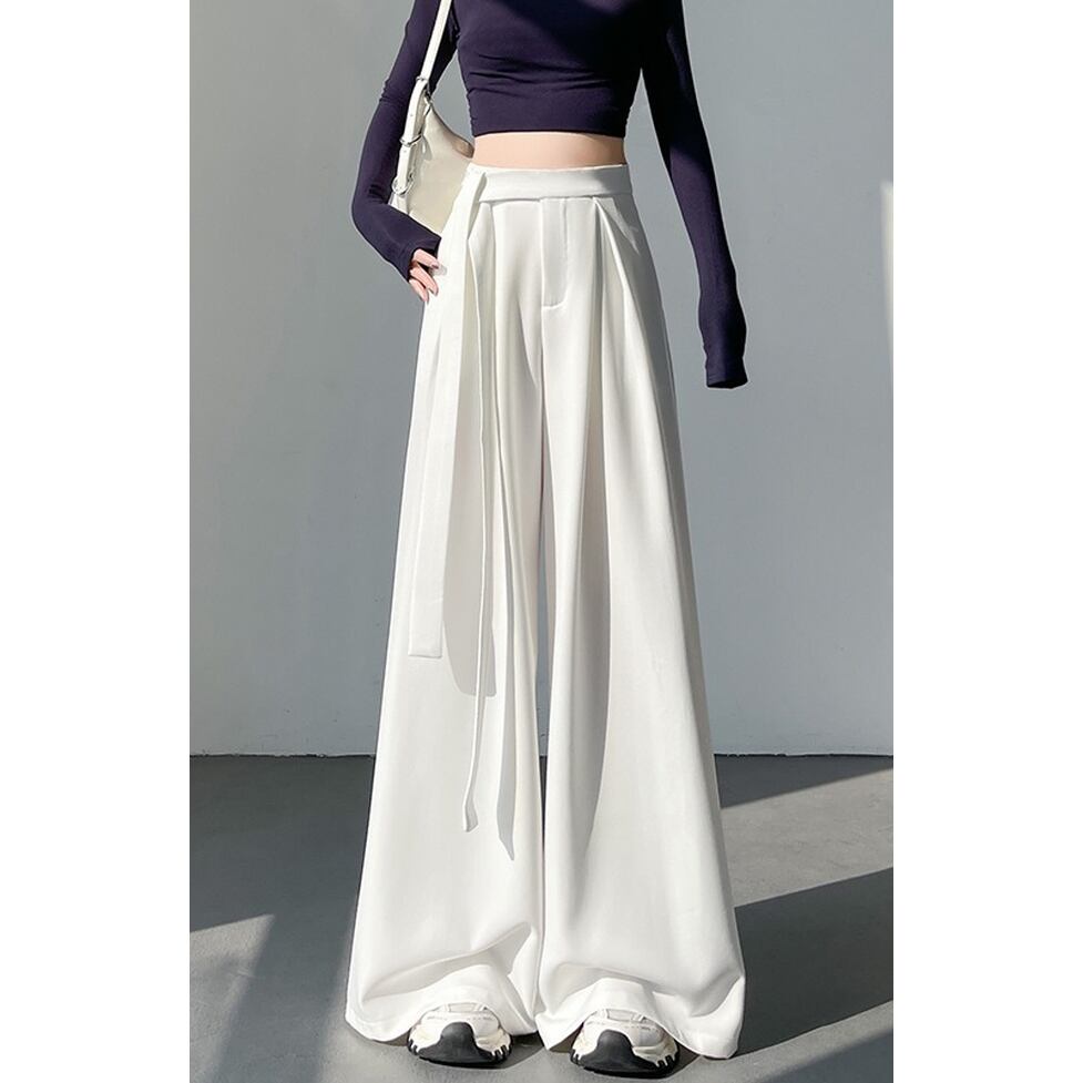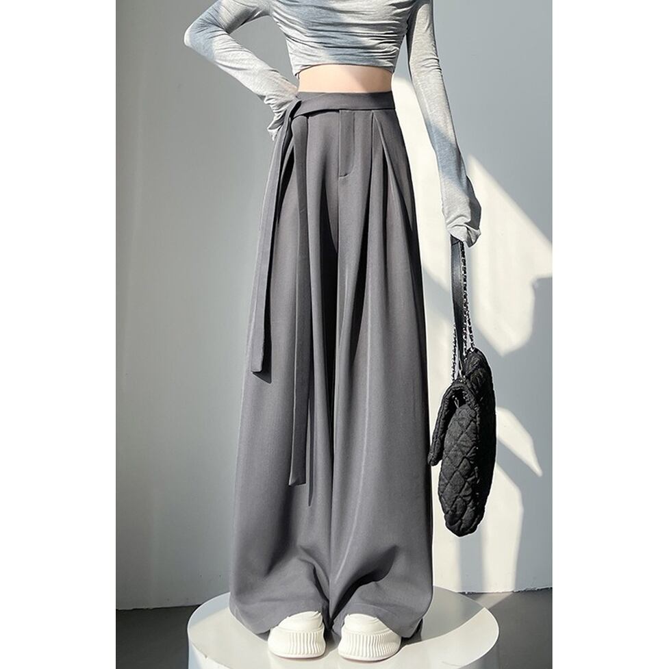 キュートなサイドリボンと裾に向かったボリューム叶触れるシルエットがポイントのワイドパンツ。