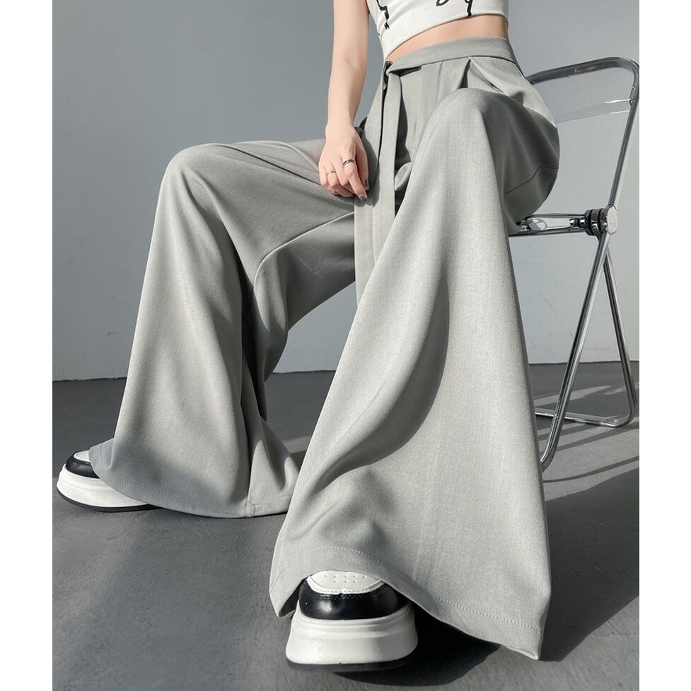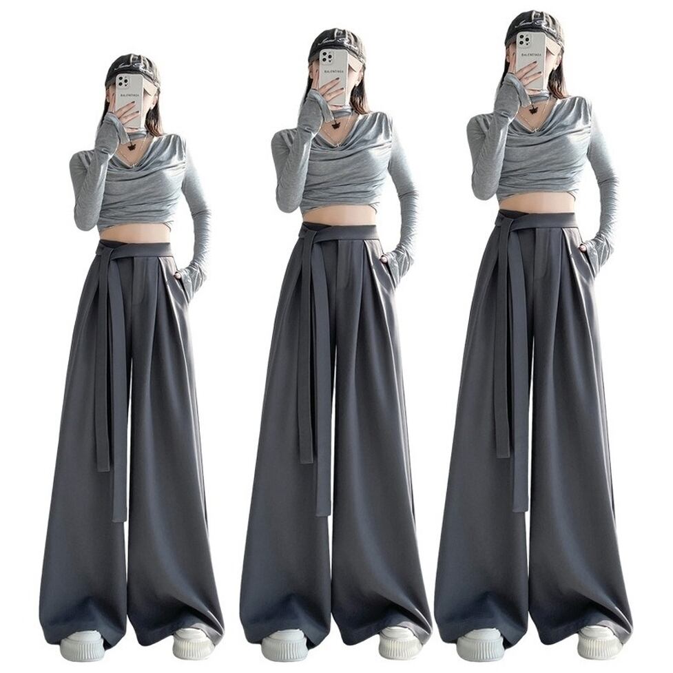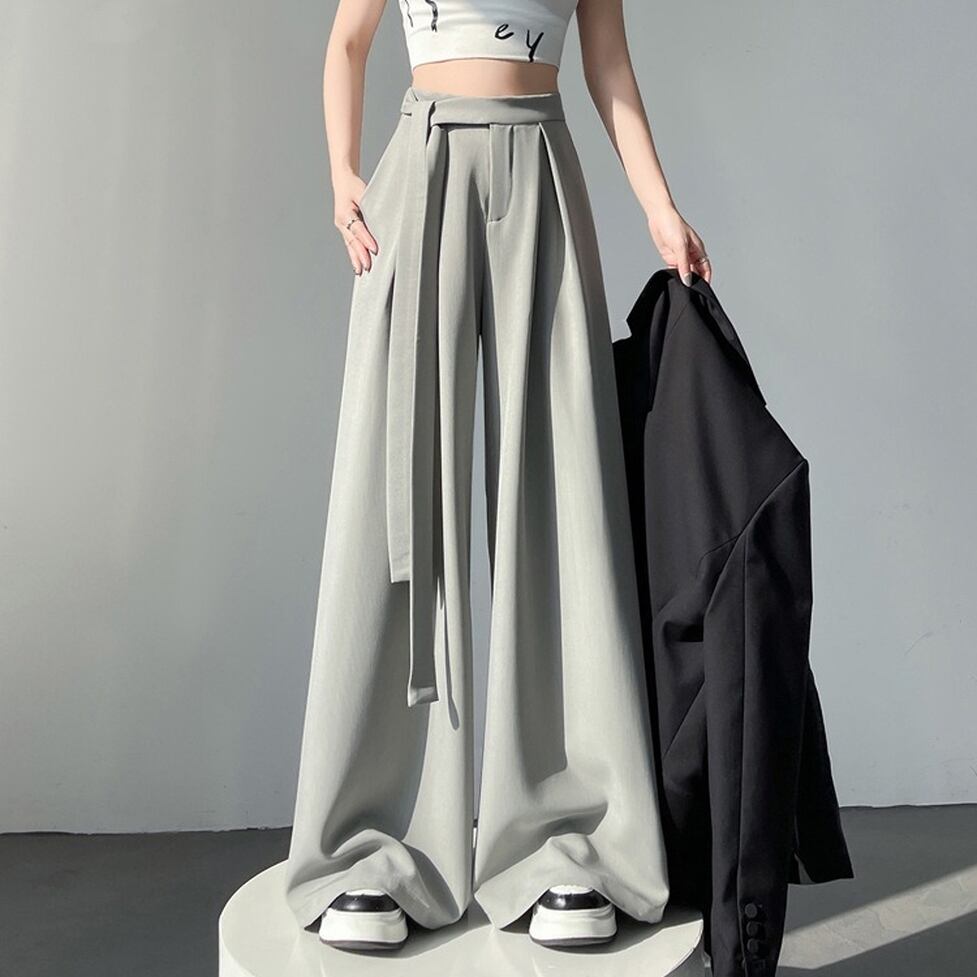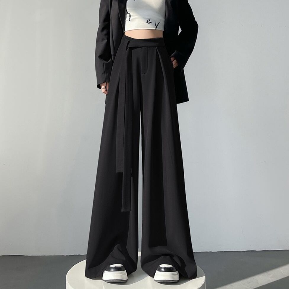 キュートなサイドリボンと裾に向かったボリューム叶触れるシルエットがポイントのワイドパンツ。