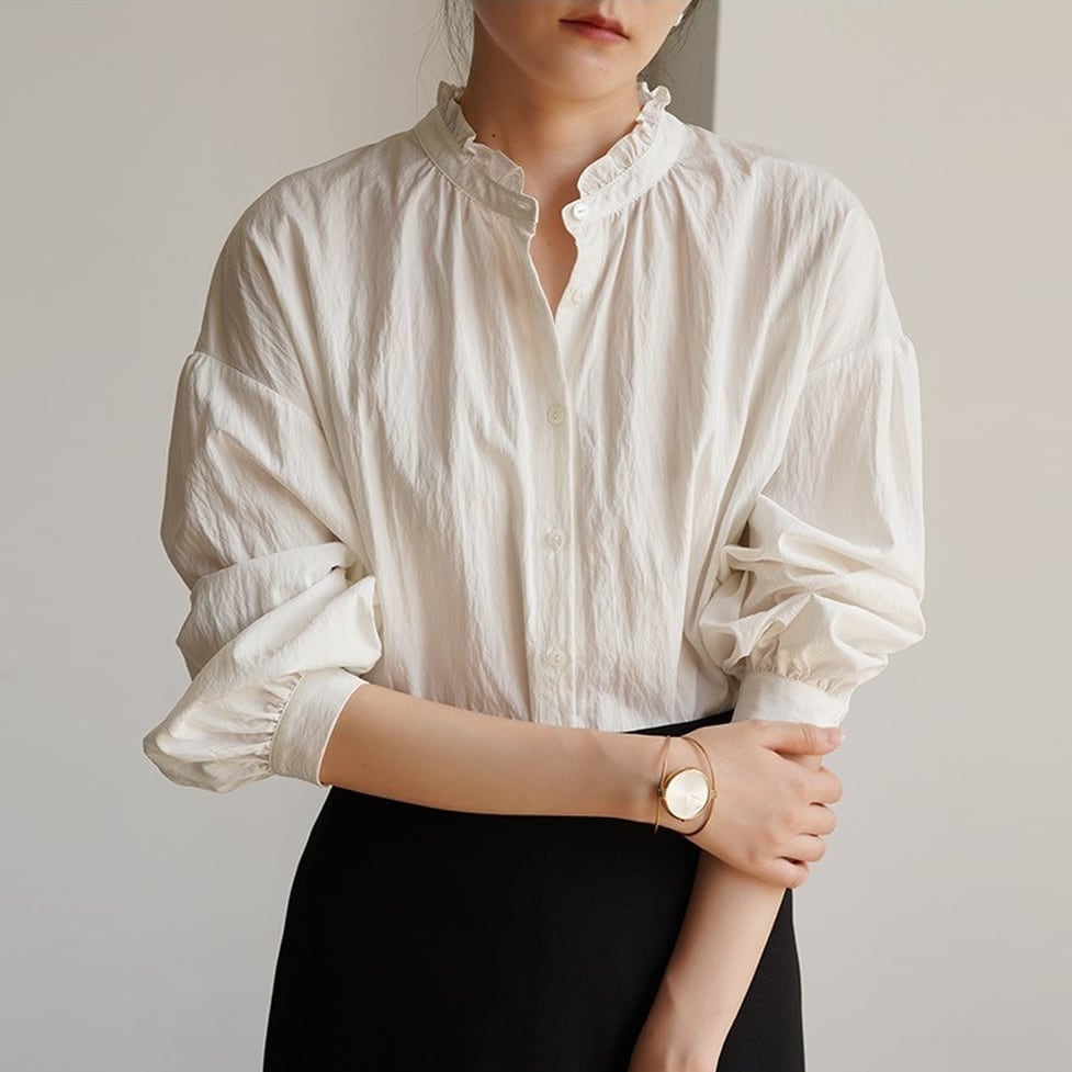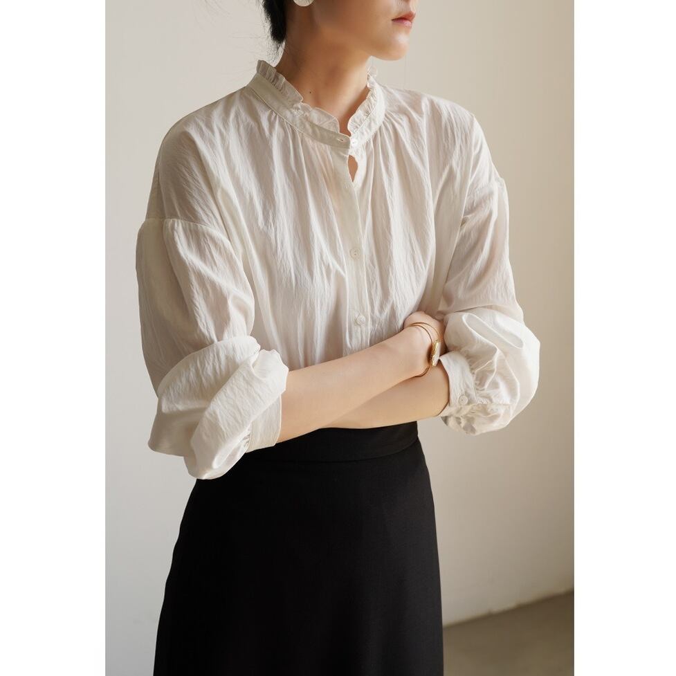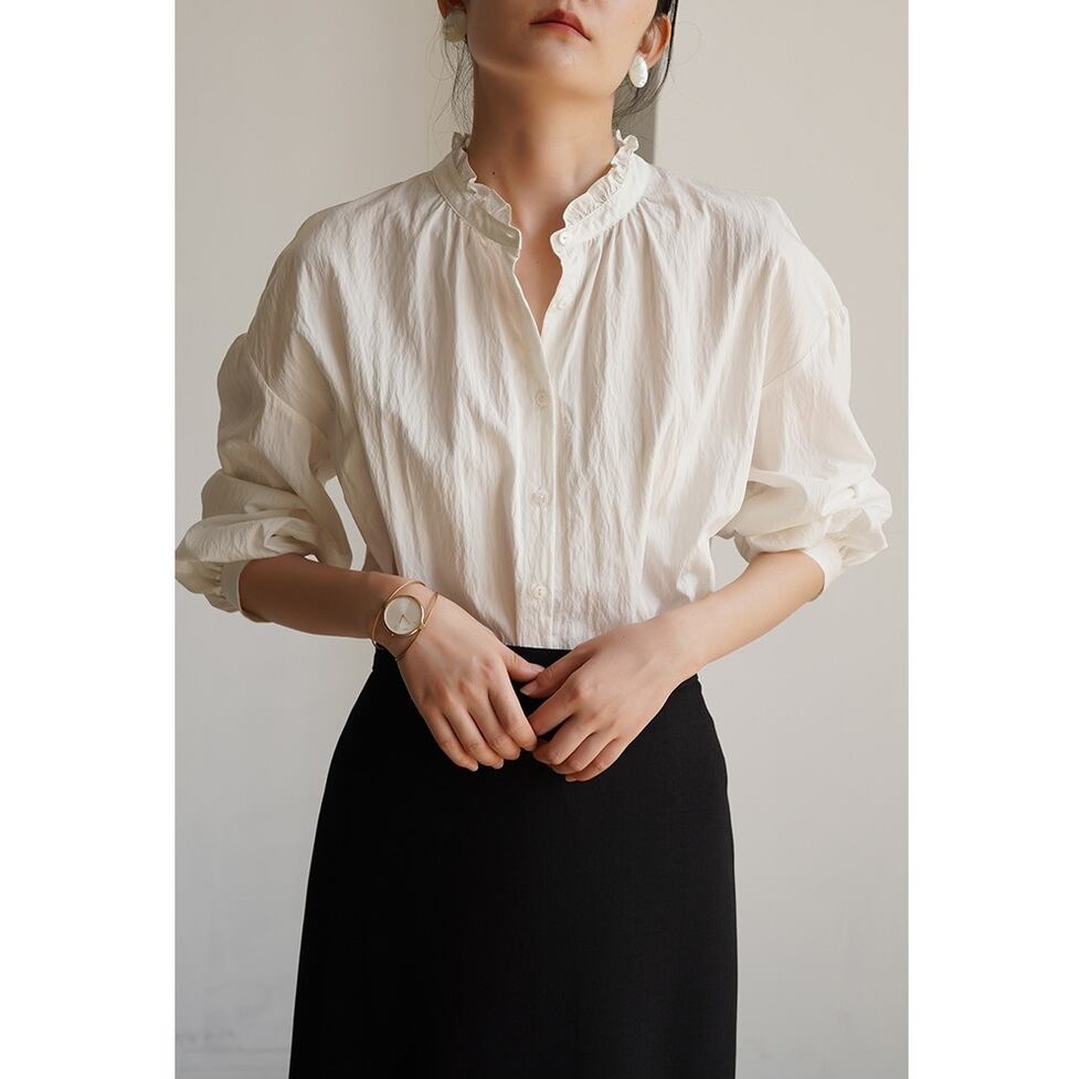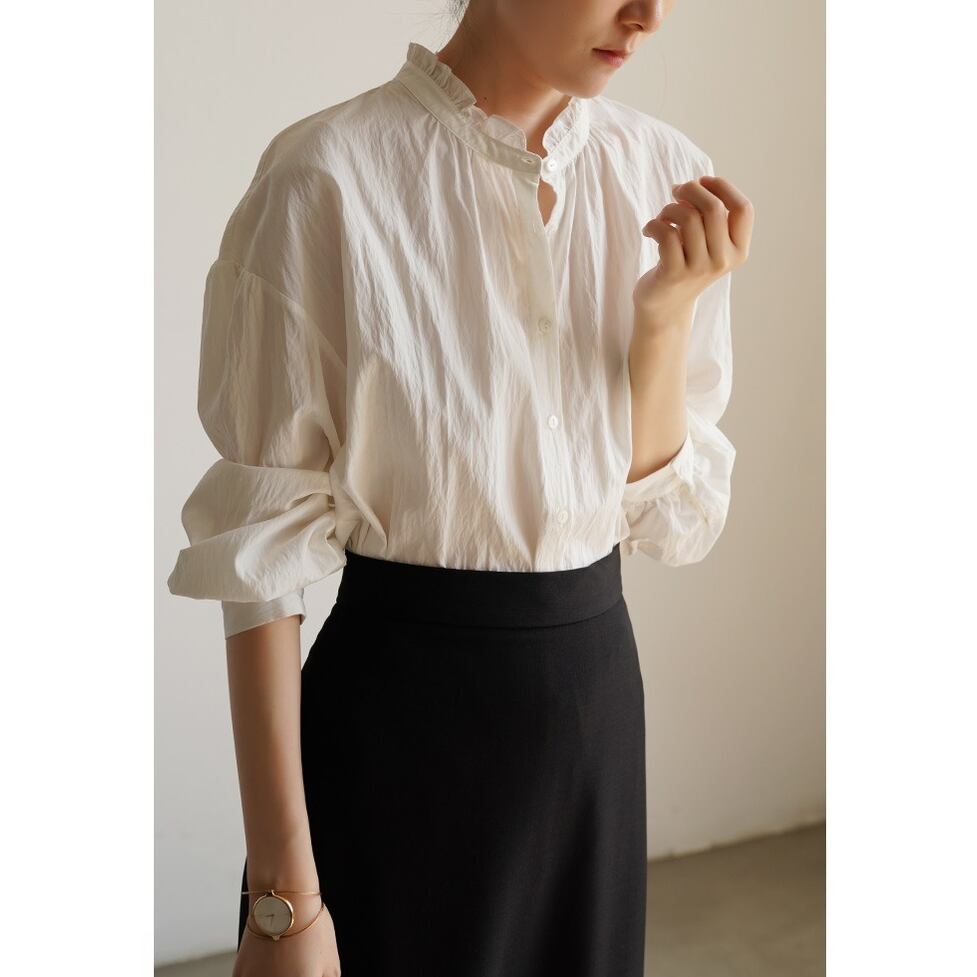 ナチュラルなリラクシー感とささやかなネックフリルの可愛らしさで着心地よく使えるシャツブラウス。
