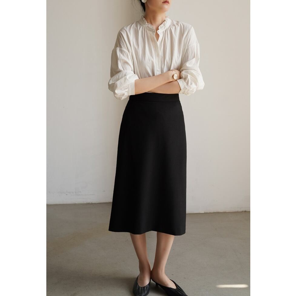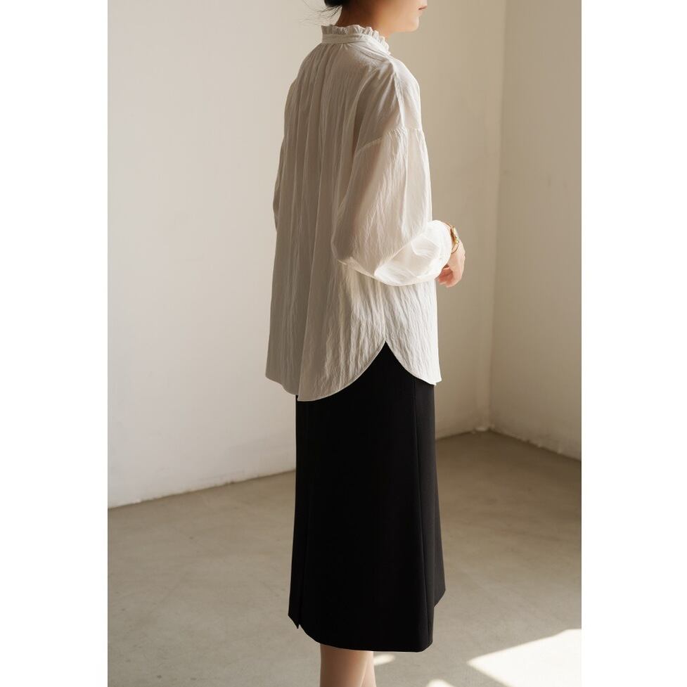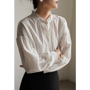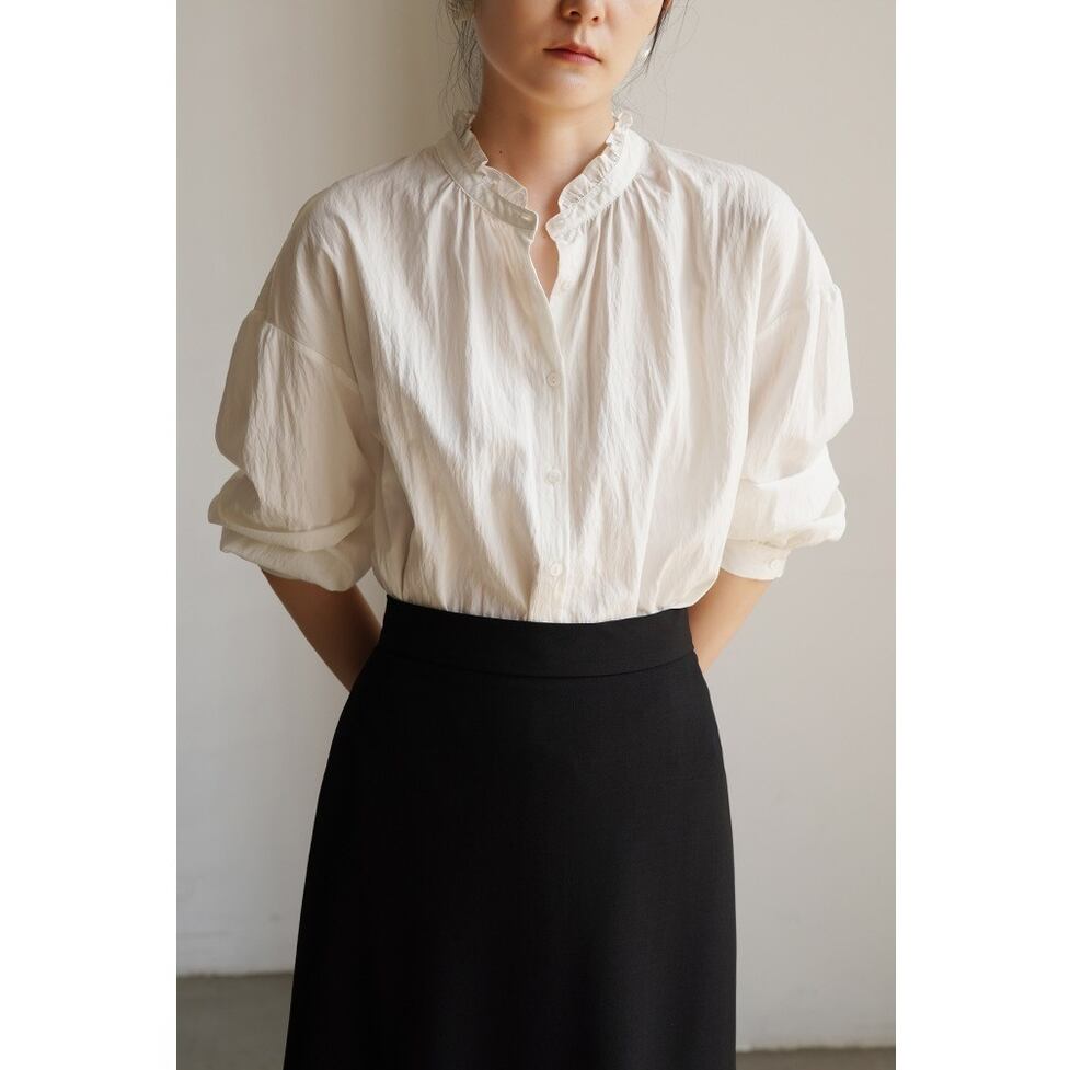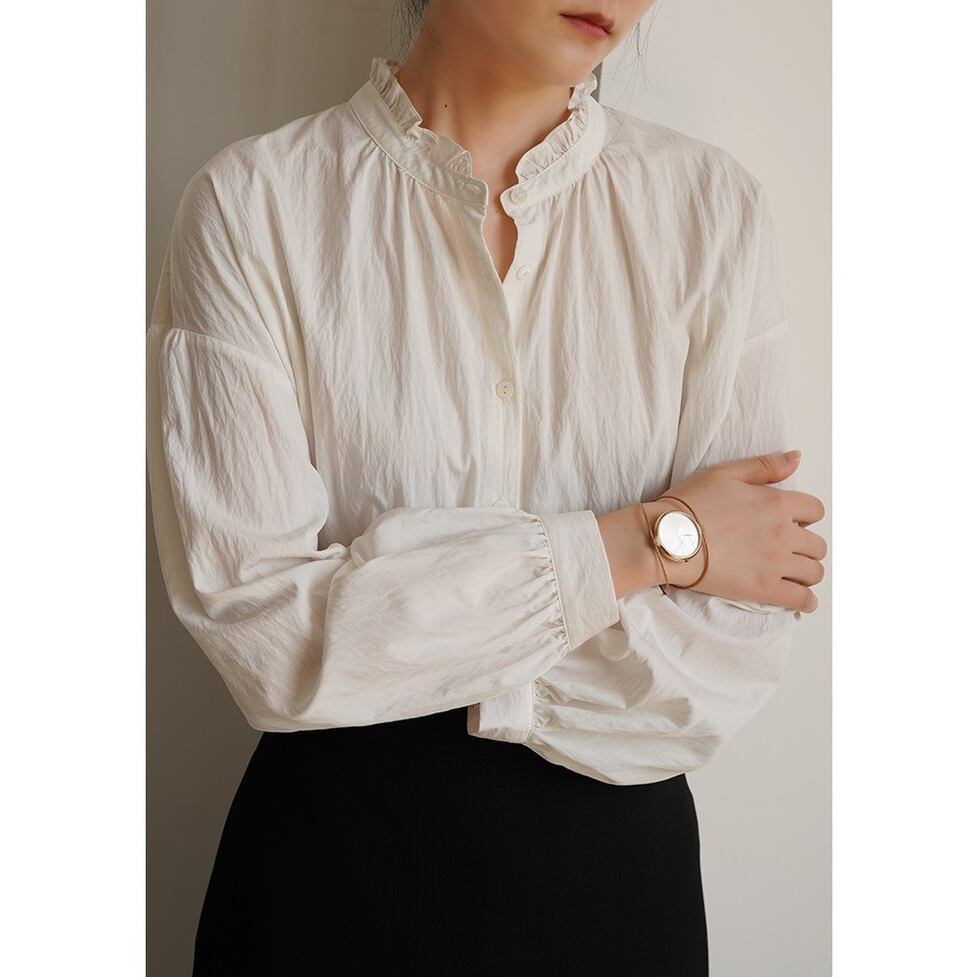 ナチュラルなリラクシー感とささやかなネックフリルの可愛らしさで着心地よく使えるシャツブラウス。